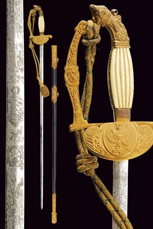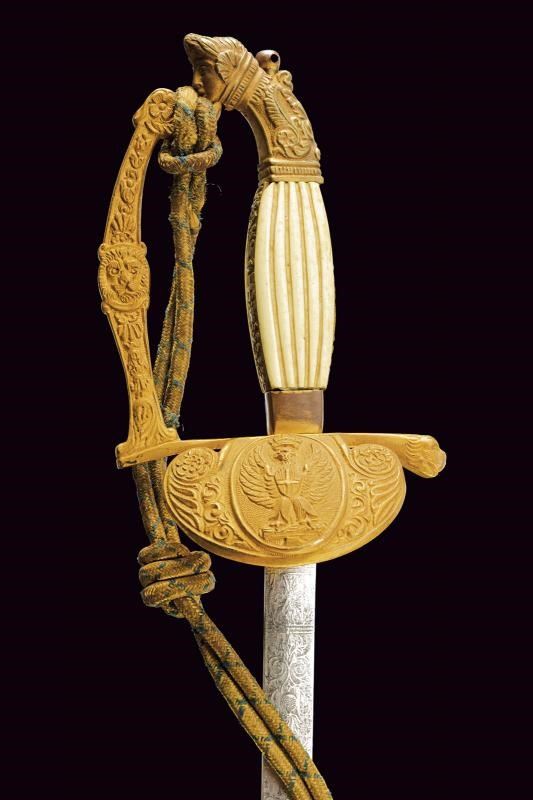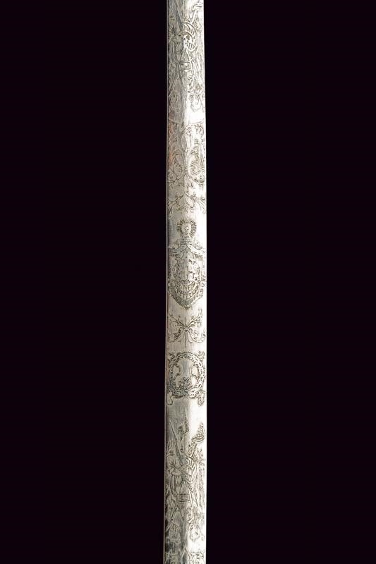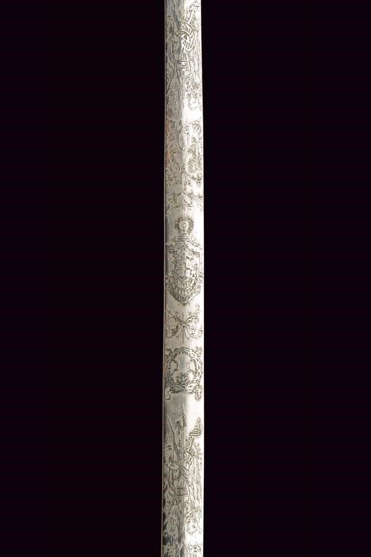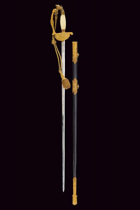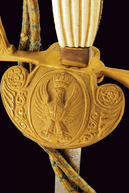 Lama dritta, incisa a racemi, trofei e con emblemi sabaudi. Fornimento in ottone dorato, pelta con aquila sabauda coronata su fascio littorio in rilievo. Guancette scanalate, color bianco. Fodero in cuoio con fornimenti in ottone. Due campanelle.