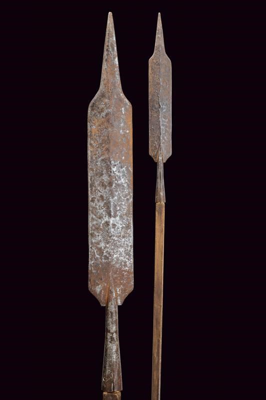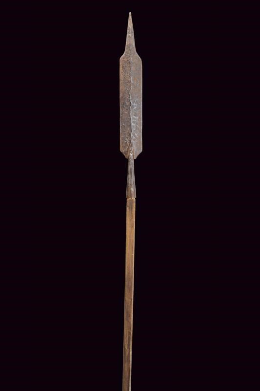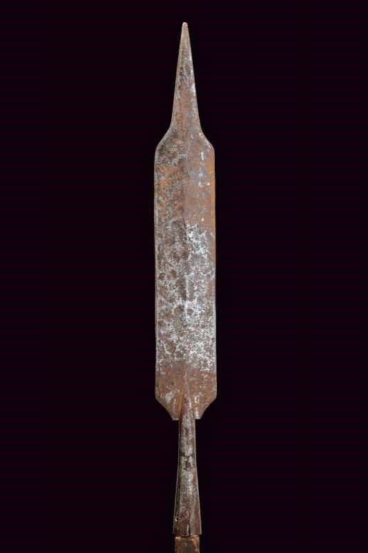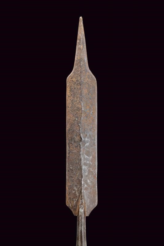 Ferro ad ampia lama con tipica punta rastremata, poi con due fili paralleli, sfogliatura su una faccia. Gorbia troncoconica con sforature. Asta lignea non pertinente, di produzione più tarda.