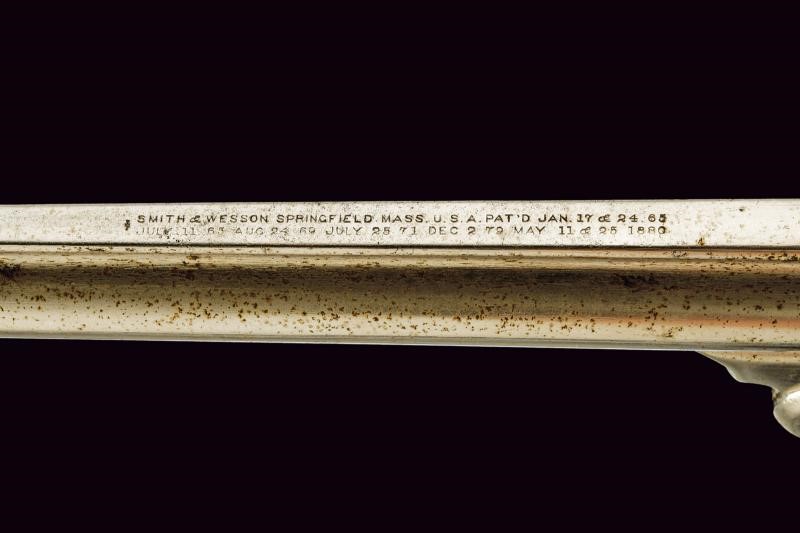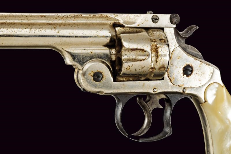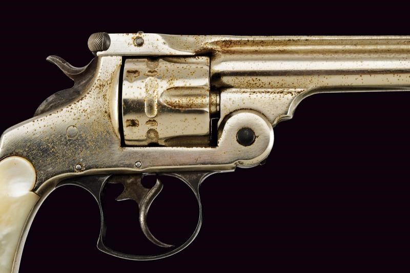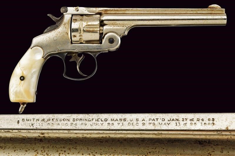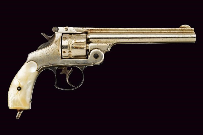 Canna tonda rigata da 6-1/2", con bindella recante marcatura della ditta e brevetti sino al 1880. Calibro probabilmente 44 Russian. Rigatura visibile, anima con un po' di incrostazioni da pulire. tamburo a sei colpi con doppia serie di arresti. Meccanica funzionante in azione mista. Cane, grilletto e ponticello con resti di tartarugatura. Matricola coeva su canna, gancetto e tamburo "22xxx", non presente sull'impugnatura. finitura nichelata probabilmente rinfrescata. Qualche segno d'uso e del tempo. Stato di conservazione da medio a buono. Guancette in madreperla. Anello porta correggiolo.