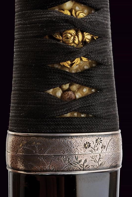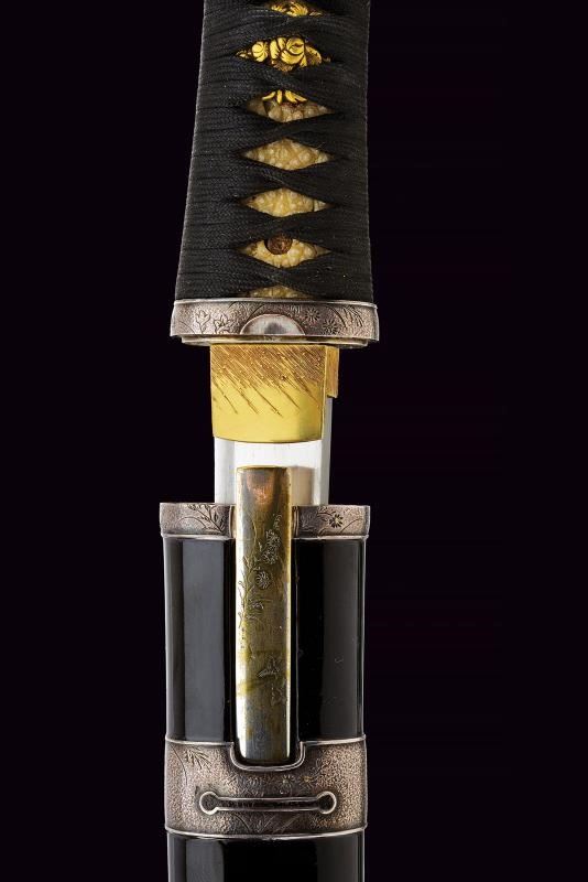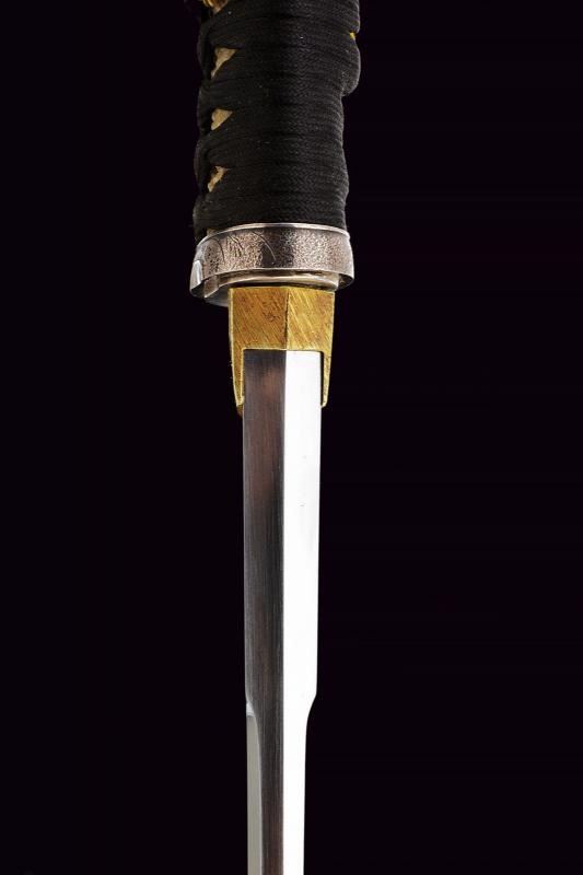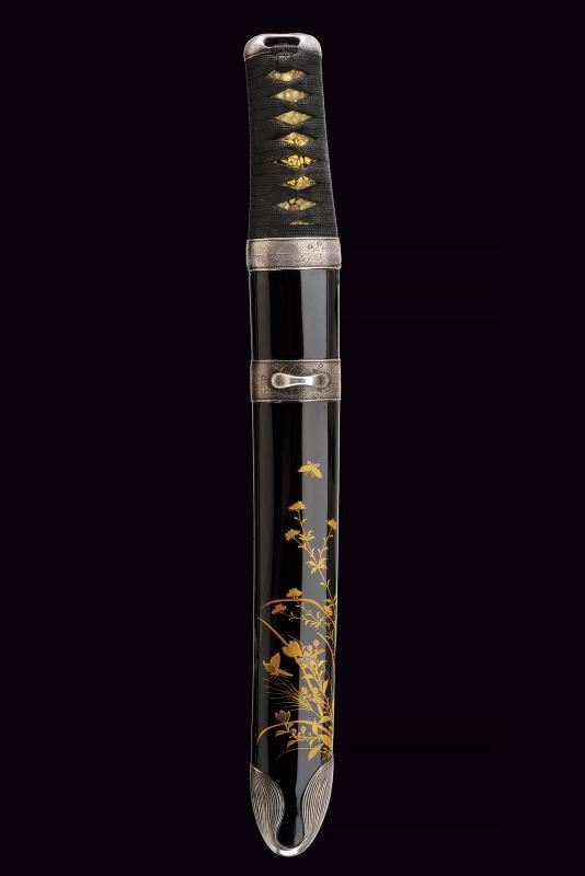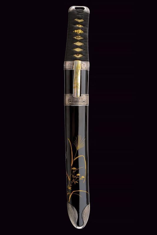 Lama (Nagasa 19 cm) del tipo Yoroidoshi con iokote bosh. Hamon: suguha. Hada: itame nagare. Habaki in rame con lamina in oro. Nakago ubu ha agari kurijiri con due mekugi-ana. Koshirae di eccellente qualità in urushi nero decorato con motivi floreali e farfalle in lacca dorata. Kodogu in argento inciso, kozuka e kogatana completamente in argento. Menuki dorati effigianti peonie.