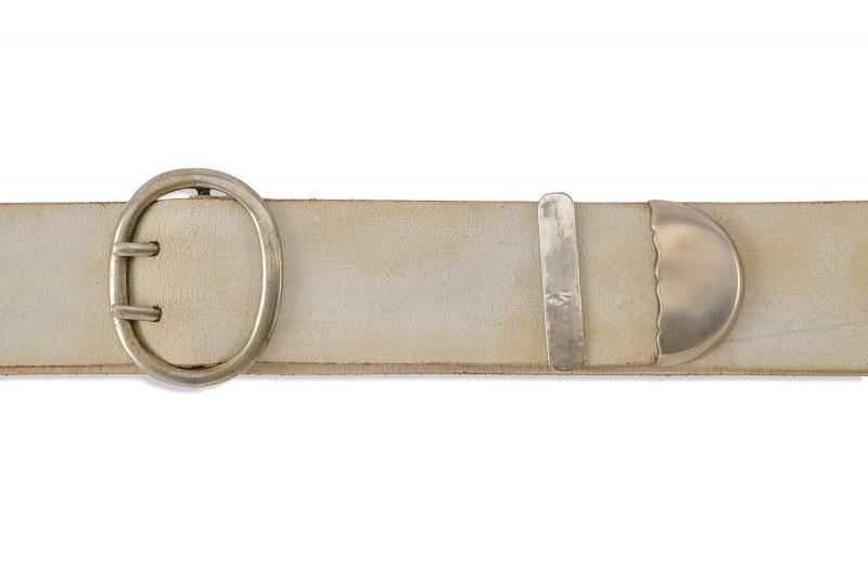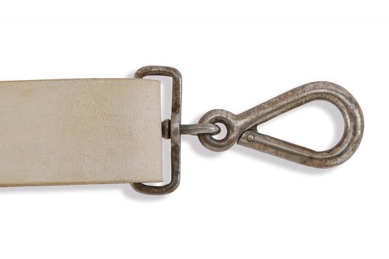 In cuoio, con fornimenti in metallo bianco e moschettone.