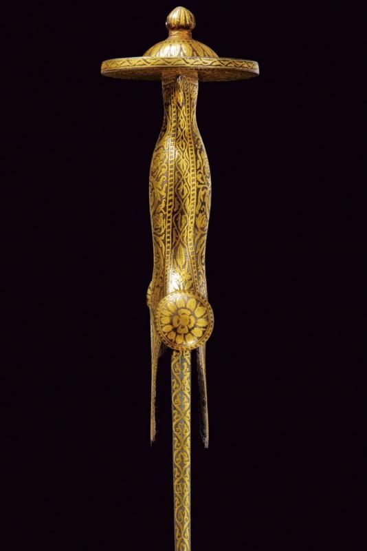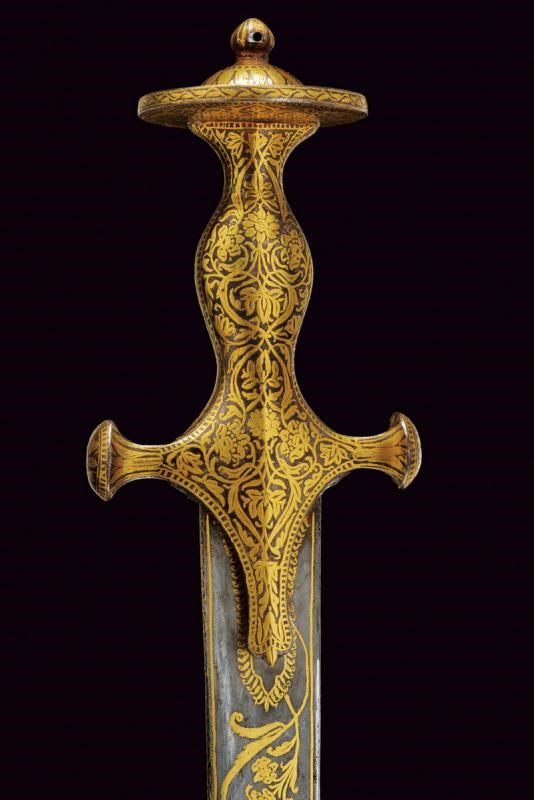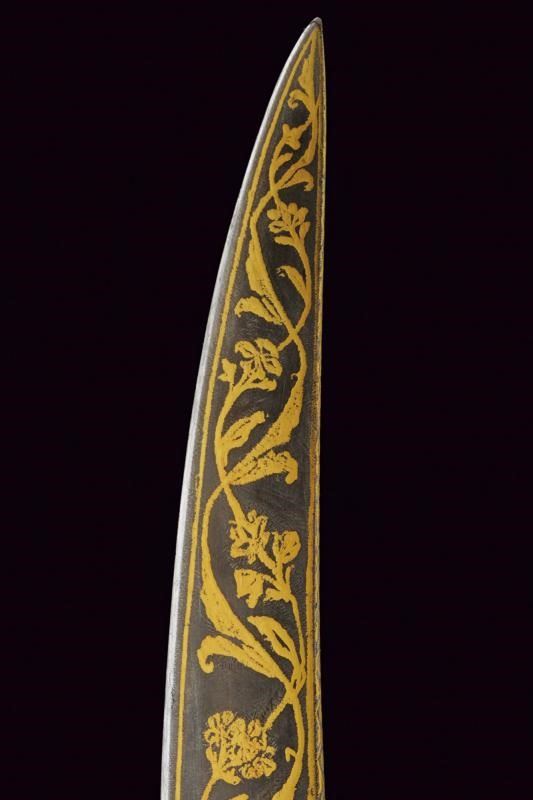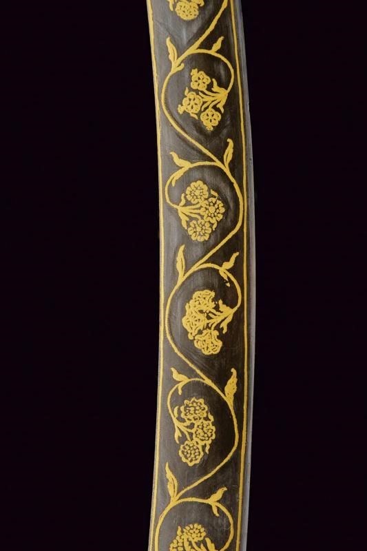 Lama curva a un filo, completamente brunita e finemente decorata a tutta lunghezza in oro a motivi vegetali; il decoro presenta una sequenza continua di racemi sinuosi che si intrecciano a formare volute eleganti, entro cui si inseriscono grappoli floreali. Fornimento di tipica foggia, in un unico pezzo con l'impugnatura, dotato di alette fermafodero e con corti bracci muniti di testa a disco; tutta la superficie incisa in oro a motivi geometrici e floreali che riprendono il decoro della lama. Fodero in legno rivestito da seta color bordeaux e munito di fornimenti elaborati en suite.