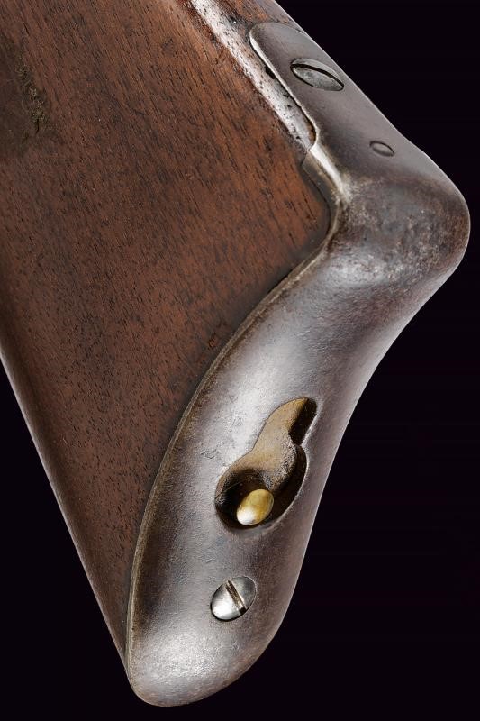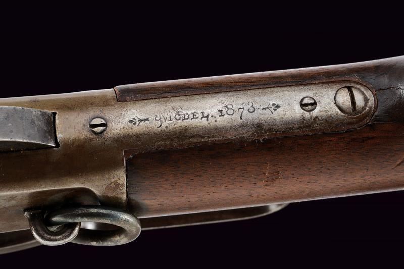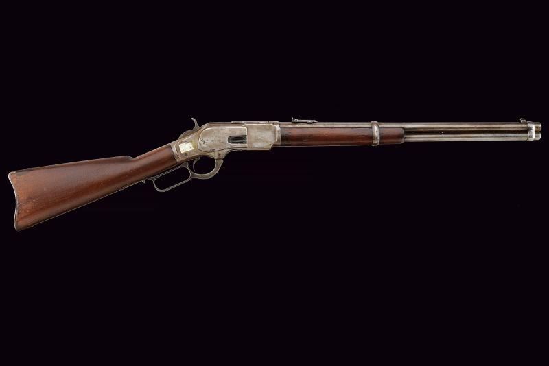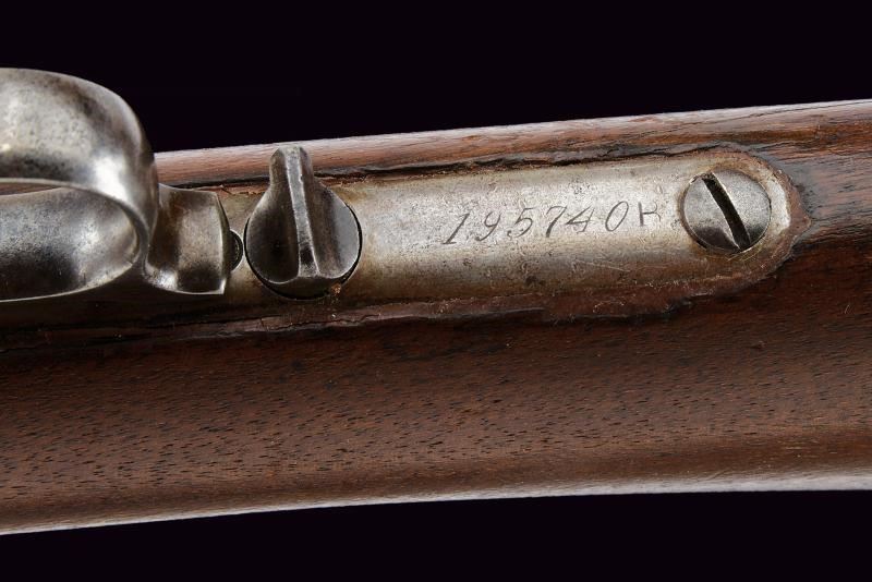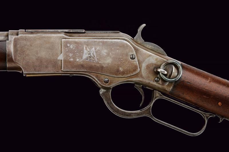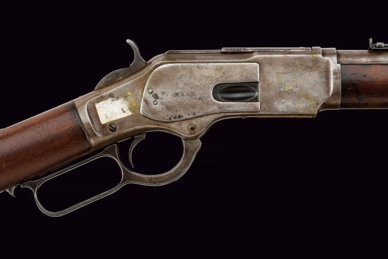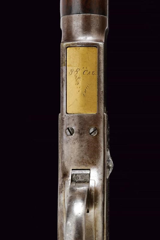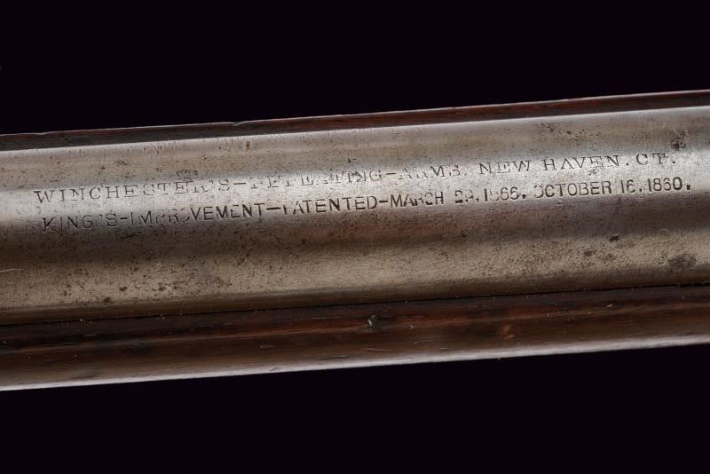 Canna tonda rigata da 20" (anima pulita, rigatura visibile, segni d'uso all'interno), recante marcatura della ditta in due righe ancora discretamente visibile, con brevetti del "King's Improvement", e munita di alzo regolabile. Sopra alla culatta la marcatura "38 CAL." Castello in ferro con guida del coperchio dell'estrattore integrata nel telaio. Carrello elevatore in ottone, con marcatura del calibro. Meccanica funzionante. La punta del percussore spezzata, ma presente. Anello da sella sul fianco sinistro. Calcio ed astina in noce. Leggero gioco del serbatoio tubulare. Fornimenti in ferro. Alcune zone con lievi tracce dell'antica finitura. Calciolo del tipo con sportellino (senza bacchetta all'interno). I codoli del castello con dicitura del modello e matr. "195xxxB". Qualche segno d'uso e del tempo. Stato di conservazione da medio a buono.