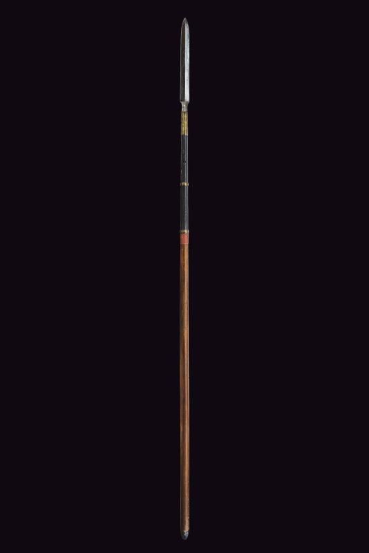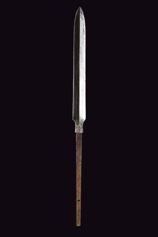 Ho a forma di foglia, entrambi i lati costolati in mezzeria, i fili con intaccature, la base faccettata. La parte superiore del fusto con fornimenti in ottone. Asta lignea, il primo terzo verniciato di nero. Ishizuki mancante. Epoca: tardo periodo Edo.