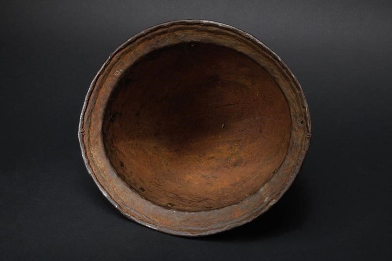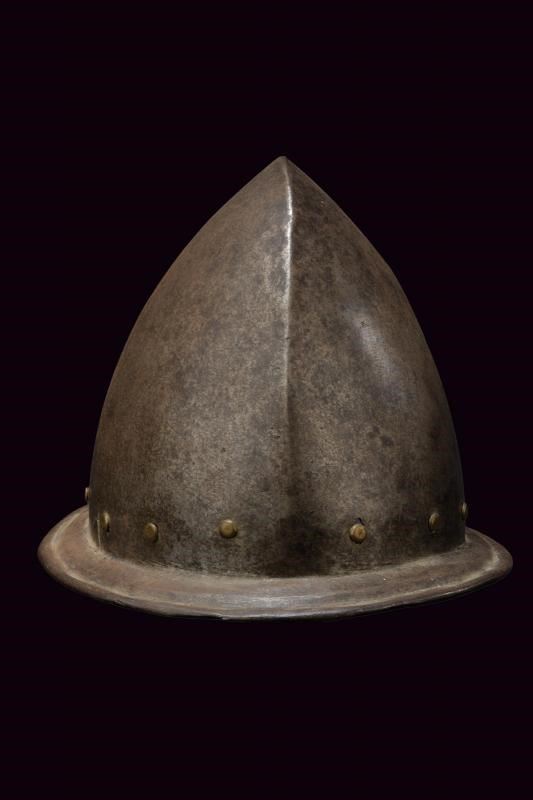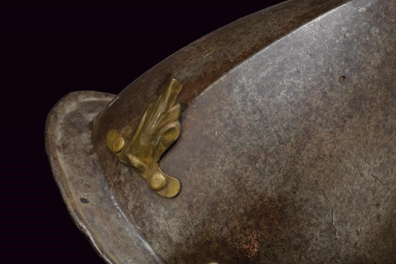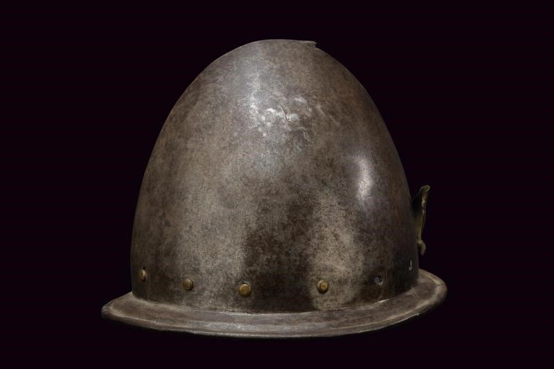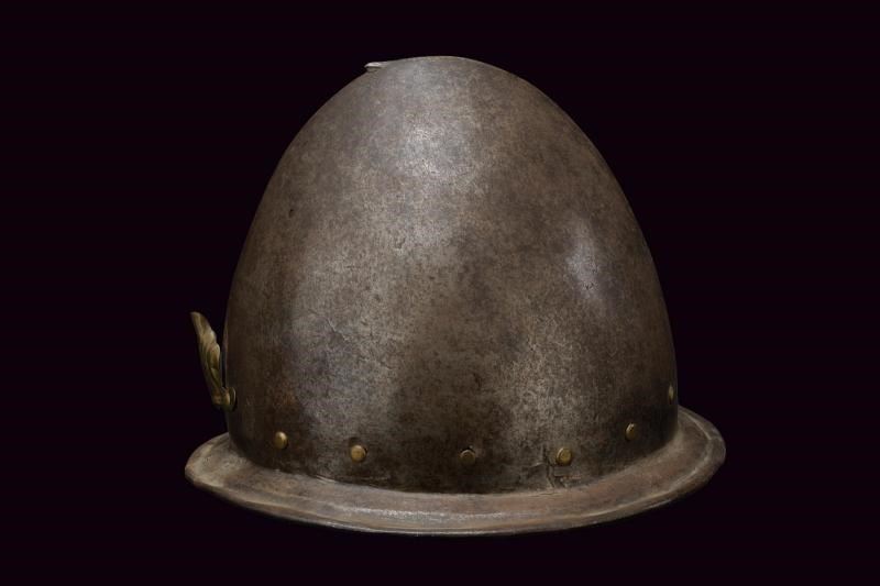 In ferro, coppo a ogiva con apice ricurvo; alla base giro di ribattini in ottone (come la pennacchiera di epoca successiva). Tesa leggermente spiovente con incavo a ridosso del bordo liscio e rivoltato.