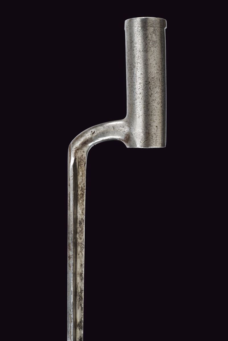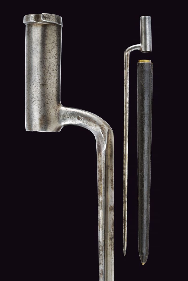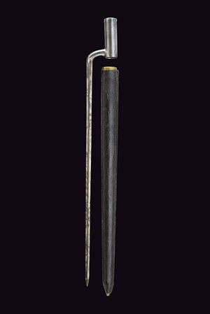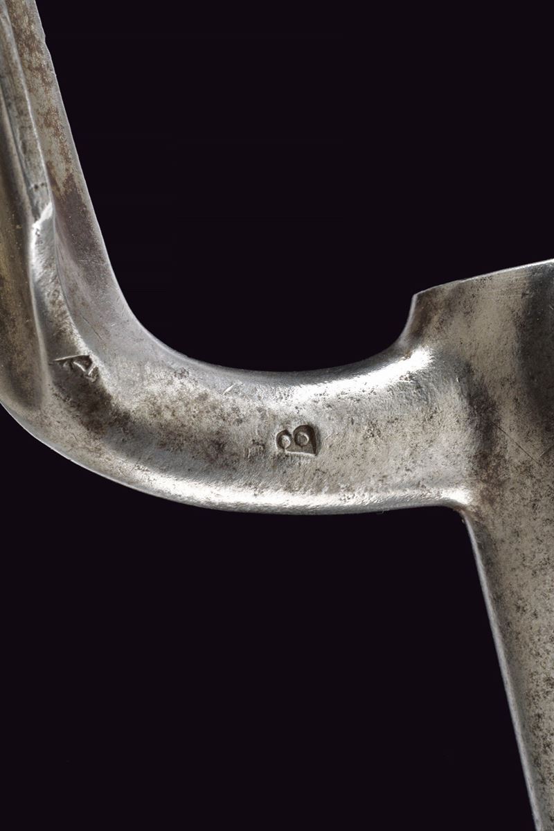 Lama cruciforme, arco marcato "B". Completa di fodero rivestito in cuoio, con fornimenti e gancio in ottone.