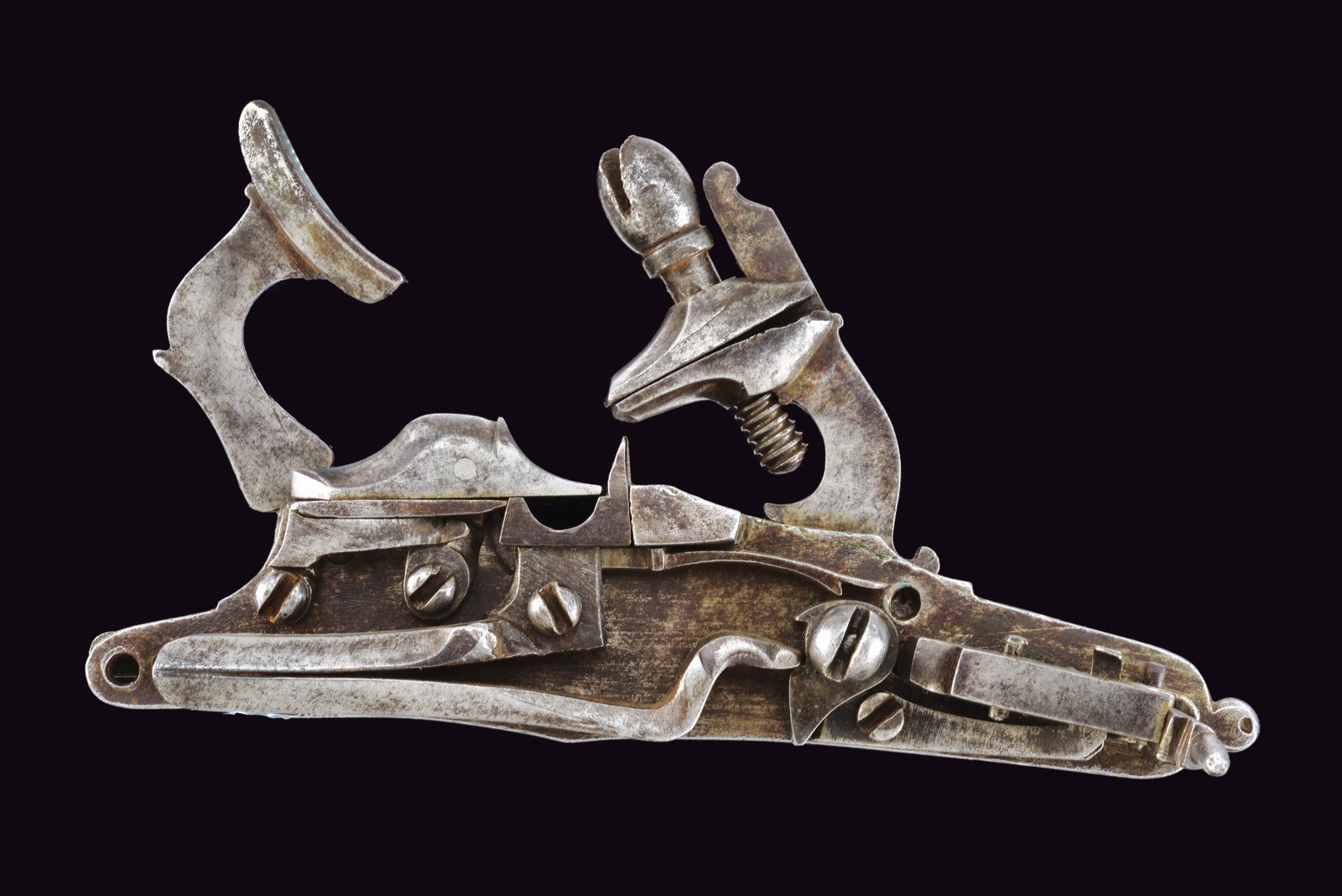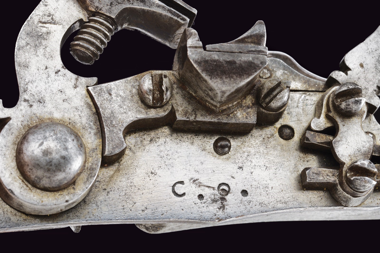 Cartella di foggia arcaica con collo del cane e martellina piatti, briglia sulla molla e scodellino scorrevole. Siglata in stampatello "C.O.".