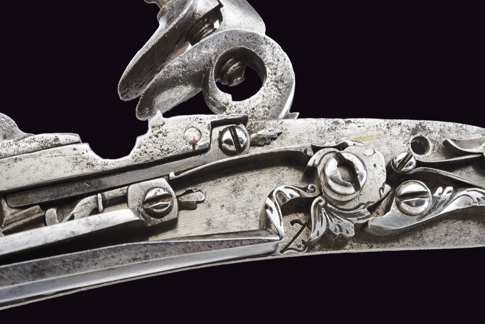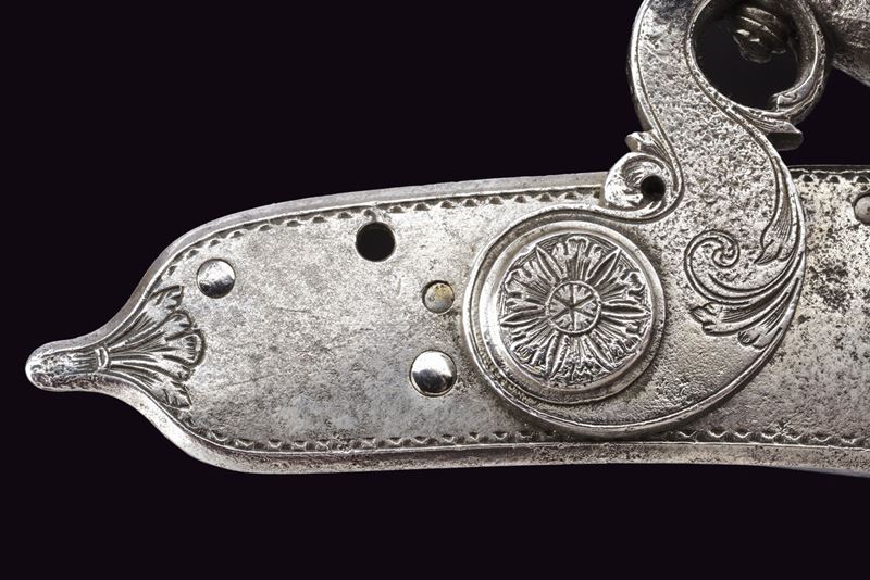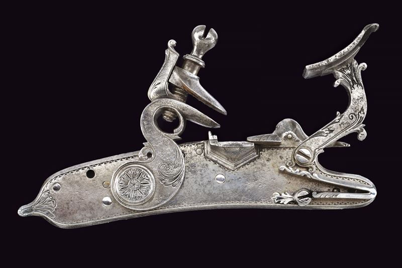 Cartella, collo del cane e della martellina piatti, sobriamente incisi a volute floreali, la vite del cane incisa a forma di fiore. All'interno le iniziali "SZ" per Stefanio Zanotti e la data "1830".