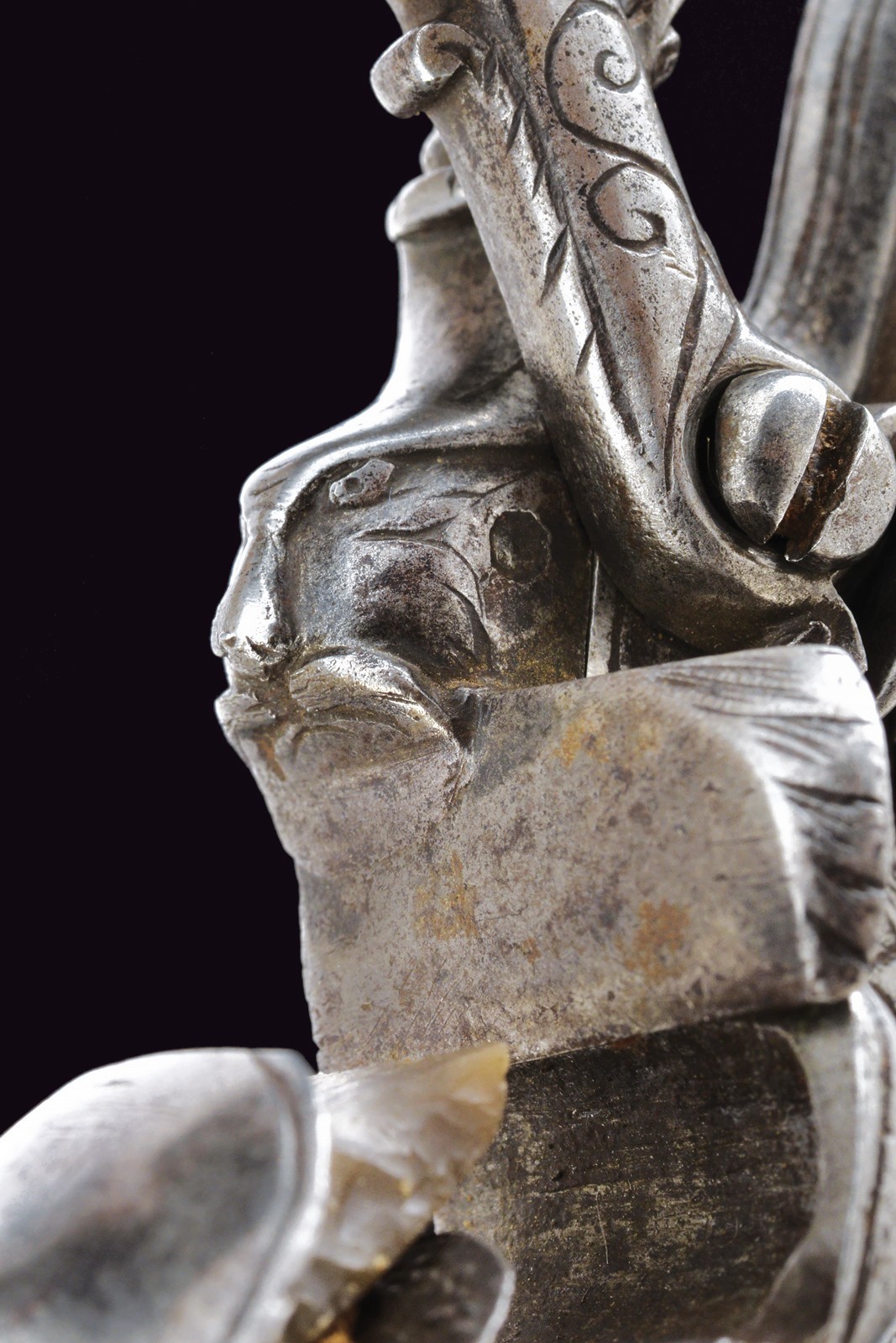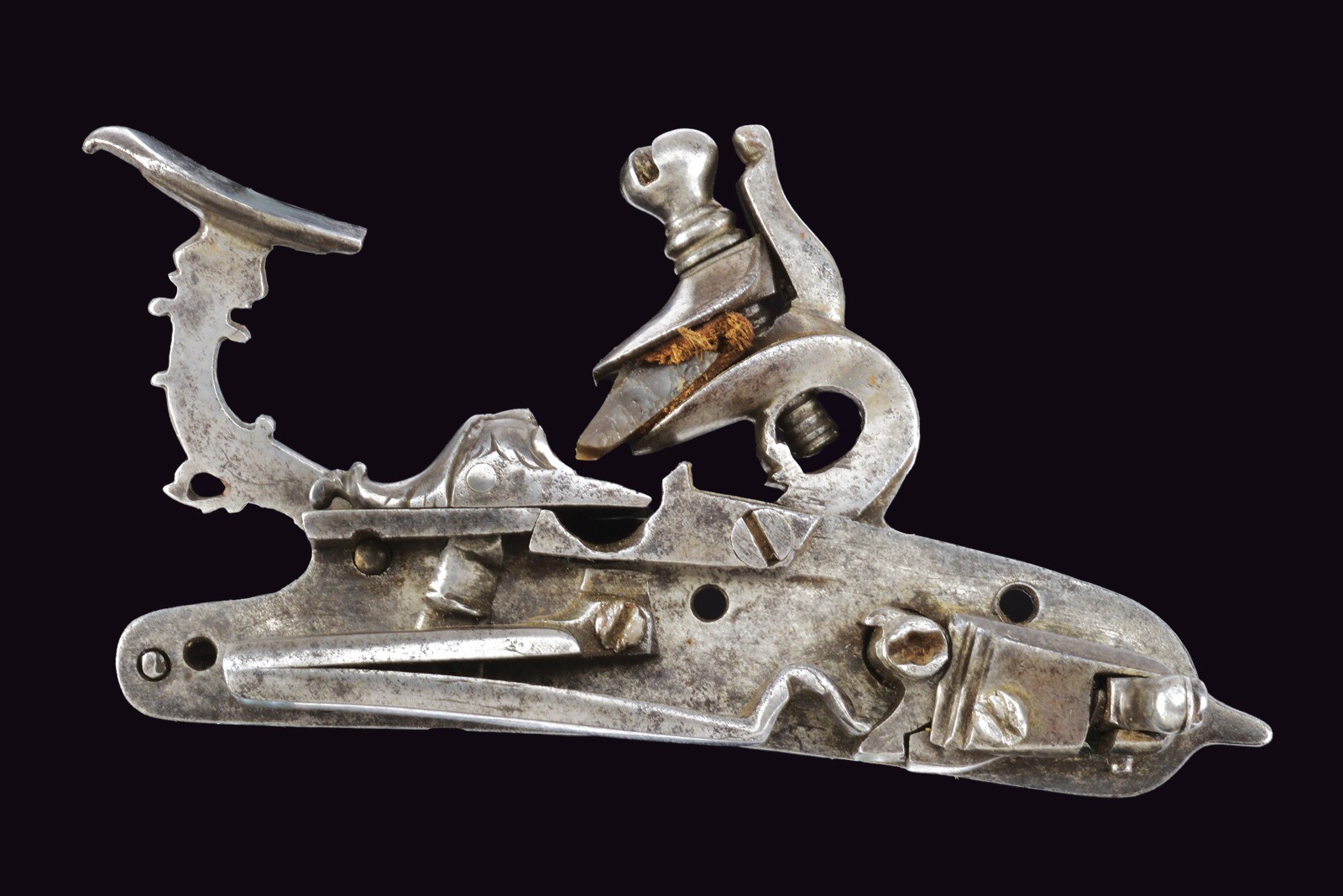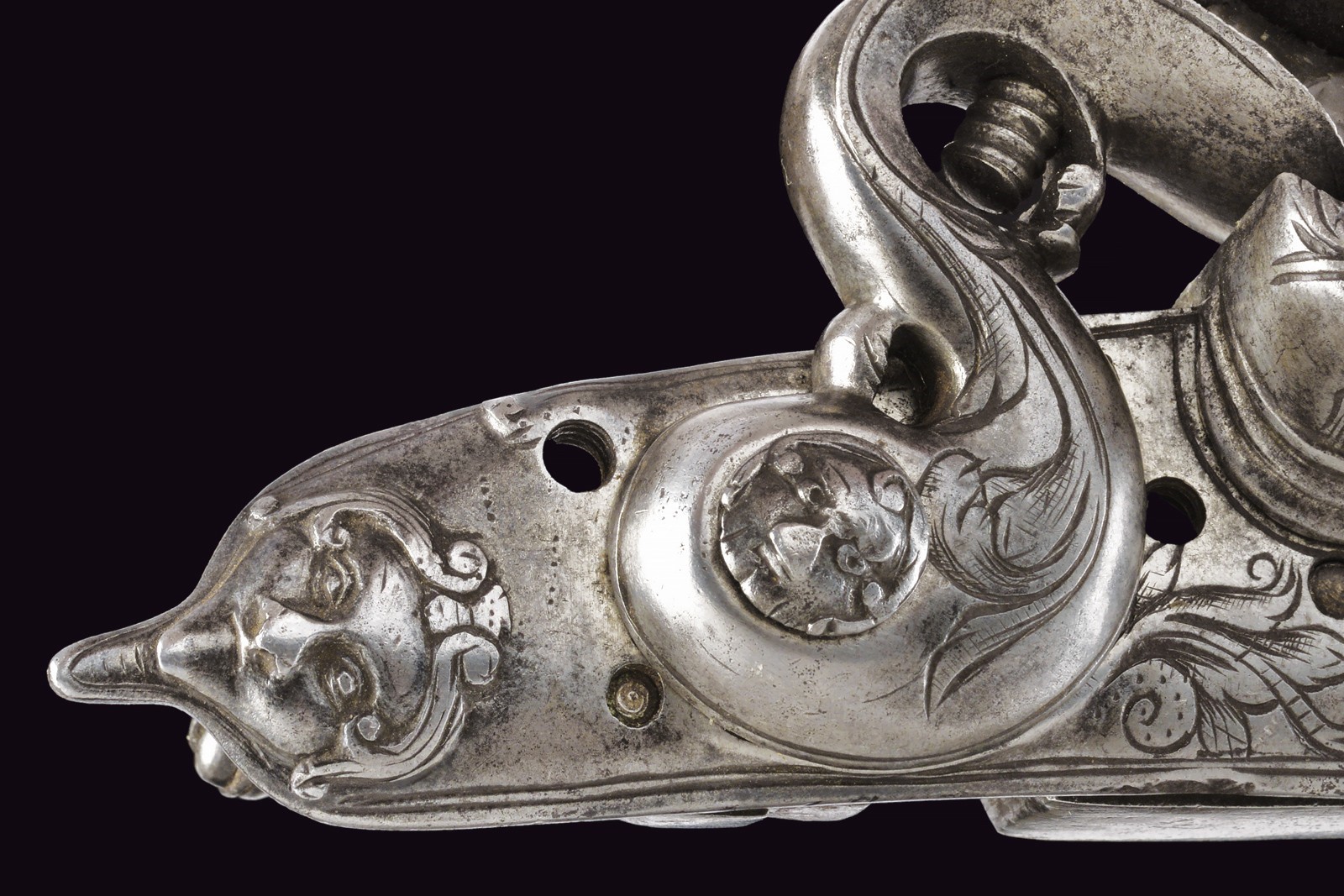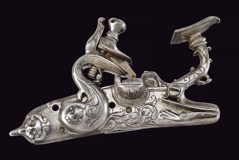 Cartella bombata incisa a fiorame, con bel mascherone a tuttotondo sulla coda. Collo del cane e della martellina con incisioni en suite. Scodellino scorrevole e dispositivo di scatto a cassetta.