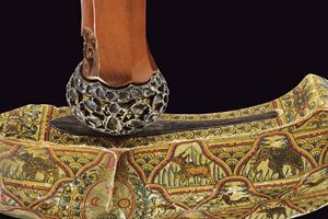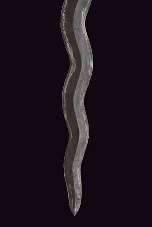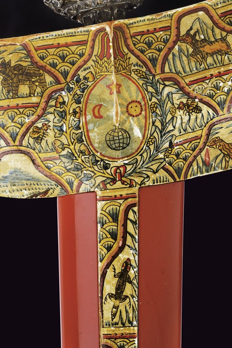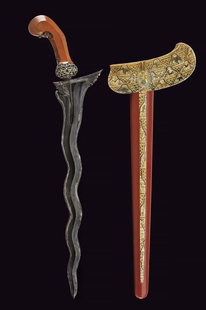 Lama a doppio filo ondulato in pamor con base scanalata e intagliata. Ukiran di forma tipica, scolpito a motivi floreali, con splendido selut in argento traforato. Warangka finemente dipinta in policromia con sole, luna, stelle e globo, circondati da animali entro cartigli floreali (piccole mancanze ai bordi). Gandar con pendok in metallo laccato di rosso, al centro una banda decorata en suite.