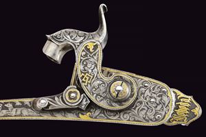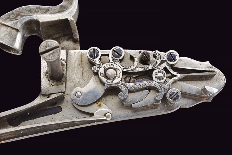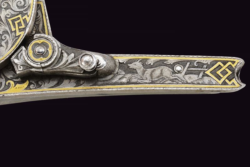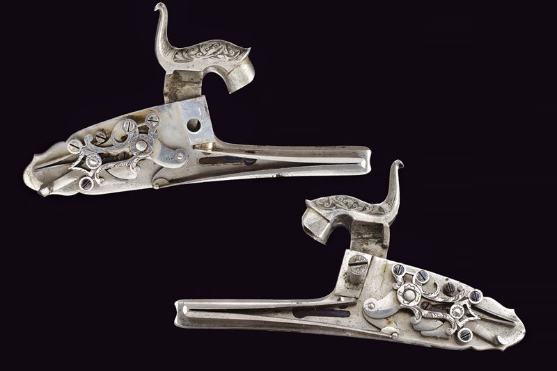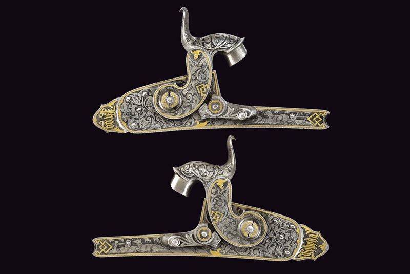 Batterie a molla in avanti con cartelle totalmente incise a volute floreali e animali; alcuni elementi dorati, come i bordi e un elemento floreale in rilevo sui cani; quest'ultimi decorati en suite; le code ribassate e rispettivamente firmate a caratteri gotici in oro "LEBEDA" e "PRAG". Su entrambe sicura con sistema a leva. L'interno ben conservato e con alcuni elementi incisi, le viti brunite. Meccaniche ben funzionanti.