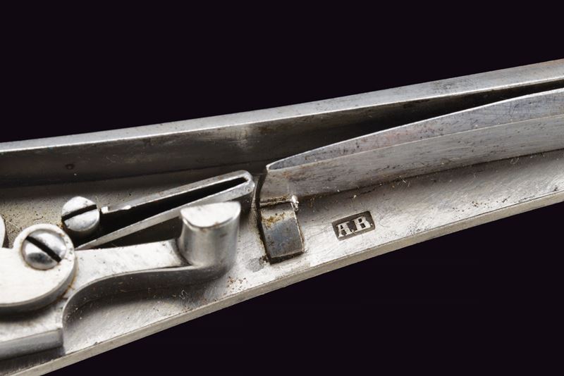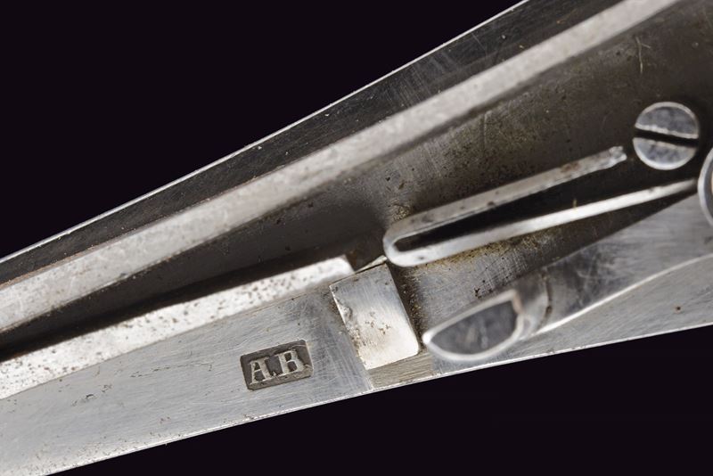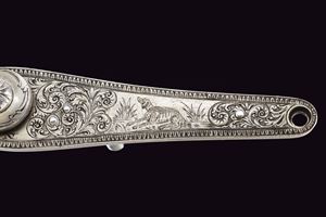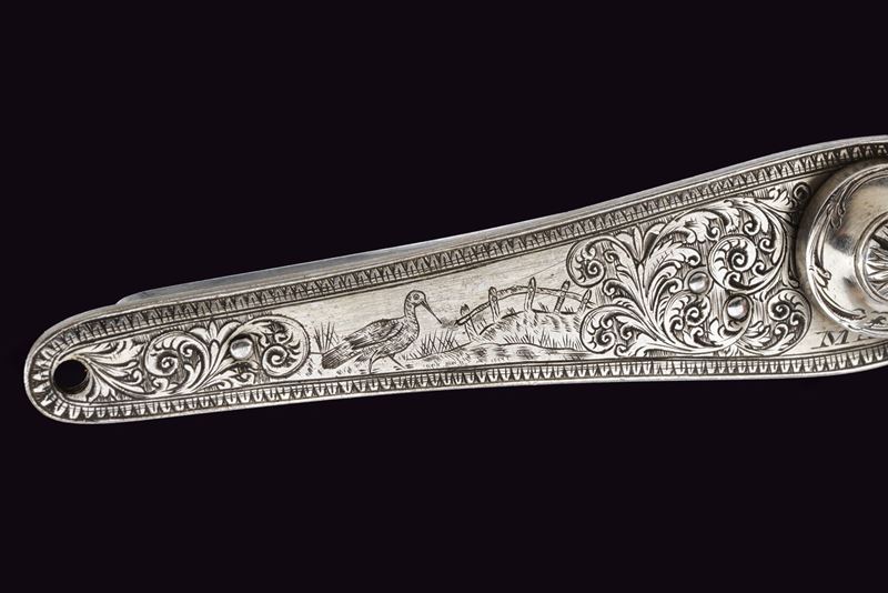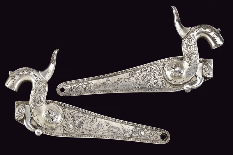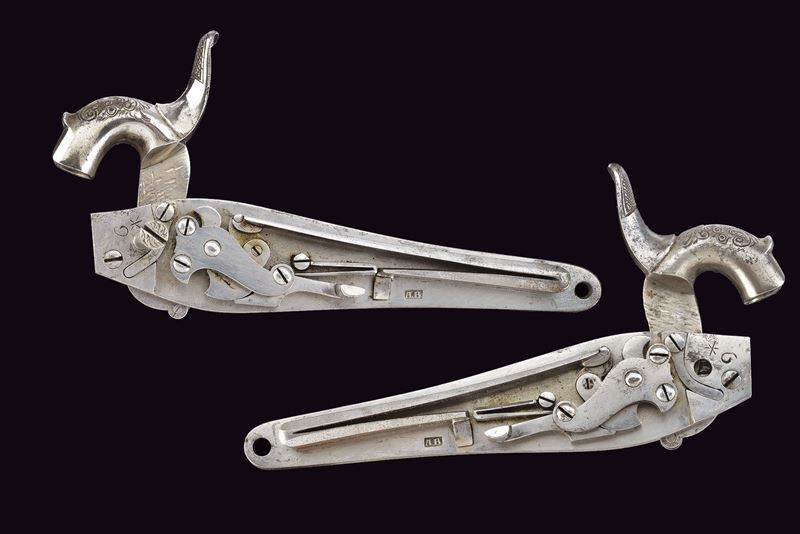 Batteria a molla indietro con snelle cartelle, le superfici incise a volute floreali, volatile e segugio; i bordi con trama ad onde; rispettivamente firmate "MAYER" e "WIEN"; i due cani decorati a motivi floreali e con presa zigrinata. Sistema di sicura a leva funzionante. Internamente con punzone "AB". Una con vite. Per una doppietta. Meccaniche ben funzionanti.