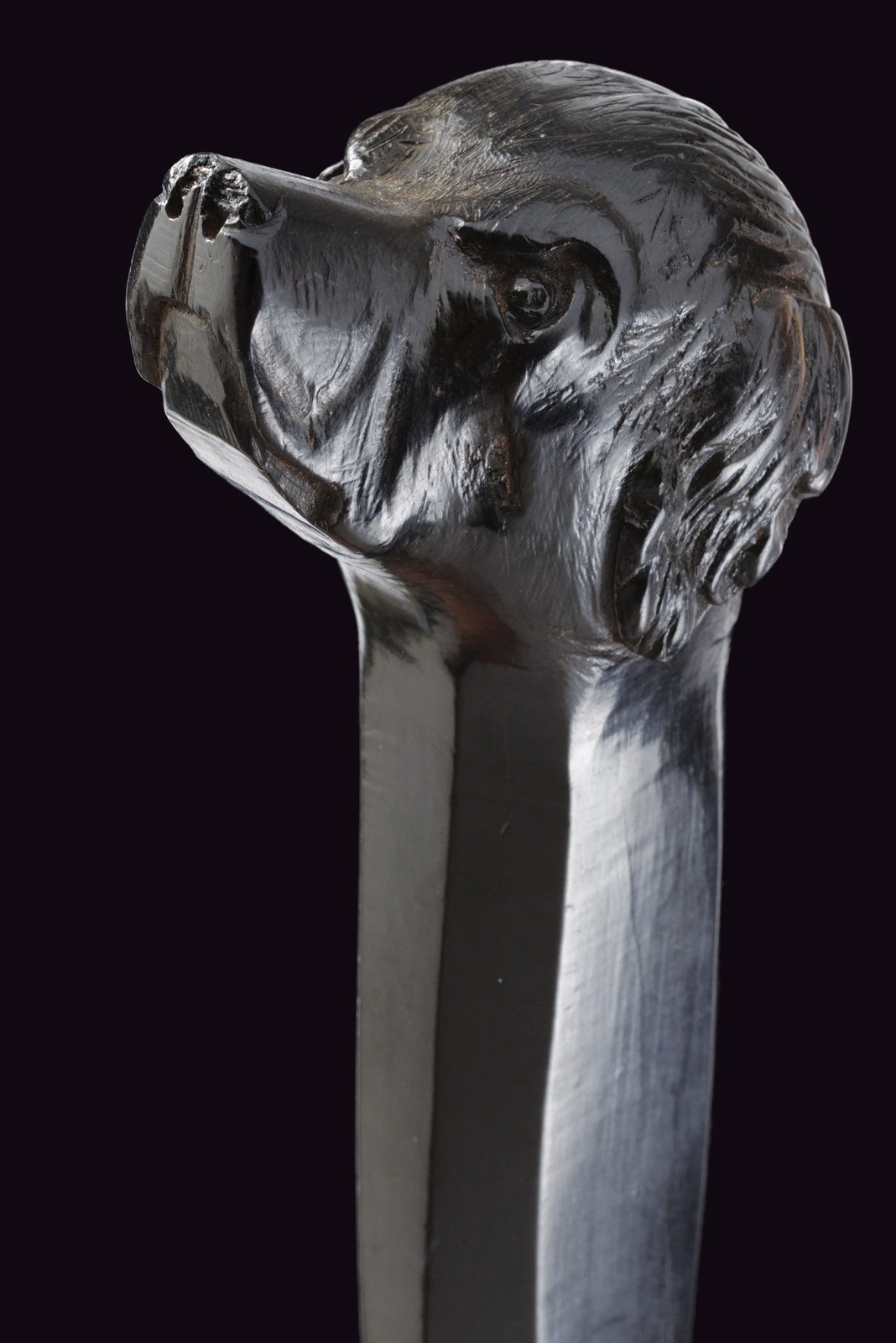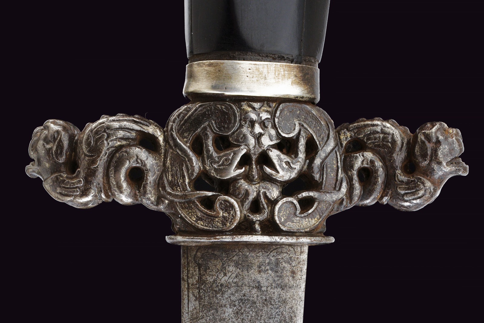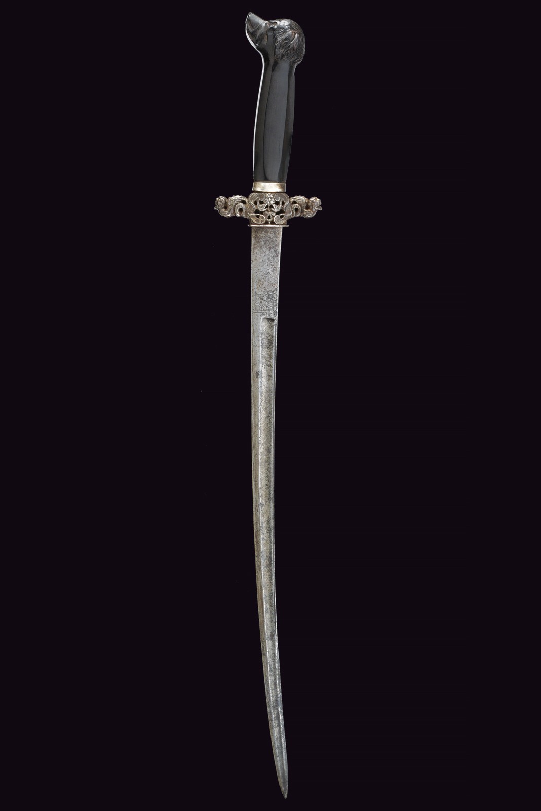 Lama curva a un filo e controfilo, piatta al forte e con resti di incisioni, poi con sguscio centrale e sottile scanalatura dorsale. Bellissimo elso in ferro intagliato e traforato raffigurante due draghi e serpenti. Impugnatura in ebano con pomo a testa di segugio con base faccettata.