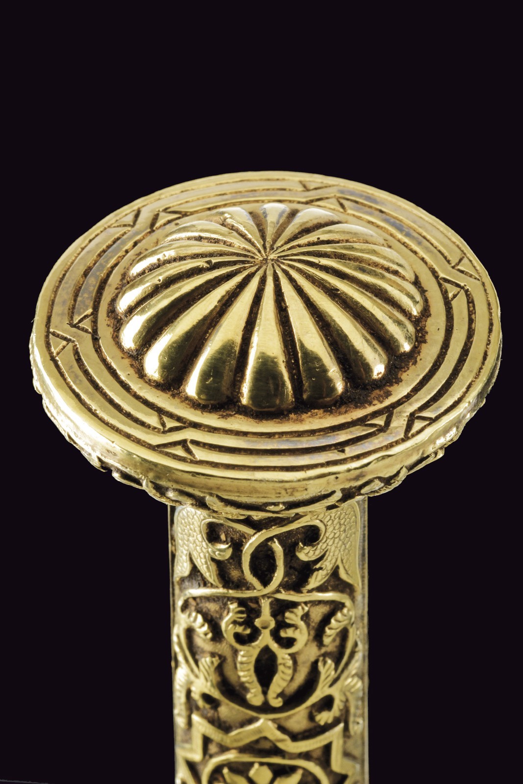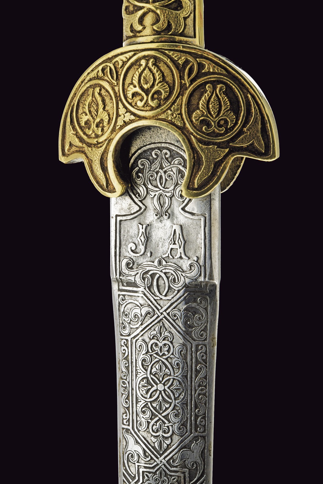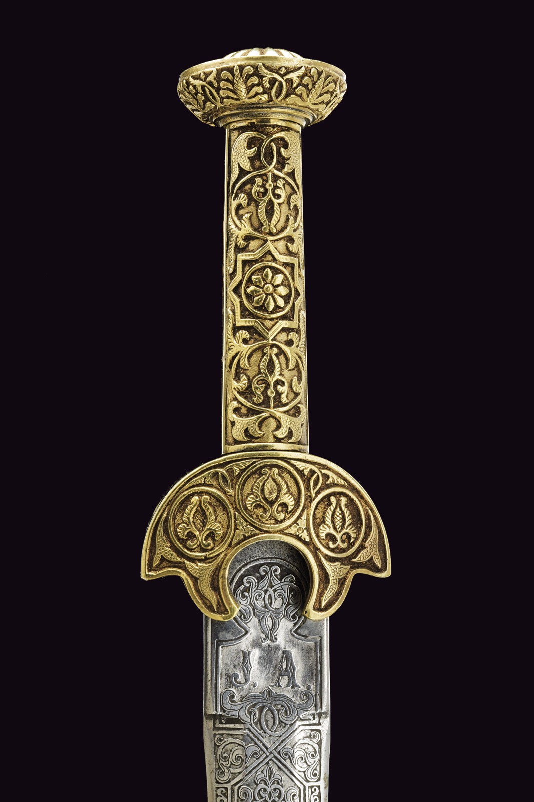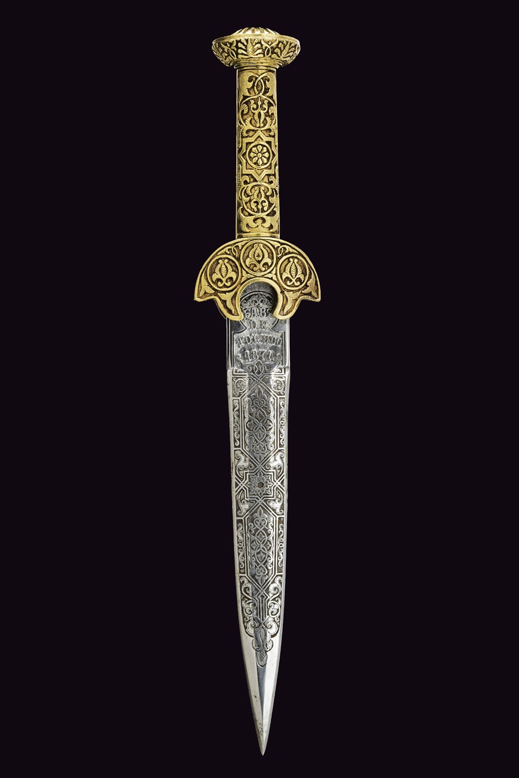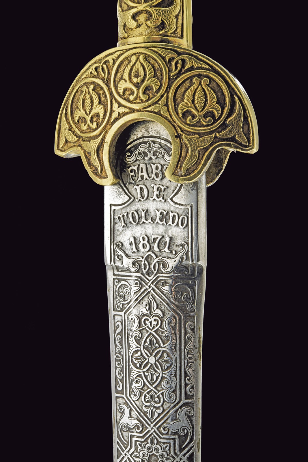 Lama dritta a due fili di sezione esagonale completamente incisa a fini motivi floreali e geometrici, il tallone marcato "FAB DE TOLEDO 1871", sull'altro lato il monogramma "J.A." Elegante impugnatura in metallo bianco massiccio, con bellissimi motivi floreali in bassorilievo e dorati.