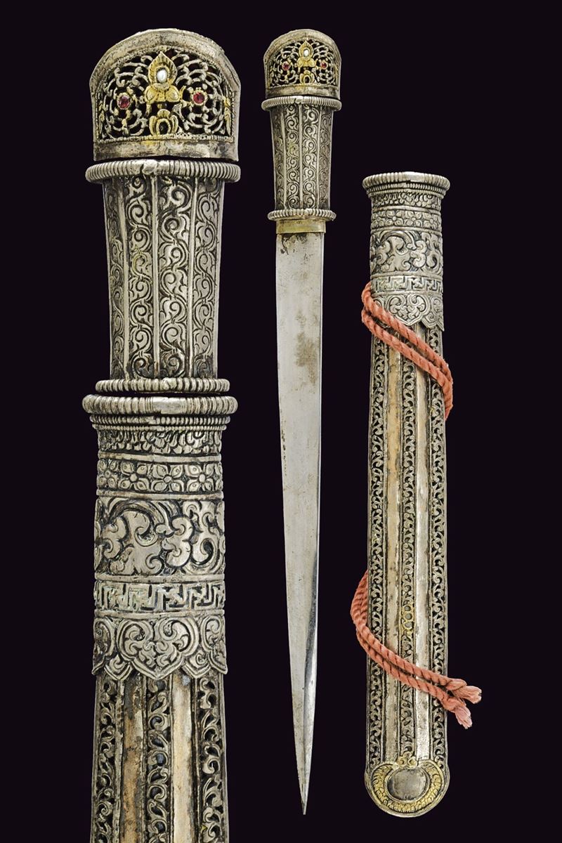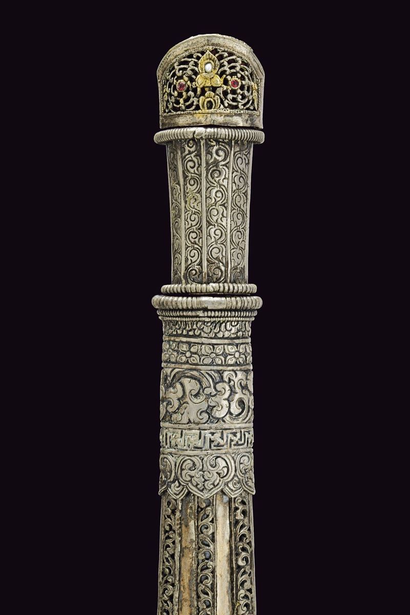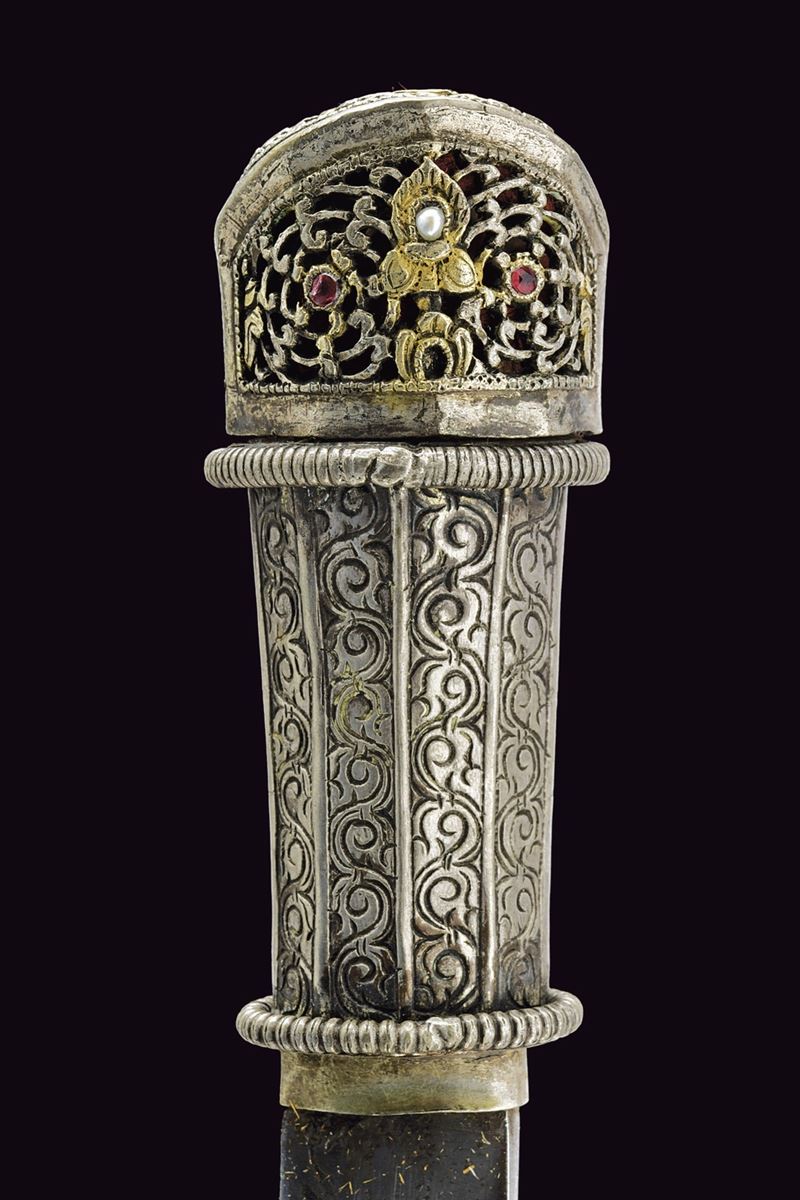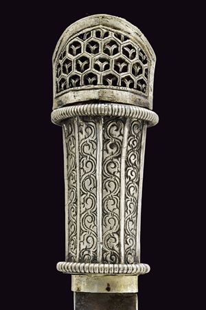 Spessa lama dritta a un filo e breve controfilo. Impugnatura in legno rivestita in lamina d'argento strutturata a doghe longitudinali decorate a volute, il bordo superiore ed inferiore in rilevo, sporgente e decorato con una serie di anelli contigui; bel pomo in argento messo a giorno ed articolato su tre facce, due impostate sul piano longitudinale della lama e una sul piano trasversale; delle due longitudinali, la prima è ornata con due pietre dure di color rosso inserite in elementi intagliati a volute circolari, tra esse una piccola perla è posta come volto di una figura dorata. La seconda con un elegante reticolo intagliato a celle esagonali. La faccia posta sul piano trasversale alla lama con decorazioni a volute e con elementi recanti resti di doratura; all'interno del pomo è possibile vedere la fodera rossa. Fodero in legno completamente rivestito da lamine d'argento, la parte anteriore con tre bande, due laterali e una centrale, messe a giorno ed intagliate a volute (alcuni resti di doratura); la parte posteriore en suite ma priva di banda centrale; cappa con decorazioni in rilevo a motivi floreali e geometrici, la parte dell'imboccatura strutturata en suite alle estremità dell'impugnatura. Anello di sospensione.