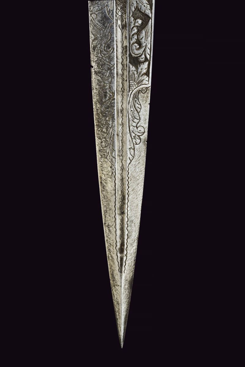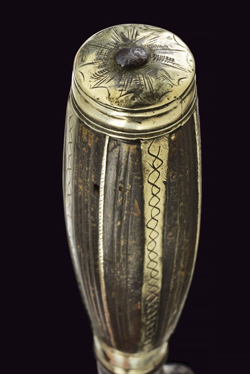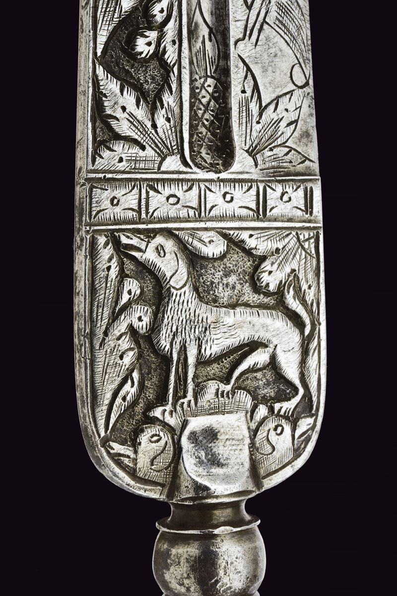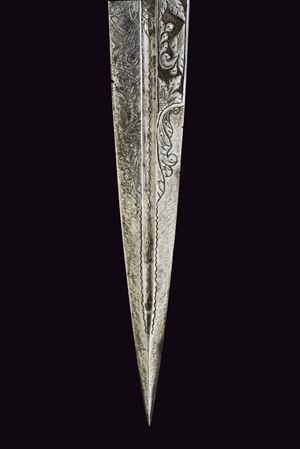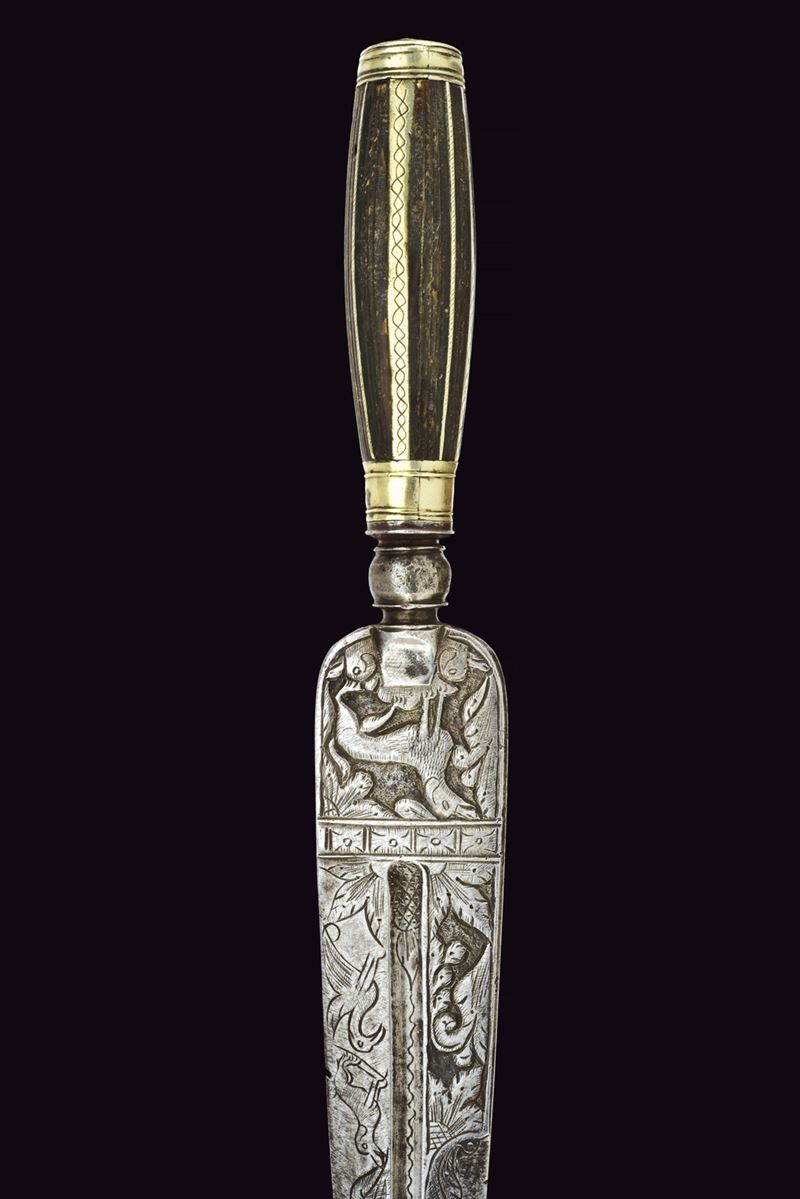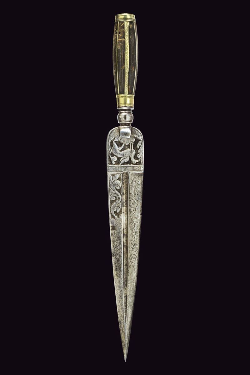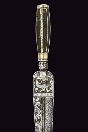 Lama a filo e controfilo, con sguscio centrale, incisa a bulino e intagliata a motivi fitomorfi. Tallone rettangolare intagliato in bassorilievo con un cane e un animale fantastico. Nodo tondo tra scanalature. Ghiera e cappellotto in argento incise e delineati. Impugnatura in corno ornata da bandelle longitudinali in argento inciso.
