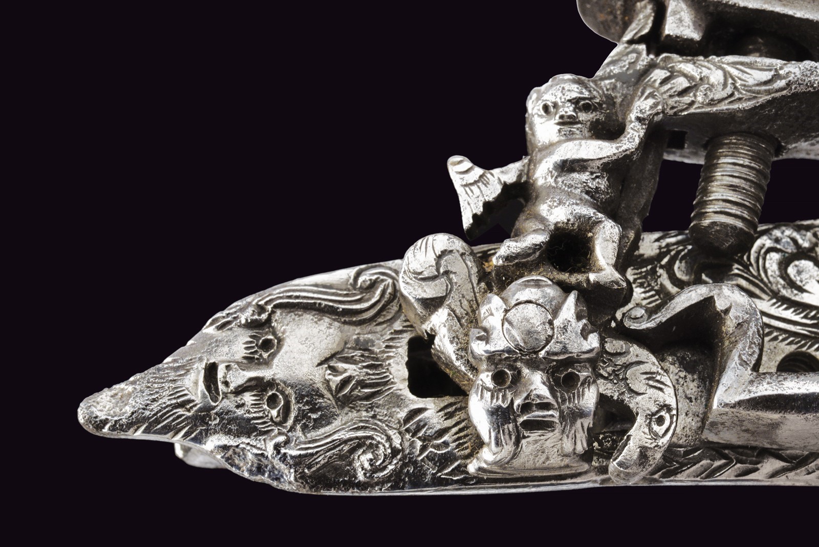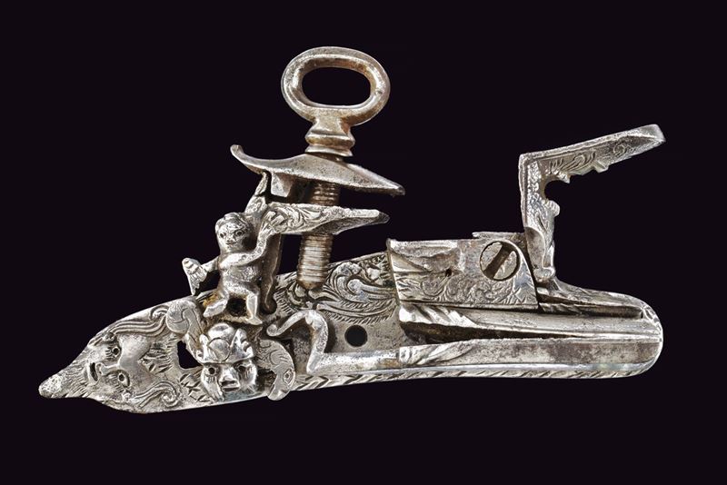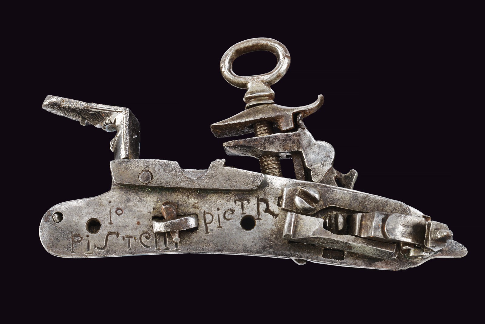 Cartella piatta intagliata alla coda con bel mascherone, caratteristico cane intagliato con un angioletto a tuttotondo e mascherone sulla briglia. Scodellino, martellina e mollone intagliati ed incisi. All'interno la firma in stampatello "IO. PIETRO PISTELLI".