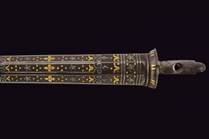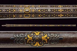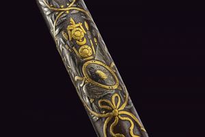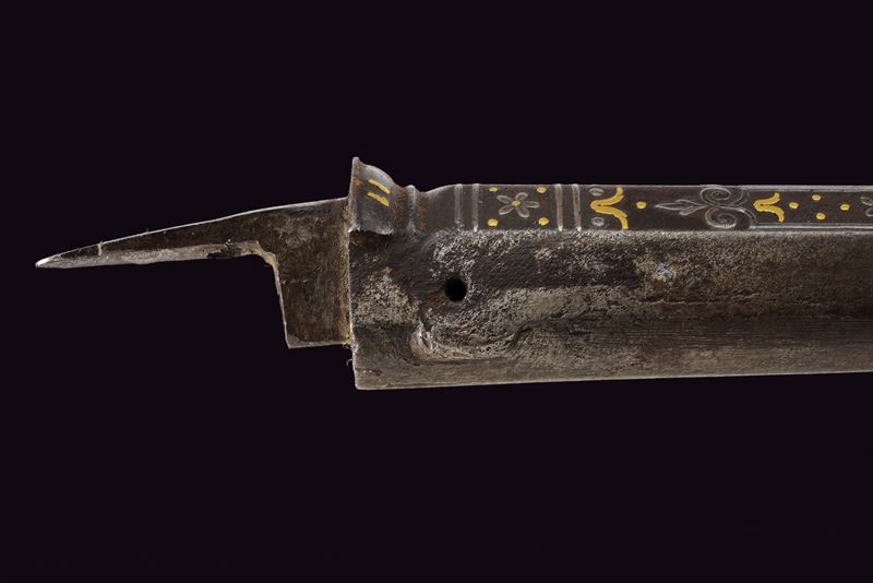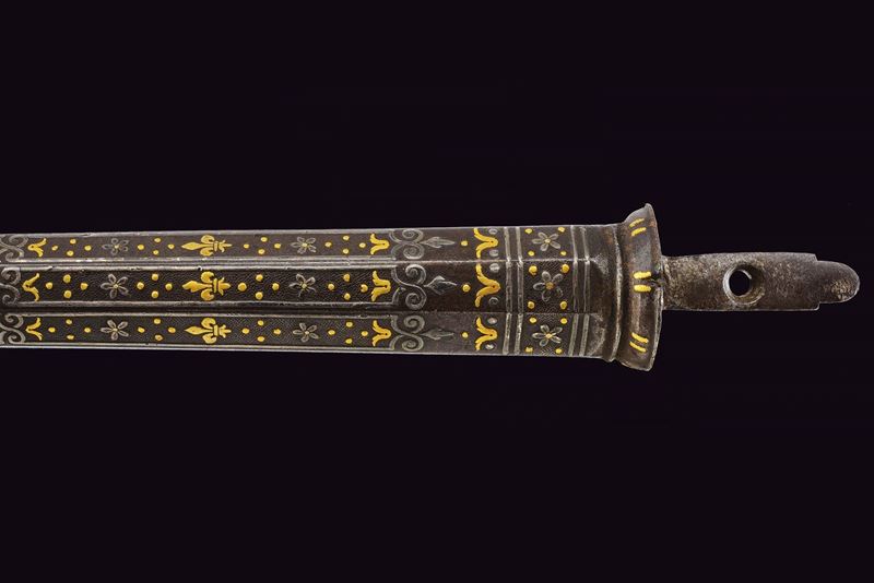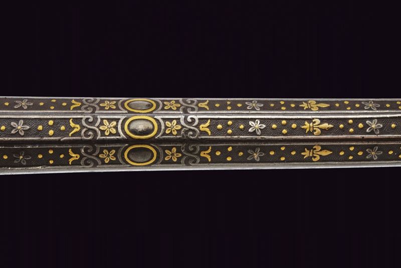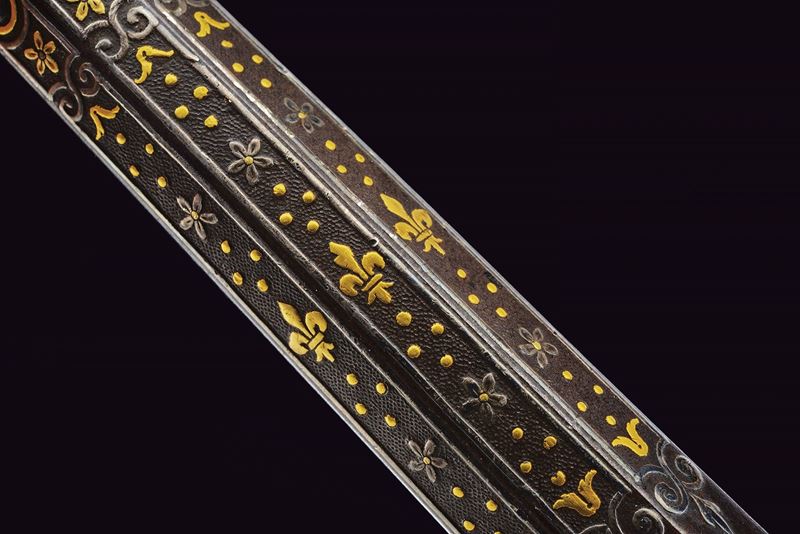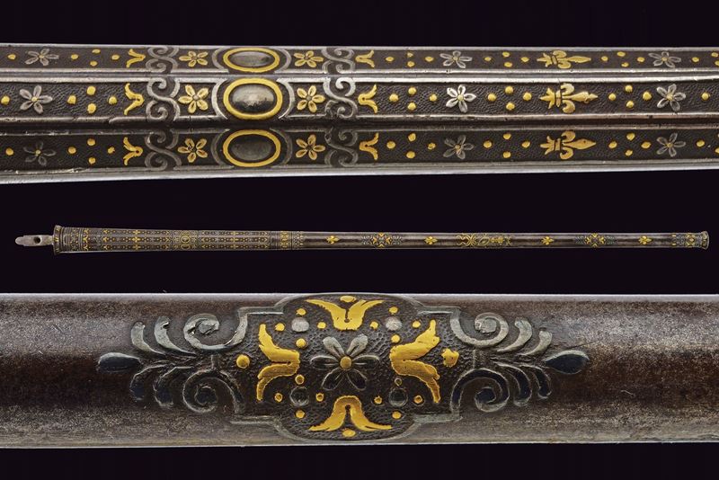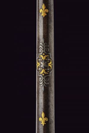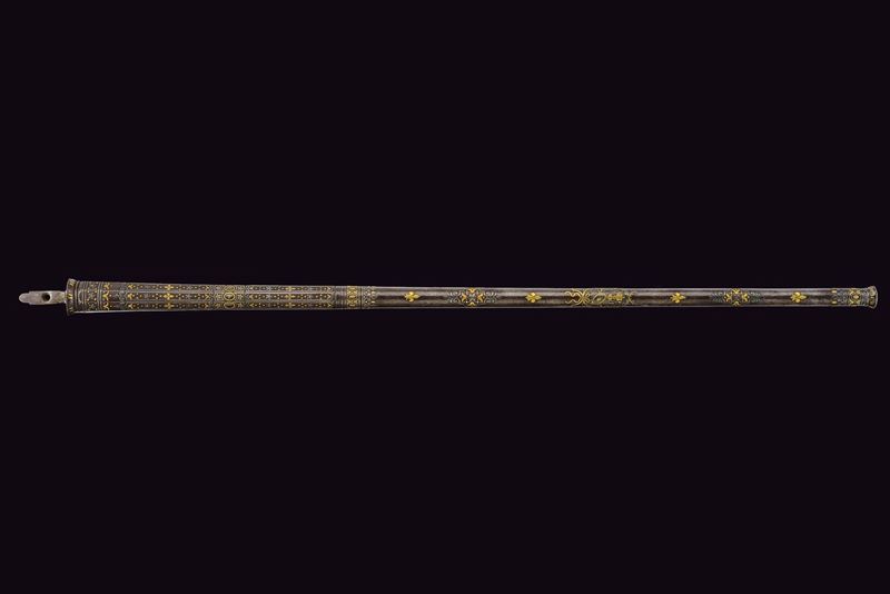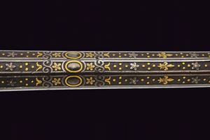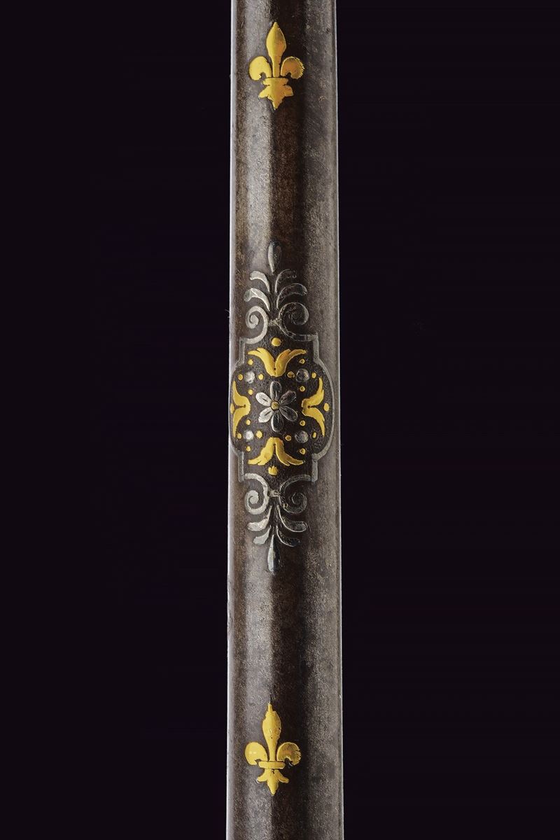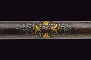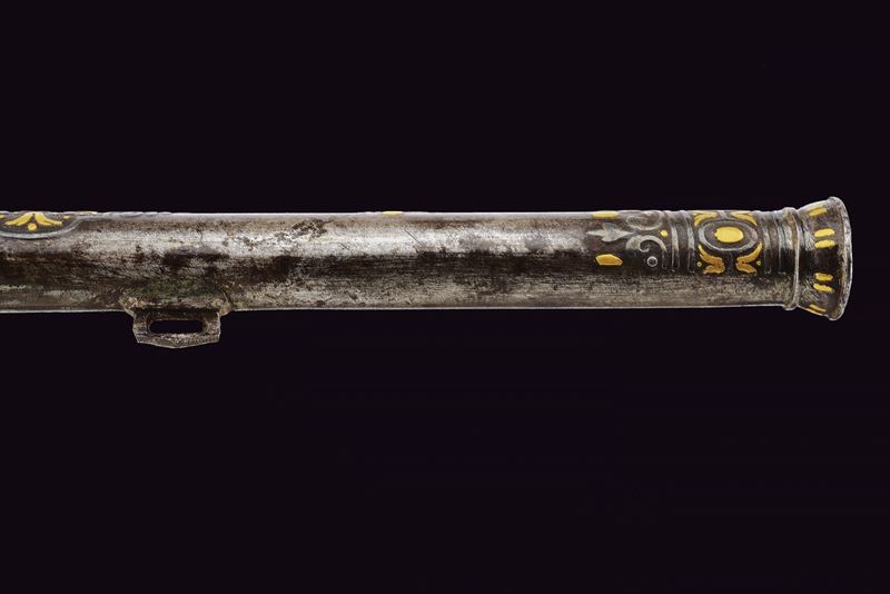 Lunga ed elegante canna ad avancarica, di piccolo calibro, cal. 9 mmm, quadra e tonda con cornicetta scanalata ed intagliata ad ovalini e fiori rimessi in oro. La parte quadra con cornice al cambio intarsiata a figure geometriche, sempre rimessa in oro, come pure gli altri bei decori a fiori inframmezzati a gigli ed evolani entro cornicette delicate in argento. La parte tonda con con i medesimi gigli dorati con l'aggiunta di un bel trofeo. in volata una bella gioia di bocca, anch'essa decorata in oro. Nella parte inferiore, due passanti rettangolari per il fissaggio al fusto. Di ottima qualità.