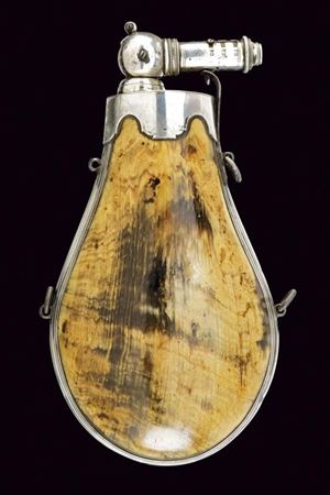 Con corpo in corno di mucca, a forma di goccia, piatto sul retro. Eleganti fornimenti in argento con cannello regolabile e pieghevole. Tre anelli di sospensione (il quarto mancante). Rara.