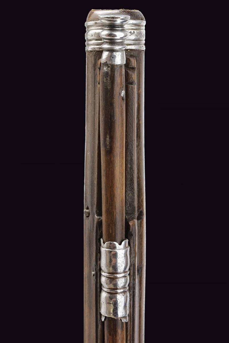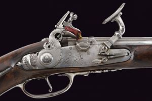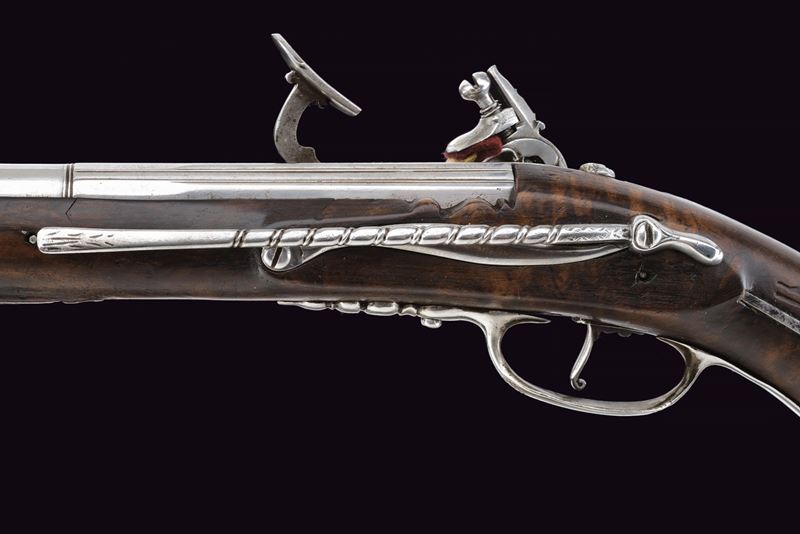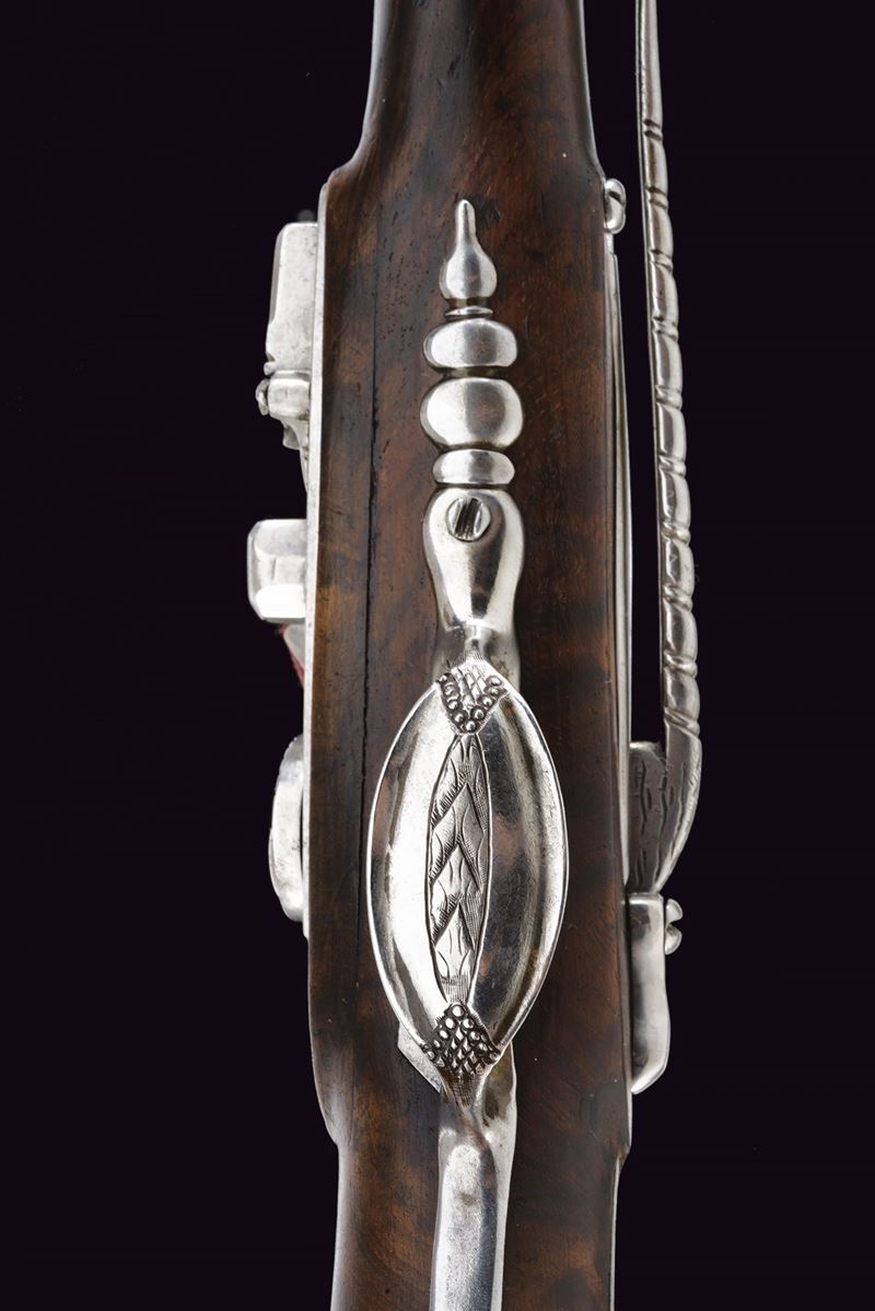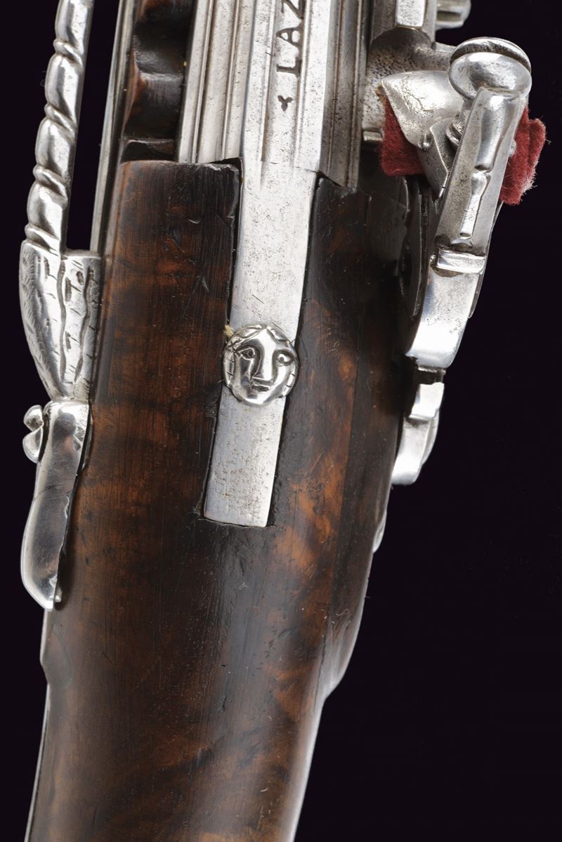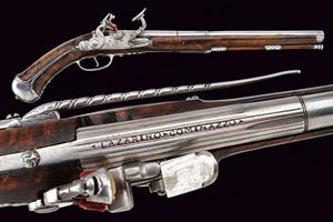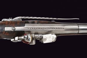 Lunga canna liscia a quattro ordini, prima ottagonale, decorata con sottili nervature e firmata "LAZARINO COMINAZZO", dopo un breve segmento a sedici facce, due parti tonde suddivise da anelli, cal. 11 mm; codetta liscia, con vite rivestita da un mascherone in ferro intagliato. Batteria a cartella piatta incisa a motivi floreali, con coda ribassata, intagliata ed incisa, elegante cane piatto con intaglio traforato sul collo. Copriscodellino scorrevole. Cassa intera in radica (riparazioni attorno alla batteria, alla coccia e sotto alla canna; tutte risalenti all'epoca d'uso), lievemente scolpita alla base della canna. Fornimenti in ferro; il ponticello con incisioni floreali, la coccia con piccolo mascherone e contropiastra a "S" con gancio da cintura intagliato. Il primo fornimento reggibacchetta intagliato con un volto in bassorilievo. Bacchetta in legno con battipalla e cavastracci in ferro intagliati.