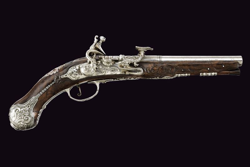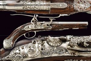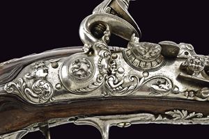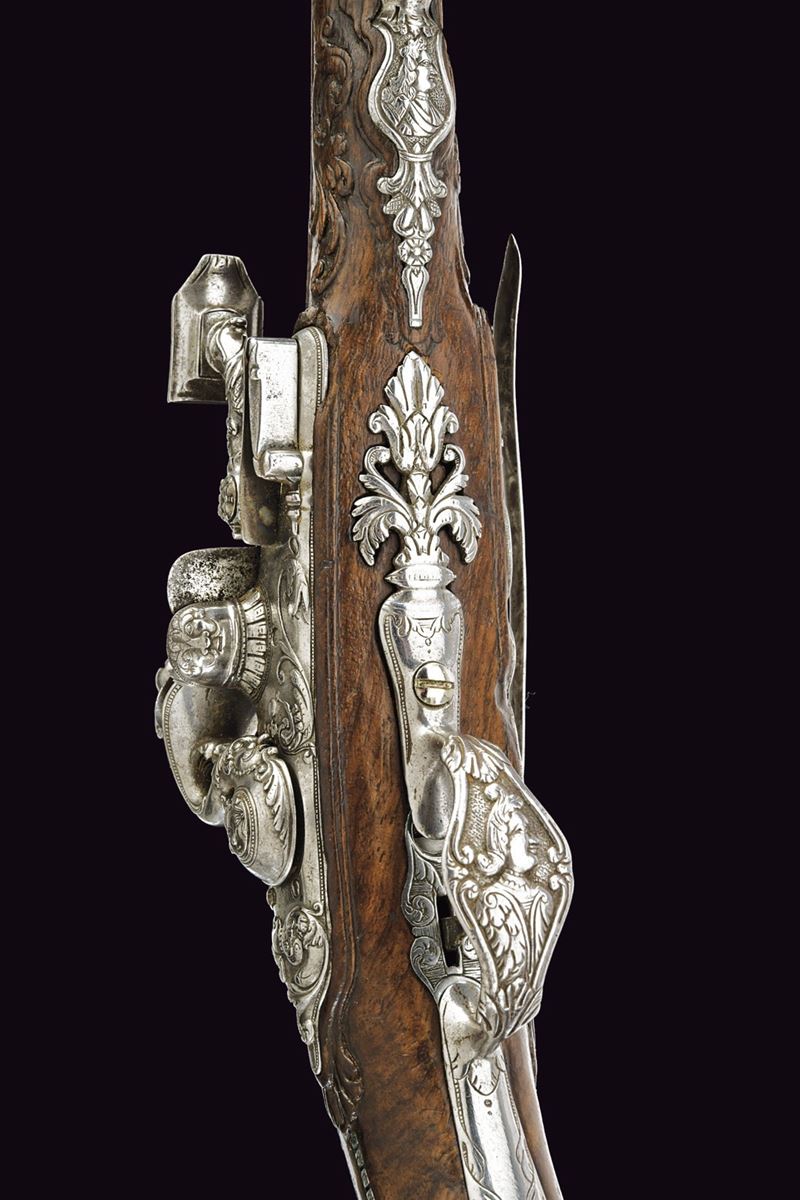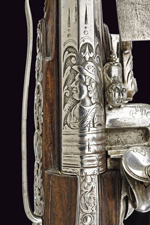 Canna liscia a due ordini, quadra e tonda, al cambio anellature lisce, sgusciate e perlinate; a sezione leggermente rastremata verso la volata; alla camera di scoppio cornicette e raffigurazione di busto all'antica su fondo granulato; cal. 11 mm. Batteria a pietra focaia alla fiorentina, cartella con fini intagli in bassorilievo effigianti figure antropomorfe e grottesche; collo del cane e della martellina maestosamente operati a mascheroni, volute e grottesche; copriscodellino scorrevole; internamente firmata "BB". Cassa intera in legno scolpito al fusto. Fornimenti in acciaio ben incisi e cesellati in bassorilievo a mascheroni, grottesche, busti e volute floreali; la contropiastra messa a giorno. Gancio da cintura in ferro. Bacchetta in legno con cavastracci in ferro e battipalla in corno.