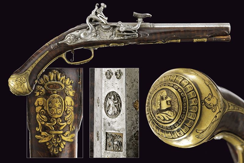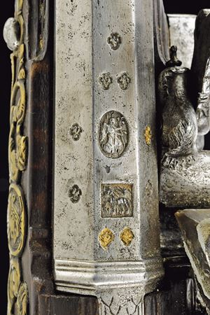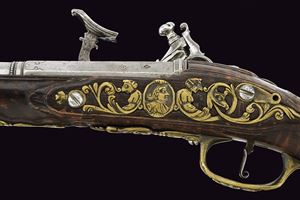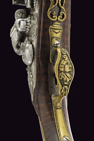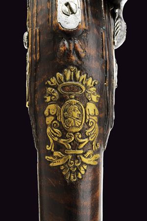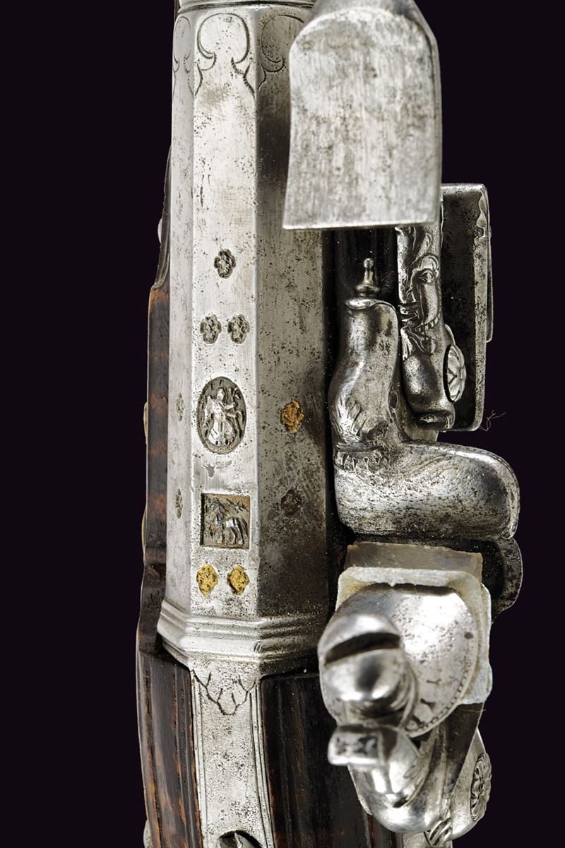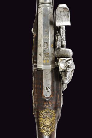 Cana liscia a due ordini, quadra e tonda con cornicette al cambio e alla culatta; sulla parte quadra marche e contromarca di armaiolo tra nove gigli dorati; cal. 13.5 mm. Codetta incisa. Batteria alla fiorentina, con cartella semi-bombata, ornata da figure in bassorilievo nella parte centrale e un bel mascherone nella coda; collo del cane, molla e martellina anch'esse incise e cesellate. Cassa intera in acero venato. Sull'impugnatura un bello scudetto con un bustino fra due sfingi e sotto grottesche. Bacchetta in legno con battipalla in corno.