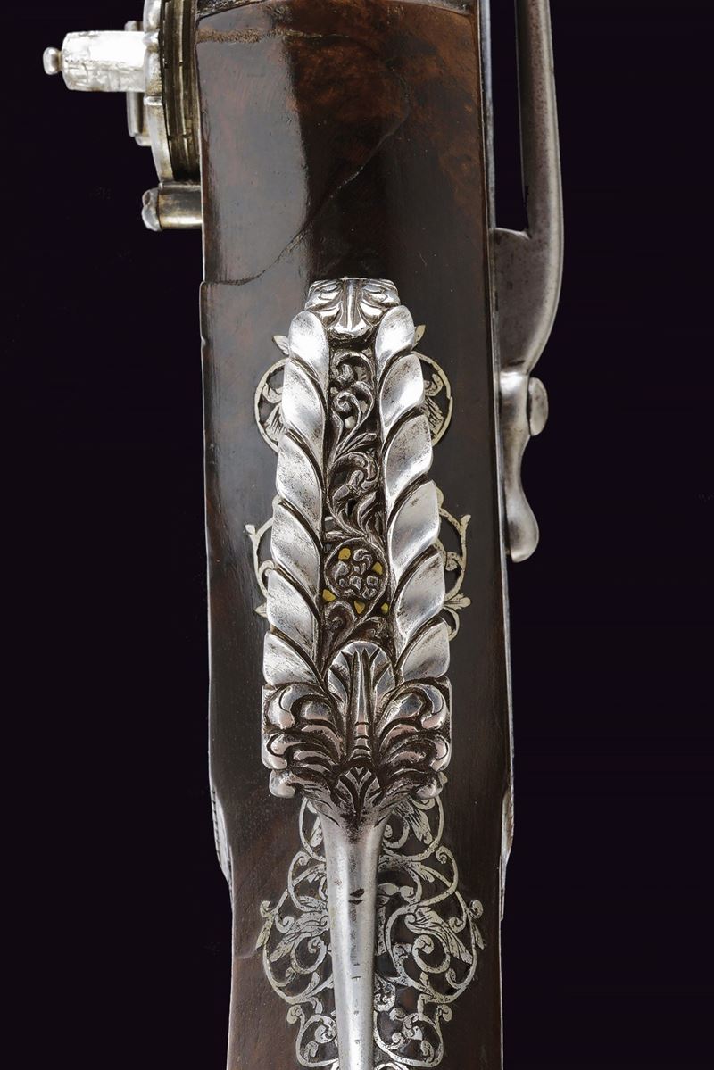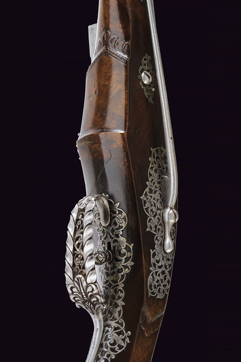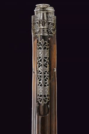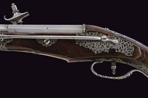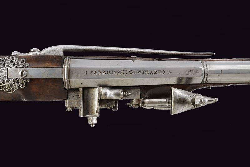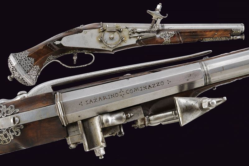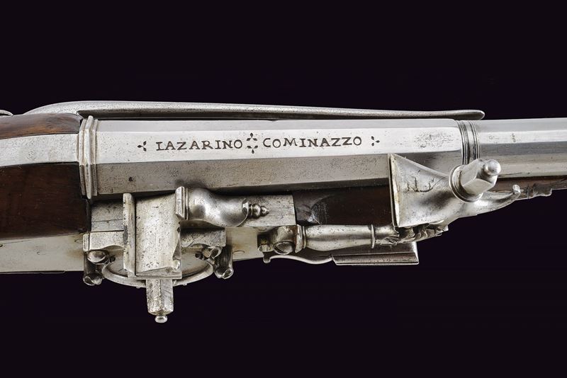 Canna liscia a due ordini, quadra e faccettata con anellature al cambio e cornicette alla culatta e alla gioa di bocca, firmata in stampatello sulla camera di scoppio "LAZARINO COMINAZZO"; cal. 13 mm; due due danni da ruggine alla volata. Piastra a ruota con cartella liscia e alla coda con un fiore stilizzato, ruota esterna con copri ruota intagliato, cane con collo a balaustro anch'esso operato ad intaglio; all'interno la marca tonda con le iniziali "BP" (probabilmente attribuibile a Bernardo Paratici). Cassa intera in noce (antica riparazione al termine del fusto) con bellissimi fornimenti in acciaio intagliati e messo a giorno; di particolare rilievo il ponticello e la bella coccia di forma a mezzo tondo, messa a giorno e munita di bottone. Grilletto a balaustro. Gancio da cintura. Bacchetta in legno con battipalla tornito ed intagliato.