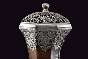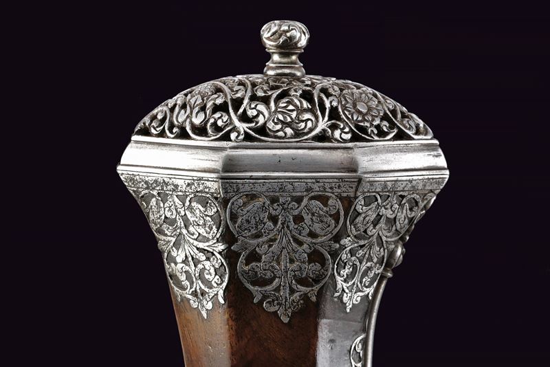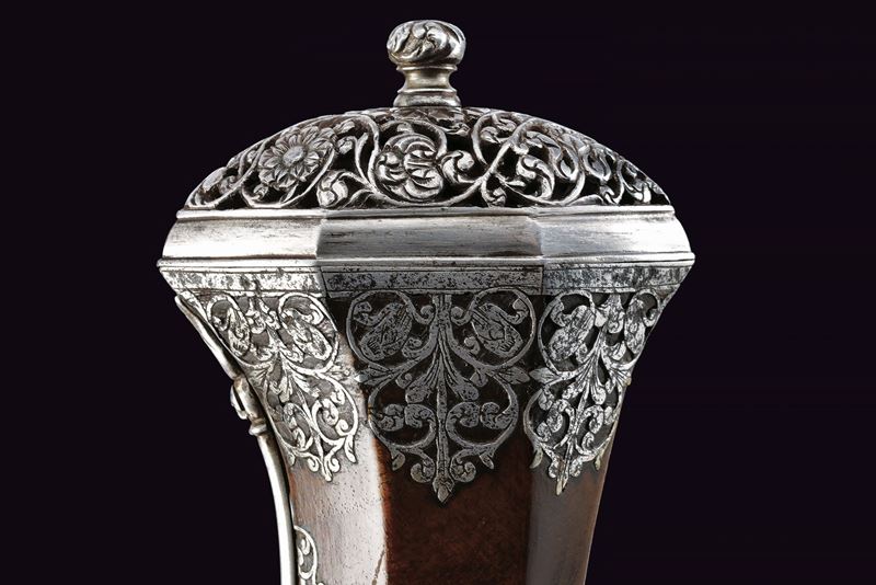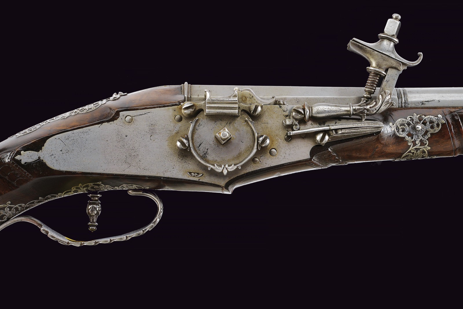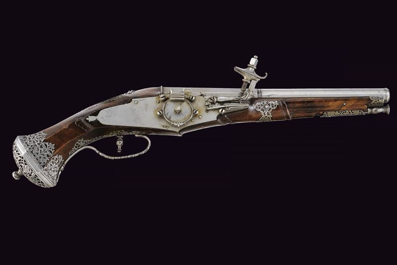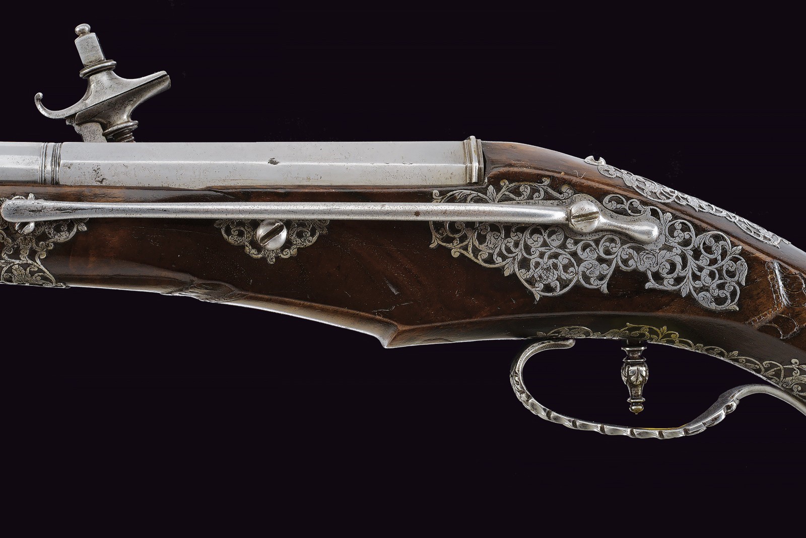 Canna liscia a due ordini, quadra e faccettata con anellature al cambio e cornicette alla culatta e alla gioa di bocca, firmata in stampatello sulla camera di scoppio "LAZARINO COMINAZZO"; cal. 13 mm; due due danni da ruggine alla volata. Piastra a ruota con cartella liscia e alla coda con un fiore stilizzato, ruota esterna con copri ruota intagliato, cane con collo a balaustro anch'esso operato ad intaglio; all'interno la marca tonda con le iniziali "BP" (probabilmente attribuibile a Bernardo Paratici). Cassa intera in noce (antica riparazione al termine del fusto) con bellissimi fornimenti in acciaio intagliati e messo a giorno; di particolare rilievo il ponticello e la bella coccia di forma a mezzo tondo, messa a giorno e munita di bottone. Grilletto a balaustro. Gancio da cintura. Bacchetta in legno con battipalla tornito ed intagliato.
