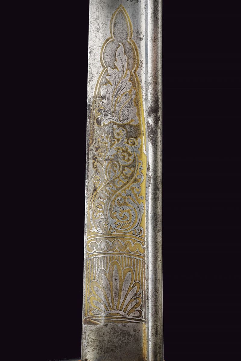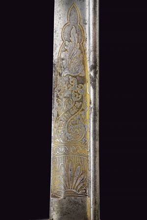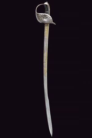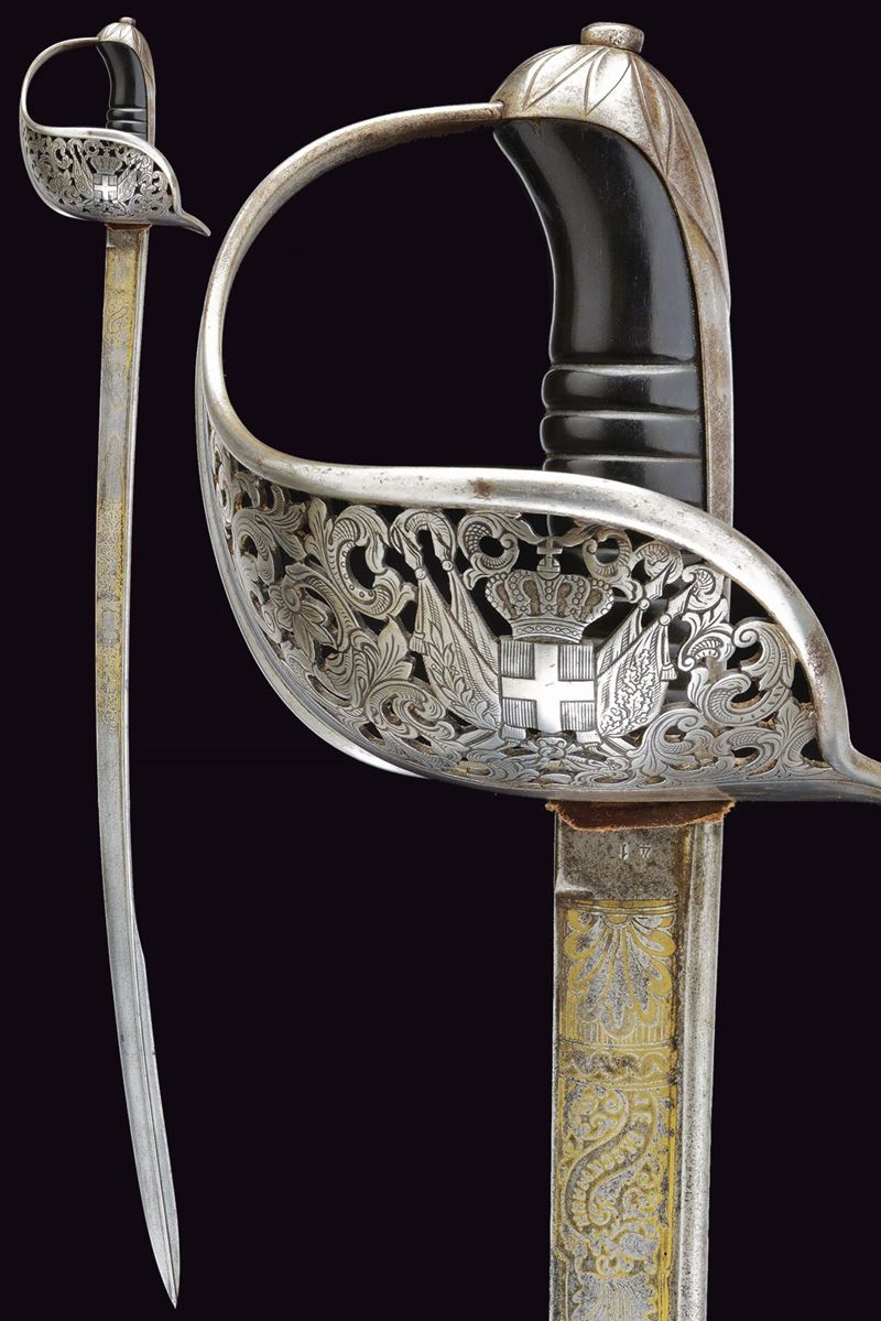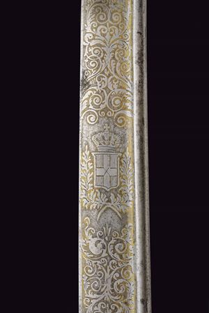 Lama curva a un filo con jelman, finemente incisa e dorata nella prima metà, recante stemma sabaudo sotto corona fra volute, la base firmata "J. E. BLECKMANN" e "SOLINGEN". Fornimento in ferro con vela riccamente traforata, al centro lo stemma sabaudo sotto corona e fra bandiere incorniciate da decorazioni floreali. Alla base monogramma "S. G." Cappetta lunga con scanalatura al pomo. Impugnatura in legno a spire. Priva di fodero.
