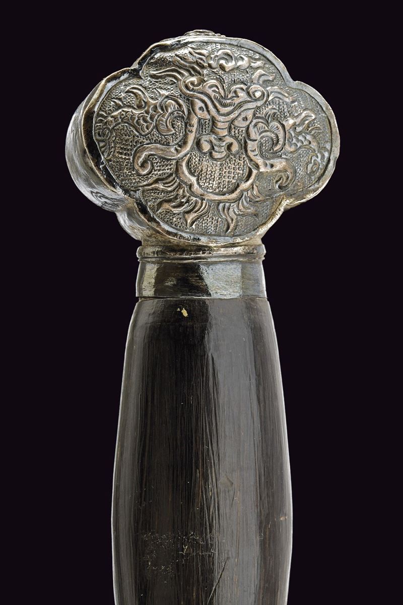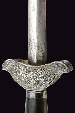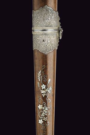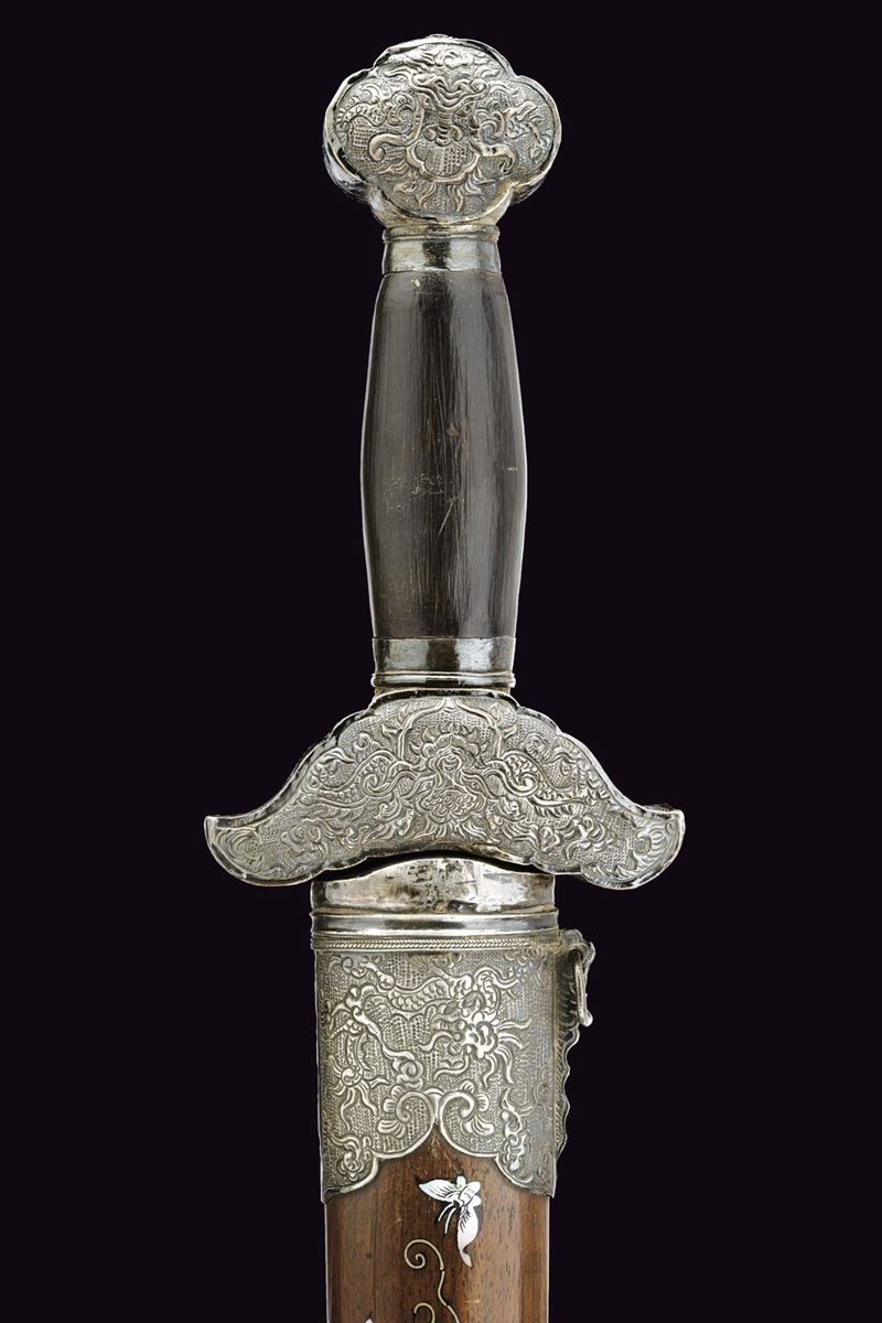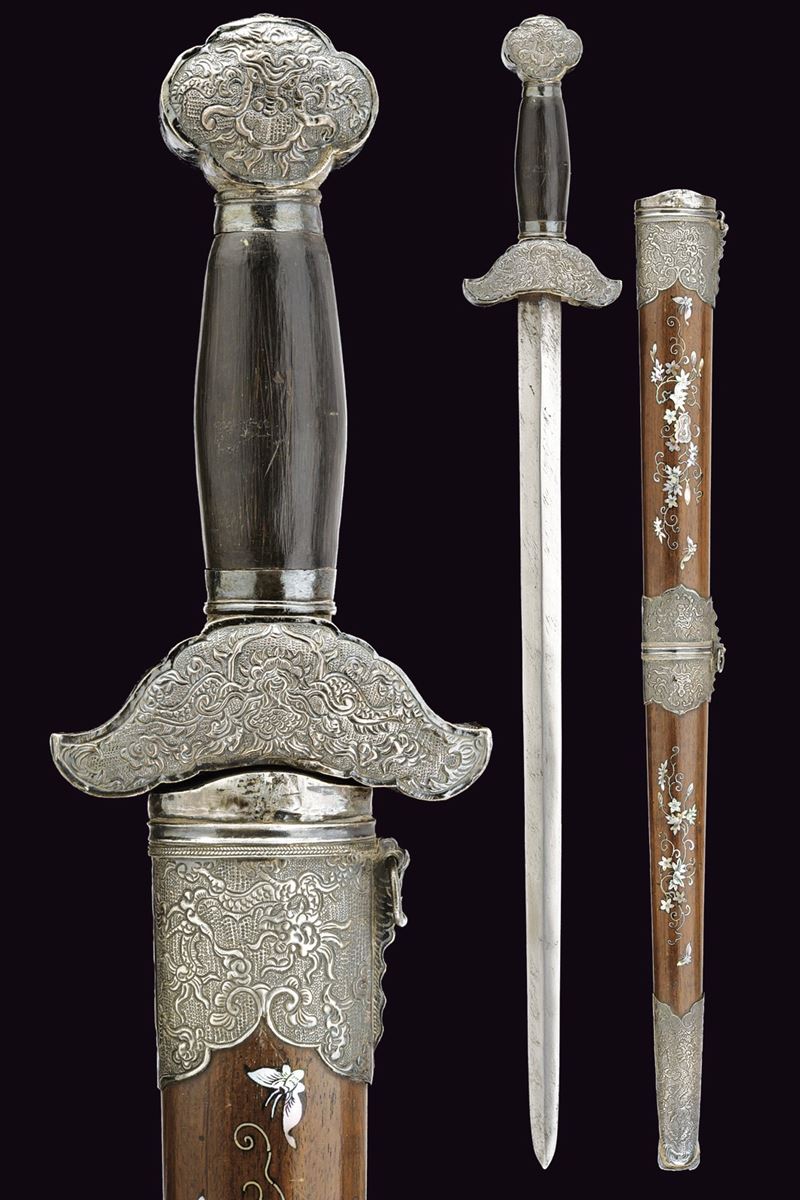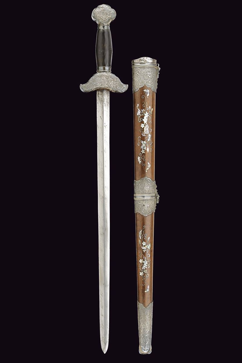 Lama dritta a due fili costolata in mezzeria. Impugnatura in legno. Elso e pomo in argento sbalzati ed incisi, decorati a draghi su fondo granulato. Fodero in legno con raffinate tarsie floreali in madreperla e con fornimenti in argento, incisi con draghi e a motivi floreali su fondo granulato, due anelli di sospensione.
