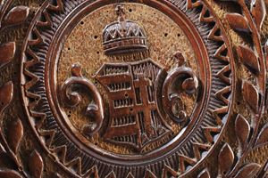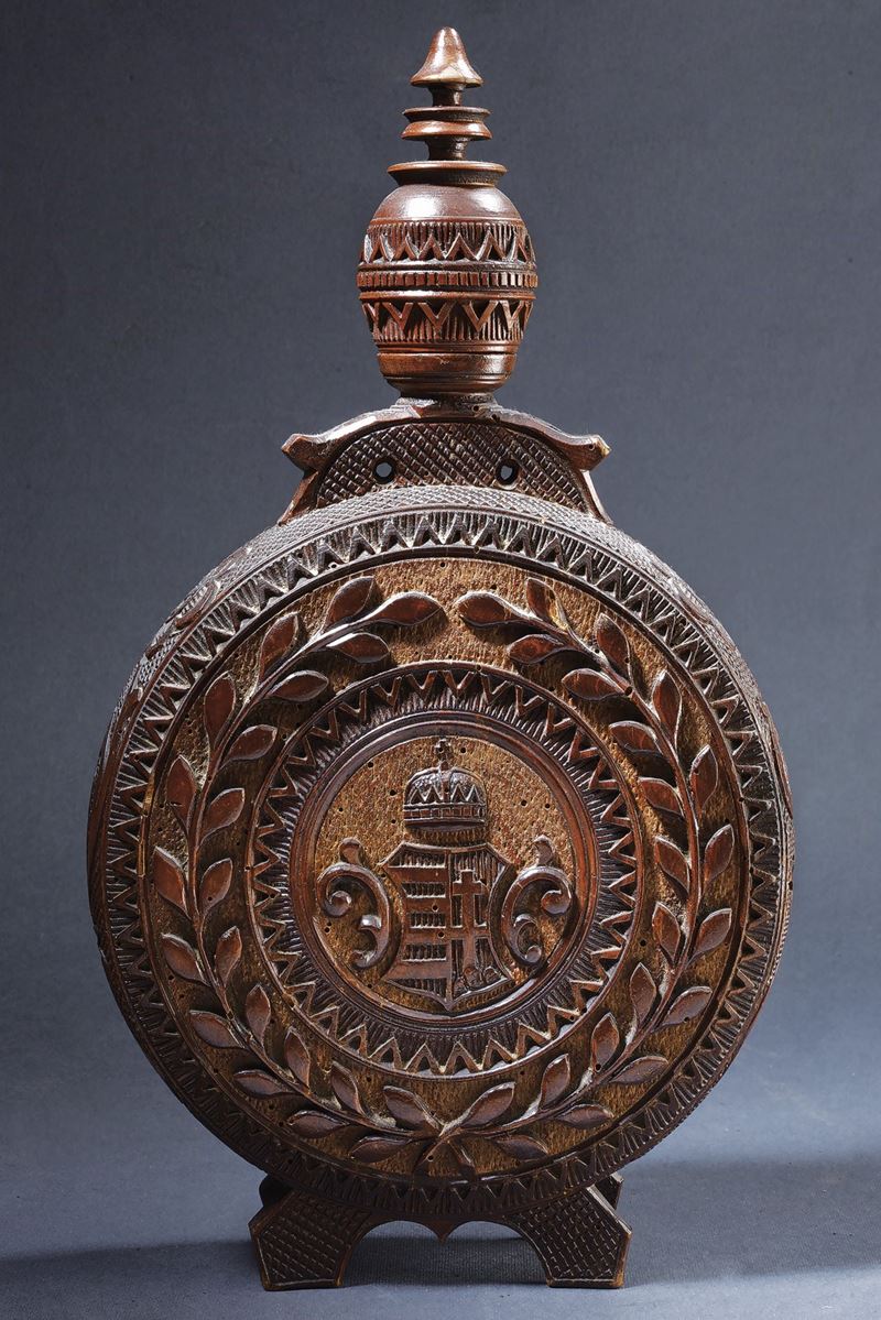 In legno di forma circolare completamente scolpito in alto e bassorilievo. Su un lato lo stemma reale ungherese sotto la corona di Santo Stefano e circondato da fronde d'alloro. La parte opposta decorata en suite e con il monogramma "WJ" del proprietario al centro. Qualche buco di tarlo. Completo di tappo.
