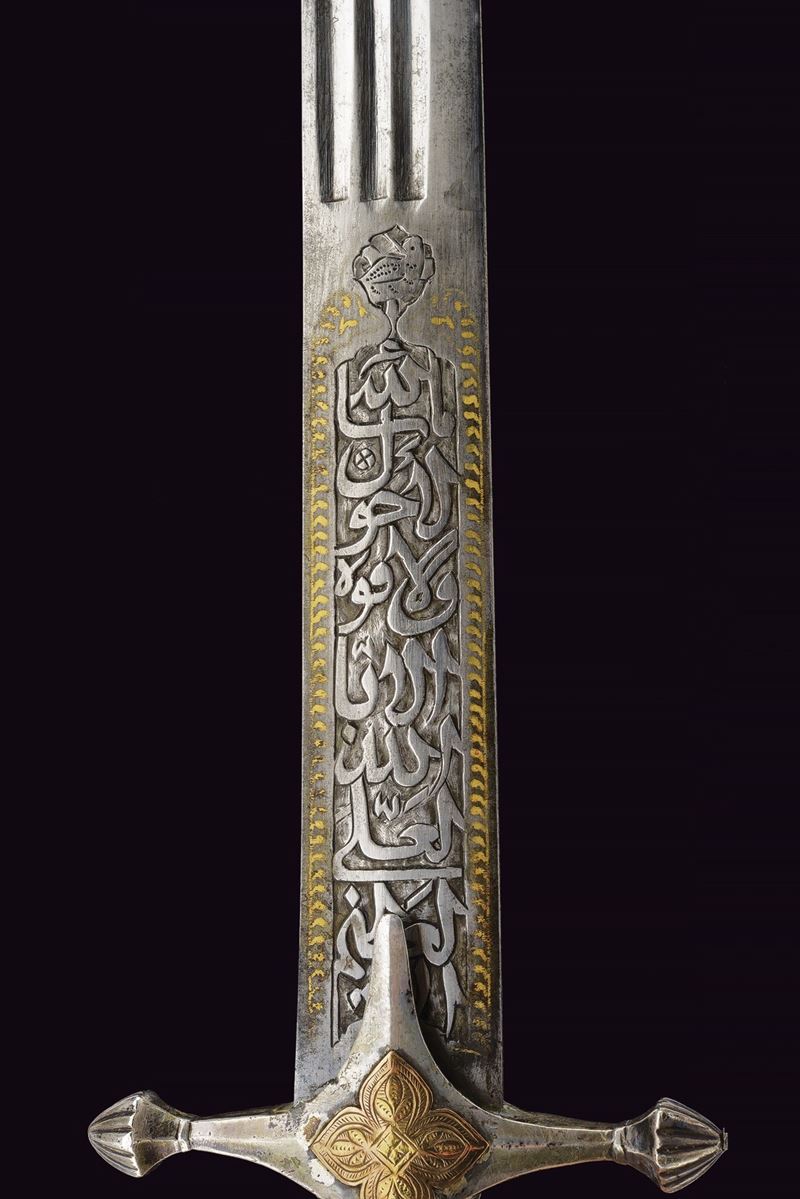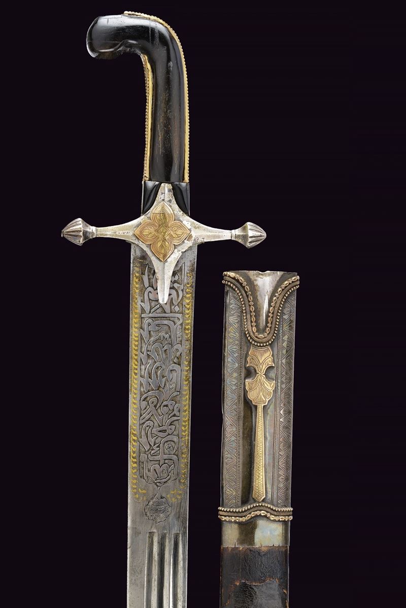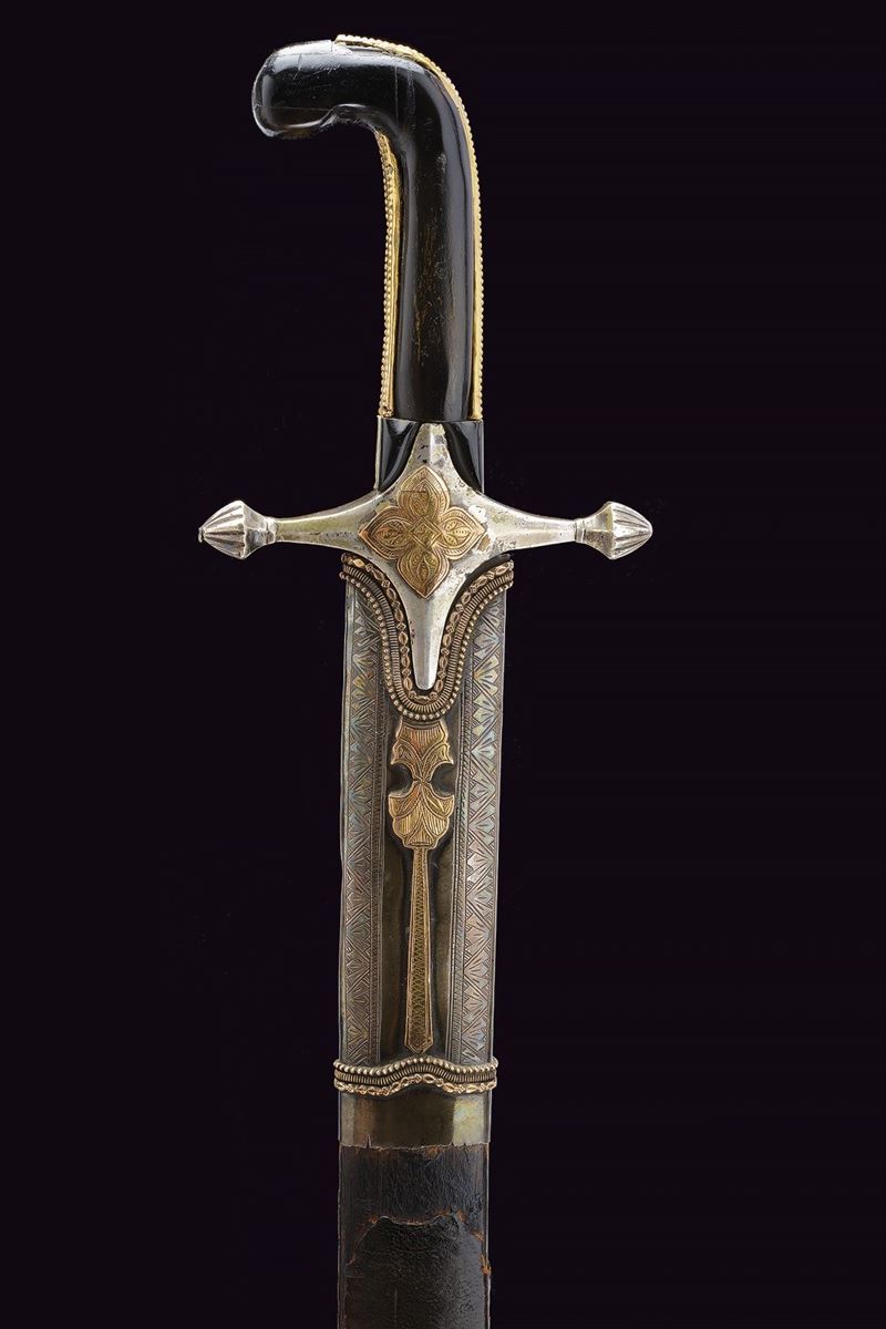 Larga lama solo lievemente curva con triplice scanalatura, la base sul lato di terza con iscrizione in Arabo in bassorilievo con una cornice in oro, il lato opposto con due cartigli recante una iscrizione in Arabo e un leone stilizzato, resti di doratura. Fornimento con elso a croce in argento, sul massello una placca in oro inciso a motivi floreali (piccolo restauro), fornimento angolato con fascia in oro traforato (piccola mancanza), la base con placca in osso. Fodero in legno rivestito di cuoio (mancano le due fasce con anello di sospensione) con due fornimenti in argento inciso a motivi floreali e geometrici, la cappa anche decorata con una placca e una cornice in oro su entrambi i lati. Piccoli difetti. Molto raro.