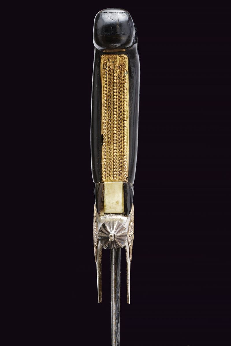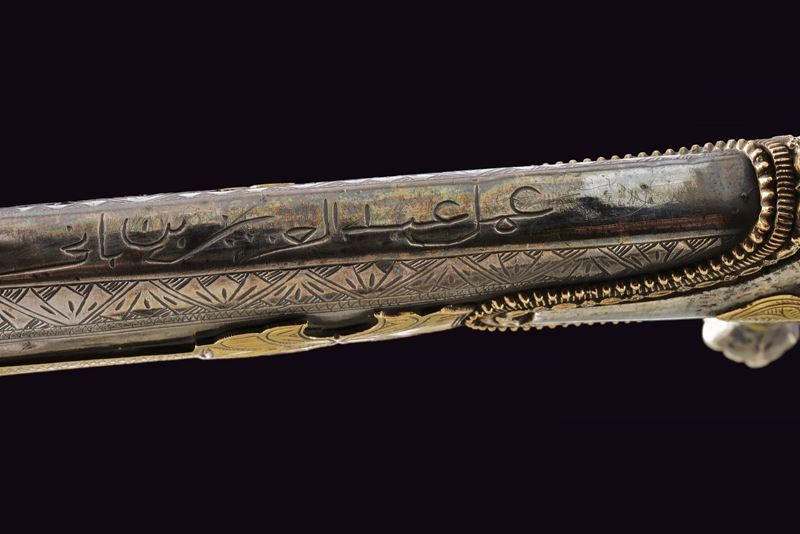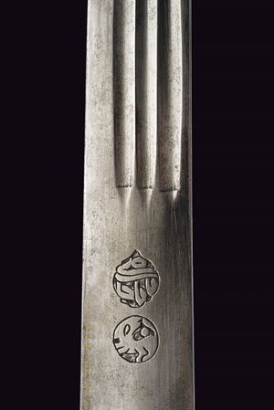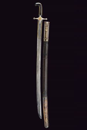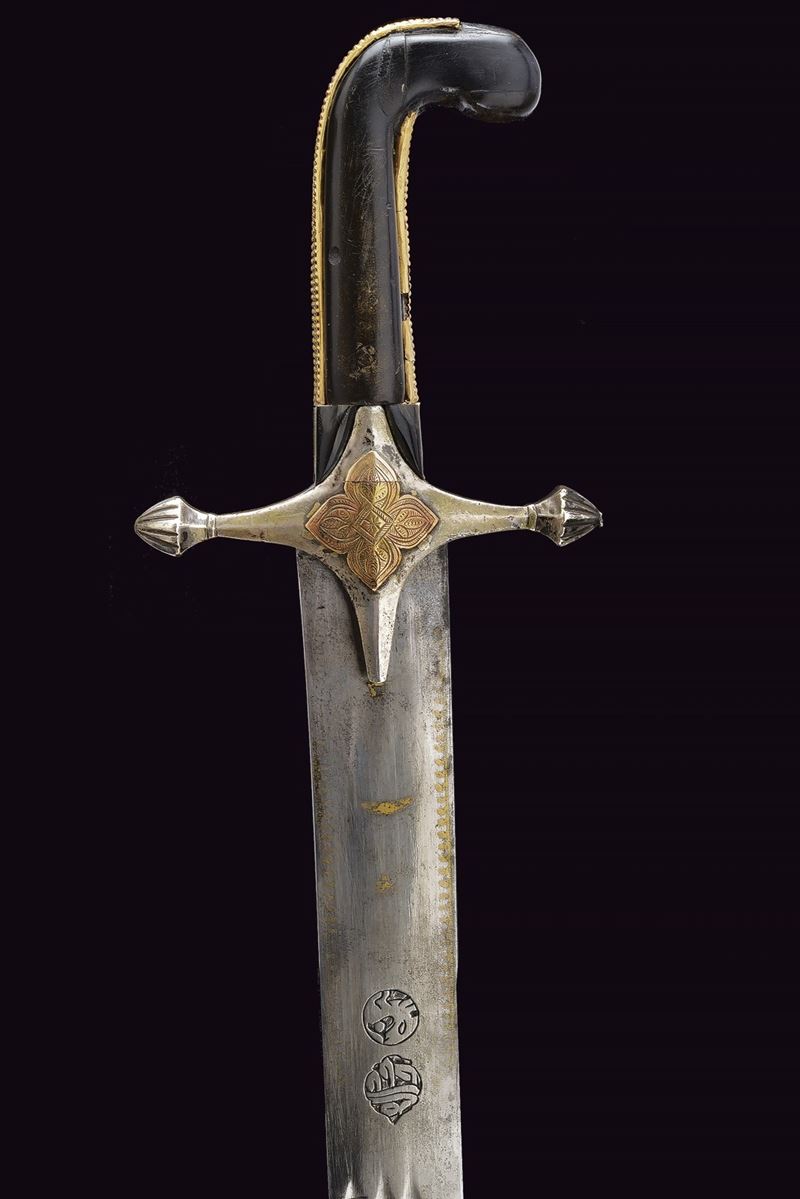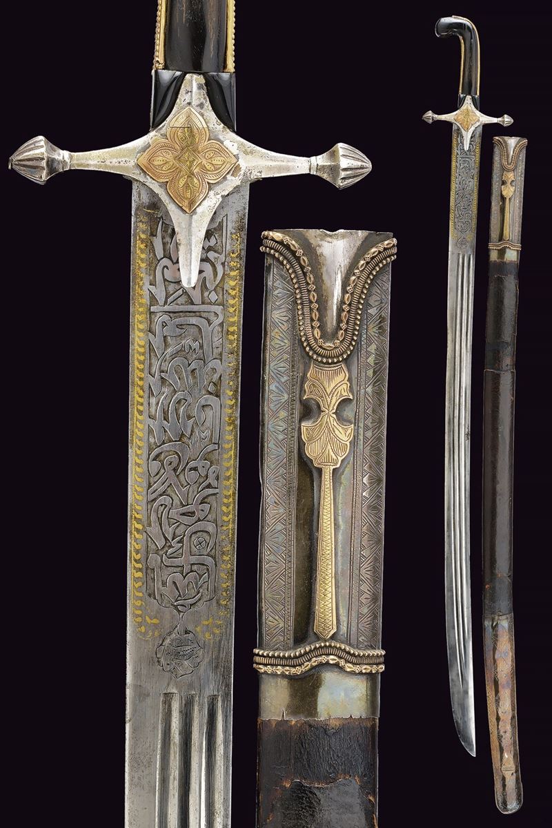Larga lama solo lievemente curva con triplice scanalatura, la base sul lato di terza con iscrizione in Arabo in bassorilievo con una cornice in oro, il lato opposto con due cartigli recante una iscrizione in Arabo e un leone stilizzato, resti di doratura. Fornimento con elso a croce in argento, sul massello una placca in oro inciso a motivi floreali (piccolo restauro), fornimento angolato con fascia in oro traforato (piccola mancanza), la base con placca in osso. Fodero in legno rivestito di cuoio (mancano le due fasce con anello di sospensione) con due fornimenti in argento inciso a motivi floreali e geometrici, la cappa anche decorata con una placca e una cornice in oro su entrambi i lati. Piccoli difetti. Molto raro.