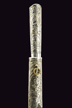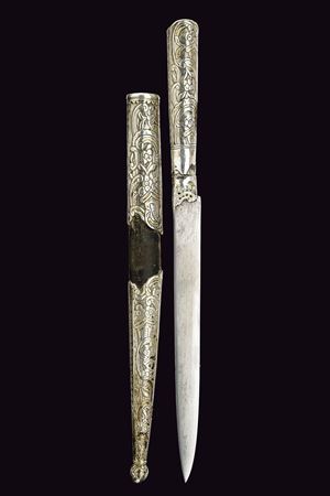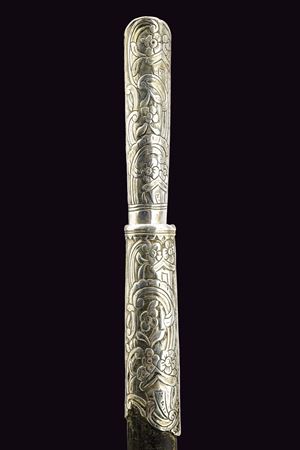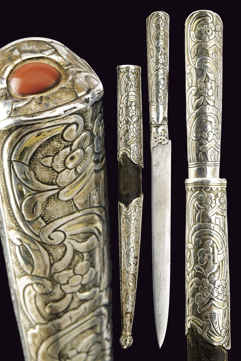 Lama dritta, piatta e a un filo. Impugnatura rivestita in argento inciso a motivi floreali, la sommità con pietra color rosso chiaro. Fodero in legno rivestito in pelle e con fornimenti in argento incisi en suite. Anello di sospensione in ottone.