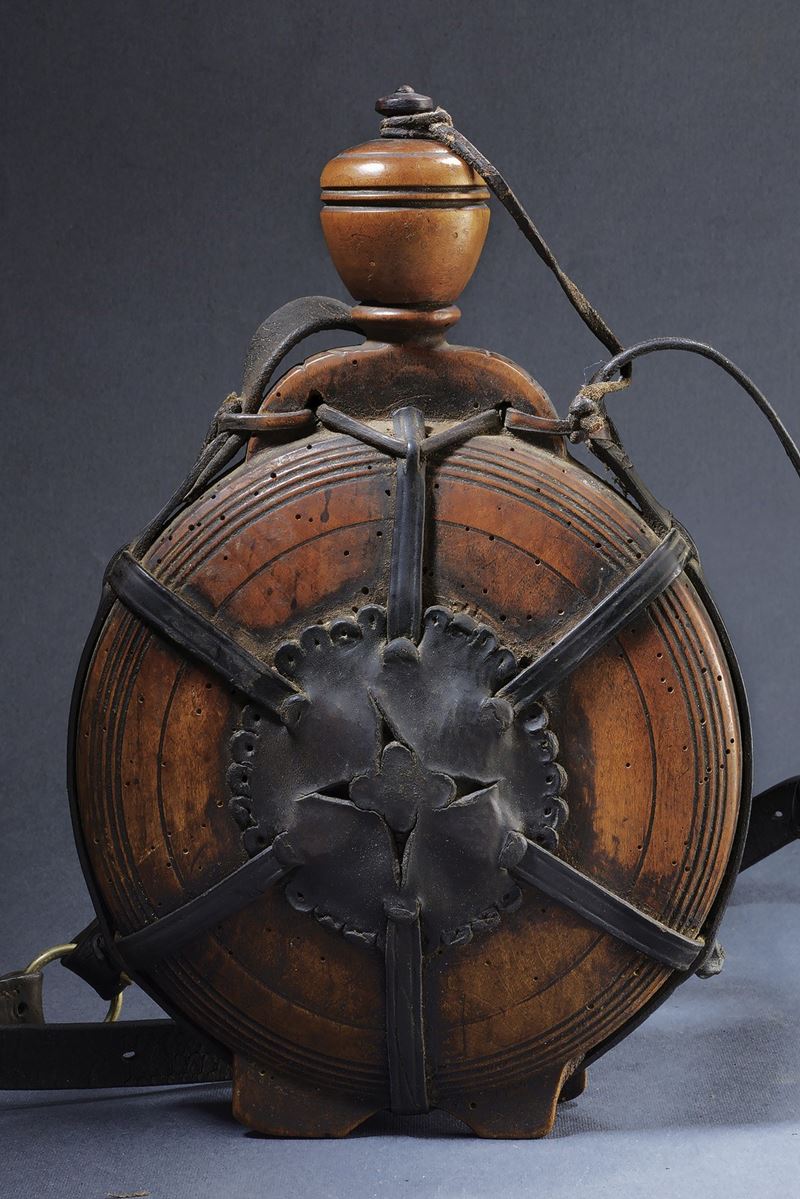 Corpo in legno tornito completo di tappo. Tracce di tarlo. Le cinghie in cuoio a raggi e completa di tracolla.