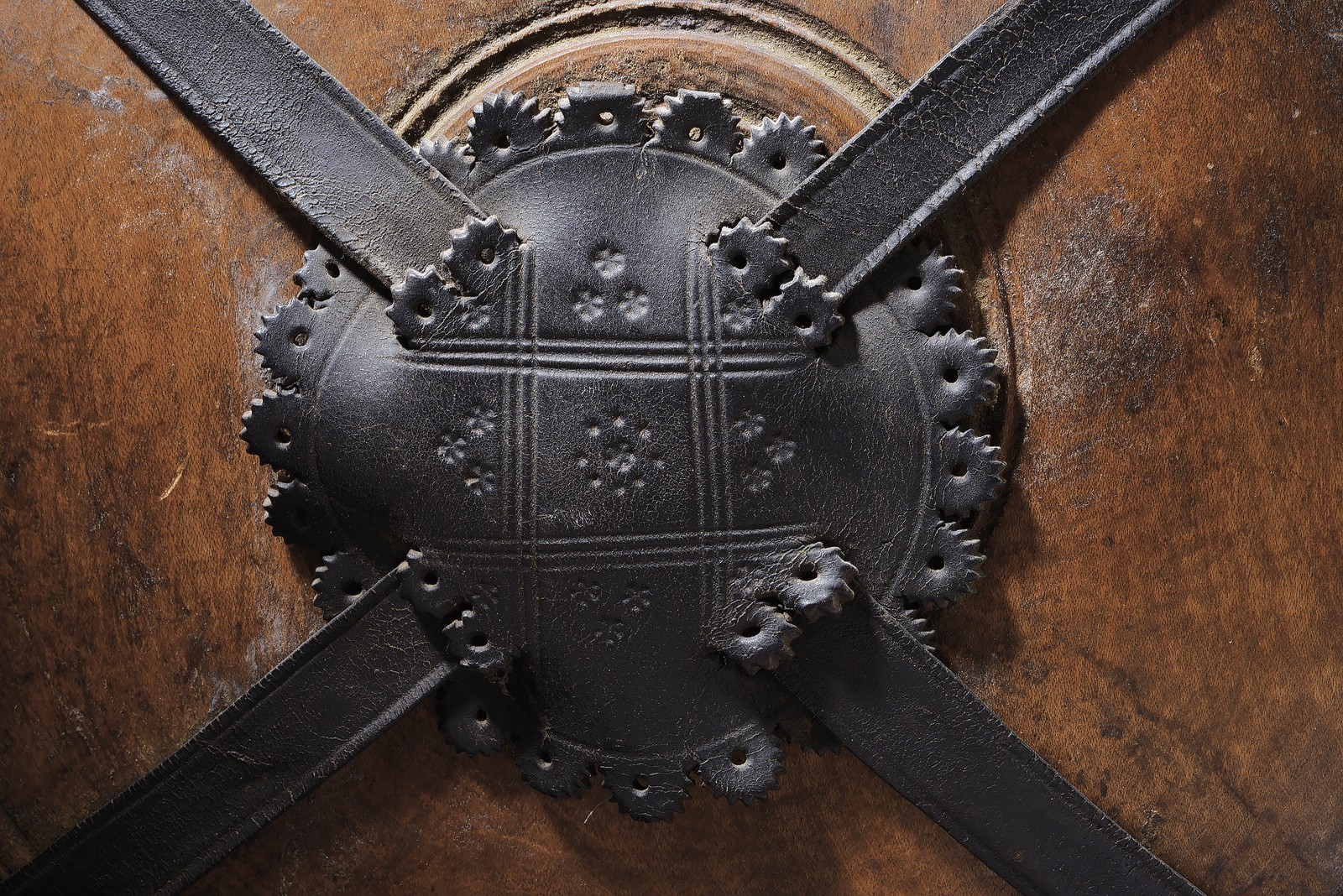 Grande corpo in legno tornito ed inciso completo di tappo. Le cinghie in cuoio a "X". Intagliato al bordo e con impressioni al centro. Completa di tracolla. Rara per la grandezza.