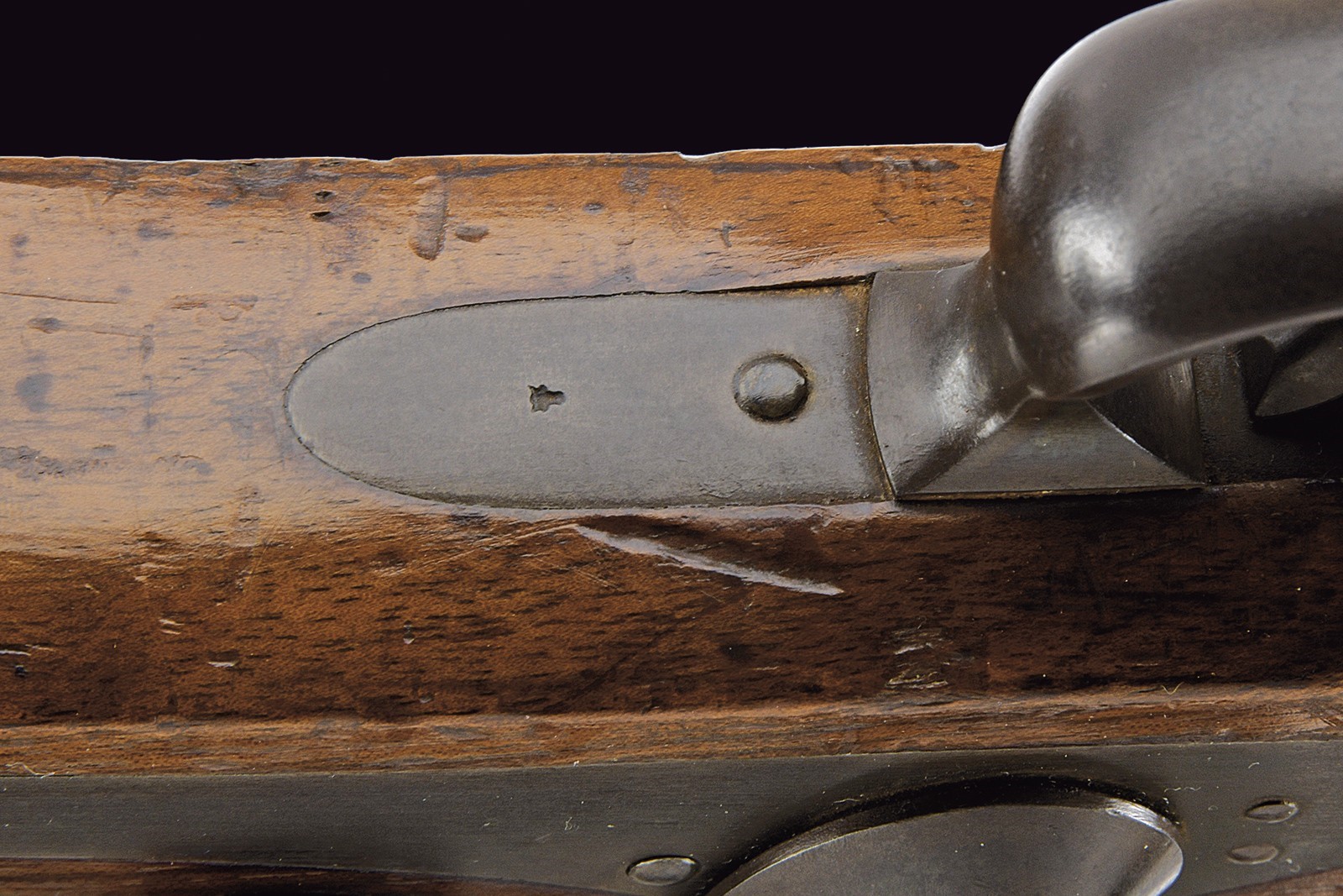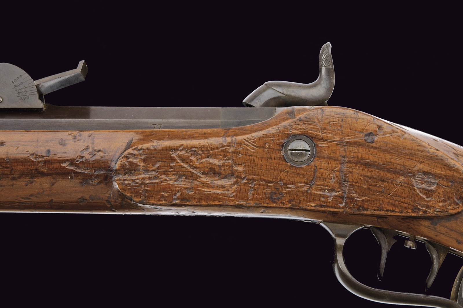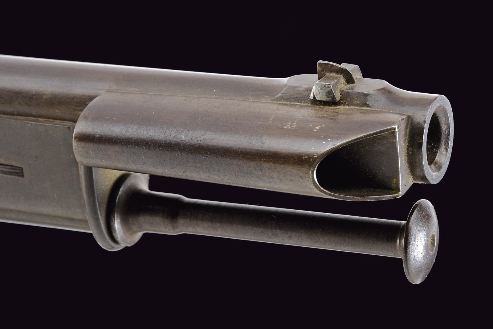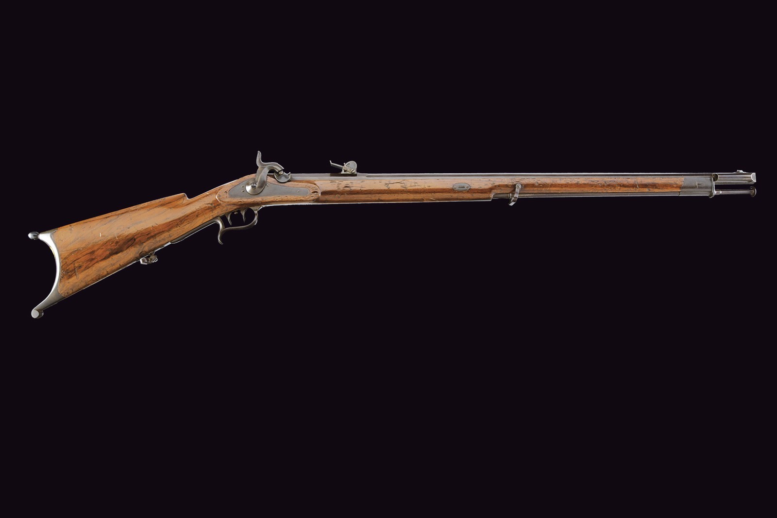 Canna tonda, brunita e rigata, con camera di scoppio quadra firmata "KOHLER A BOUDRY"; alzo abbattibile e regolabile, guida d'innesto per la baionetta e mirino di precisione; cal. 10 mm. Lunga codetta liscia e brunita. Batteria a molla in avanti, con cartella piatta e brunita, cosi come anche il cane. Cassa intera Inn legno, segni d'uso e del tempo; timbro piemontese nella parte opposta alla batteria e dietro al codolo posteriore del ponticello. Fornimenti in ferro brunito. Stecher con meccanica da rivedere. Bacchetta in ferro.