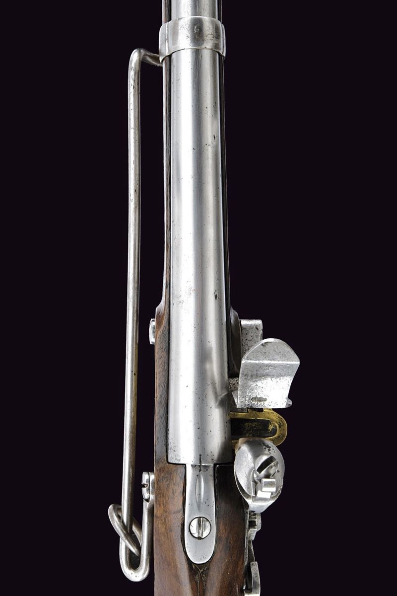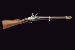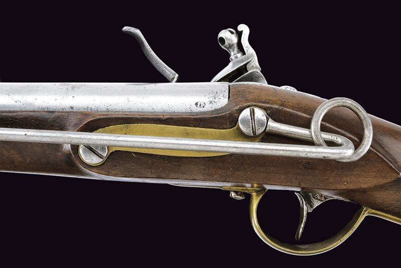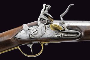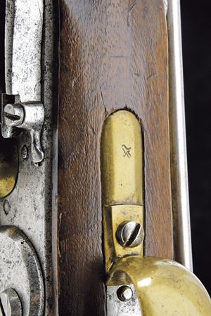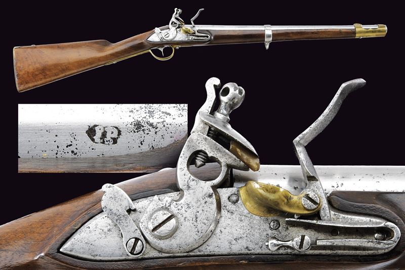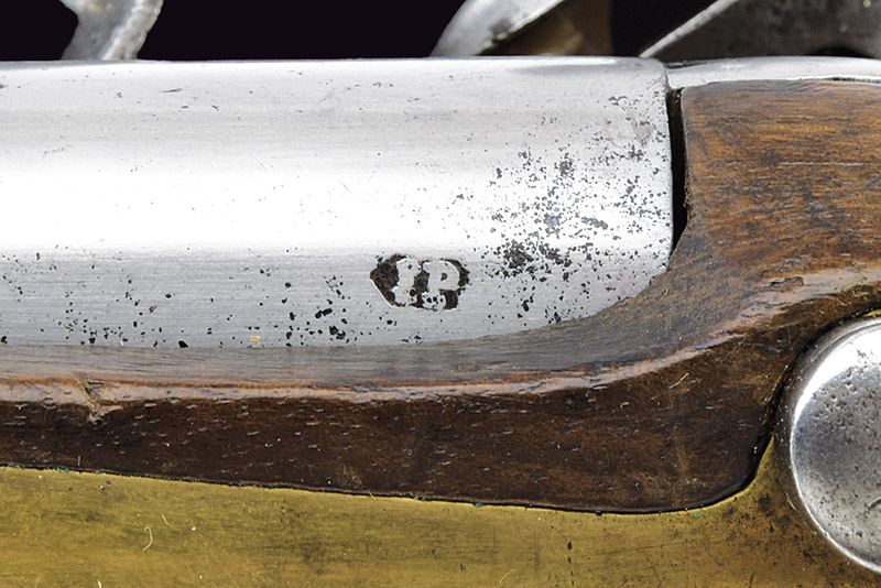 Canna tonda, liscia, con fianchi lievemente appiattiti alla culatta e punzone "IP"; calibro 17,6 mm. Codetta con traguardo. Batteria a pietra focaia con cartella piatta, provvista di sicura; scodellino in ottone. Cassa intera in legno con fornimenti in ottone (punzoni). Reggicanna con mirino. Barra da sella con anello e relativa fascetta in ferro. Molto rara.