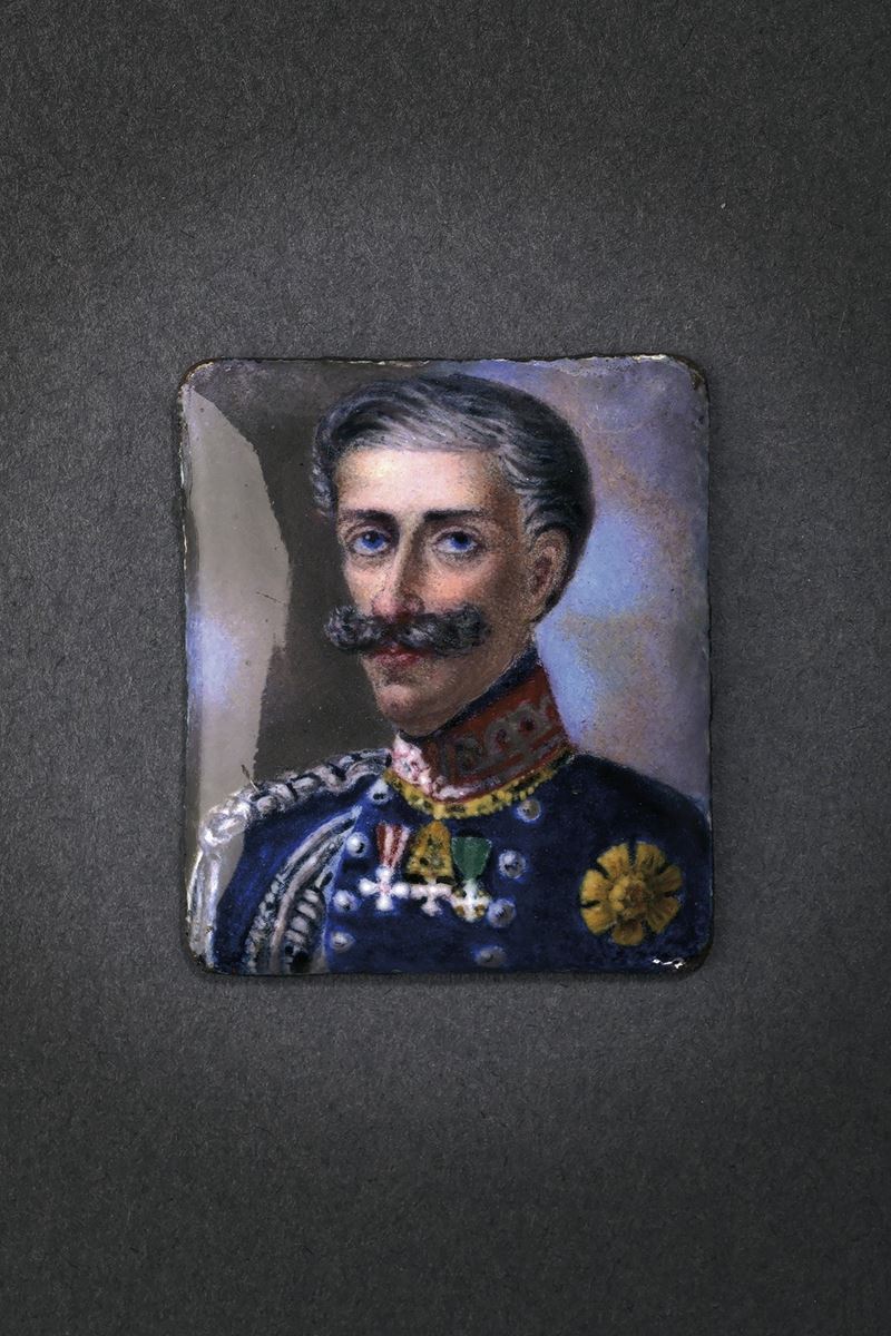 Miniatura in smalto policromo su rame. Ritratto del re in uniforme da generale dell’Esercito di Sardegna. Sull’uniforme porta il piccolo collare e la placca dell’Ordine Supremo della Santissima Annunziata, la croce dell’Ordine Militare di Maria Teresa (Austria), la croce dell’Ordine di San Giorgio (Russia) e la croce dell’Ordine dei Santi Maurizio e Lazzaro.
