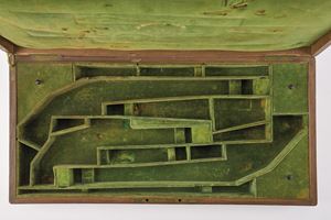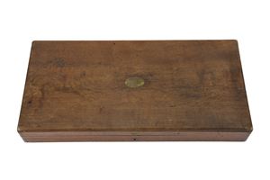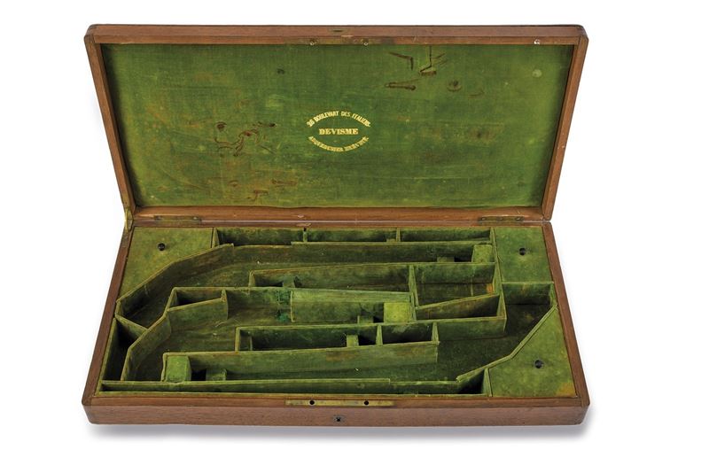 In legno (piccoli difetti e mancanze), il coperchio con placca ellittica in ottone; internamente rivestita in velluto verde (alcune zone lise), con stampigliatura in oro "26 BOULEVART DES ITALIENS / DEVISME / ARQUEBUSIER BREVETE"; numerosi alloggiamenti per vari strumenti ed accessori, due scompartimenti per pistole a pietra focaia, di notevole lunghezza, probabilmente pistole di produzione francese per il mercato orientale. Alcuni segni del tempo.
