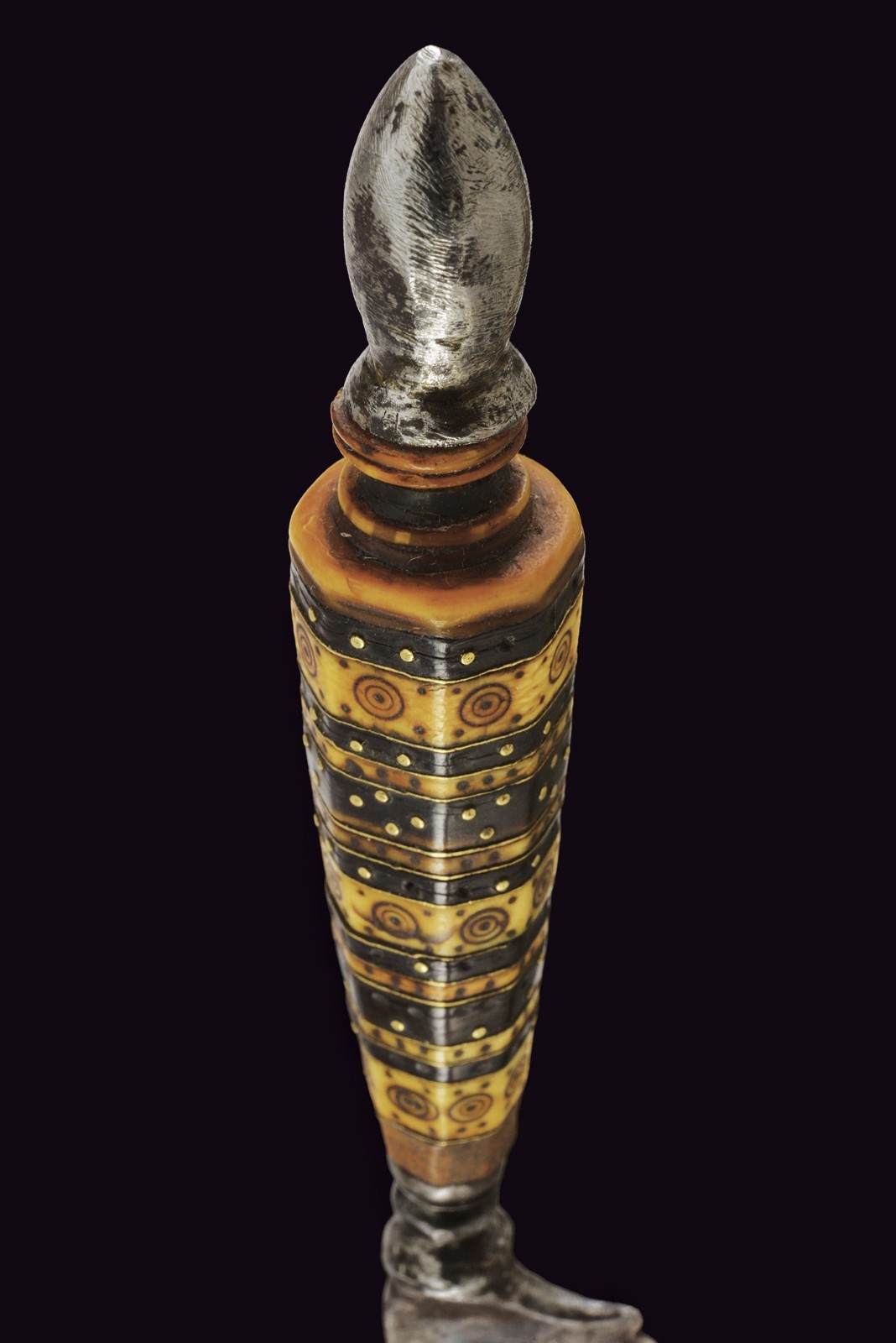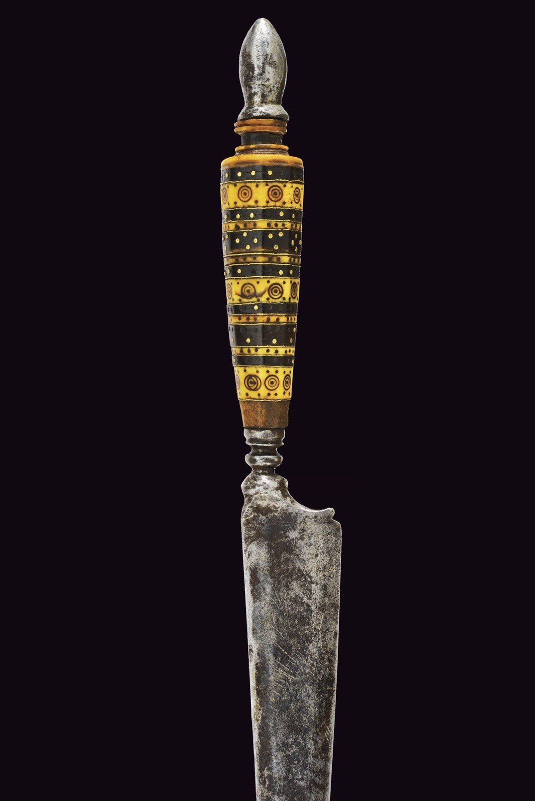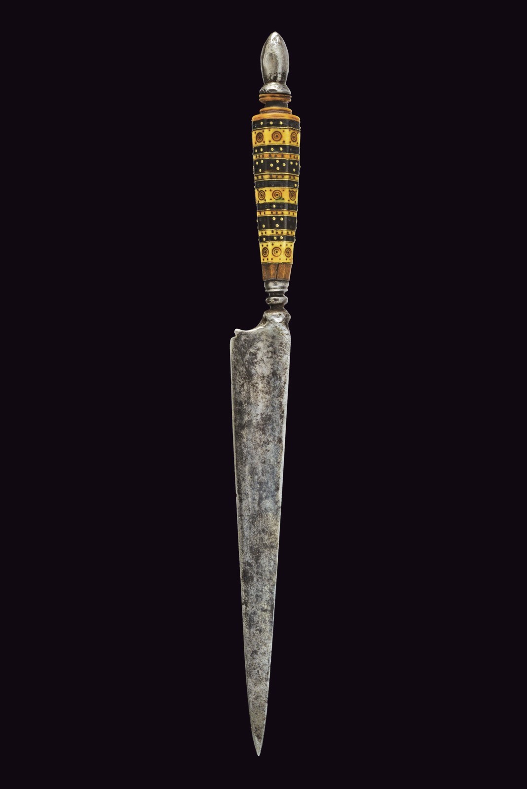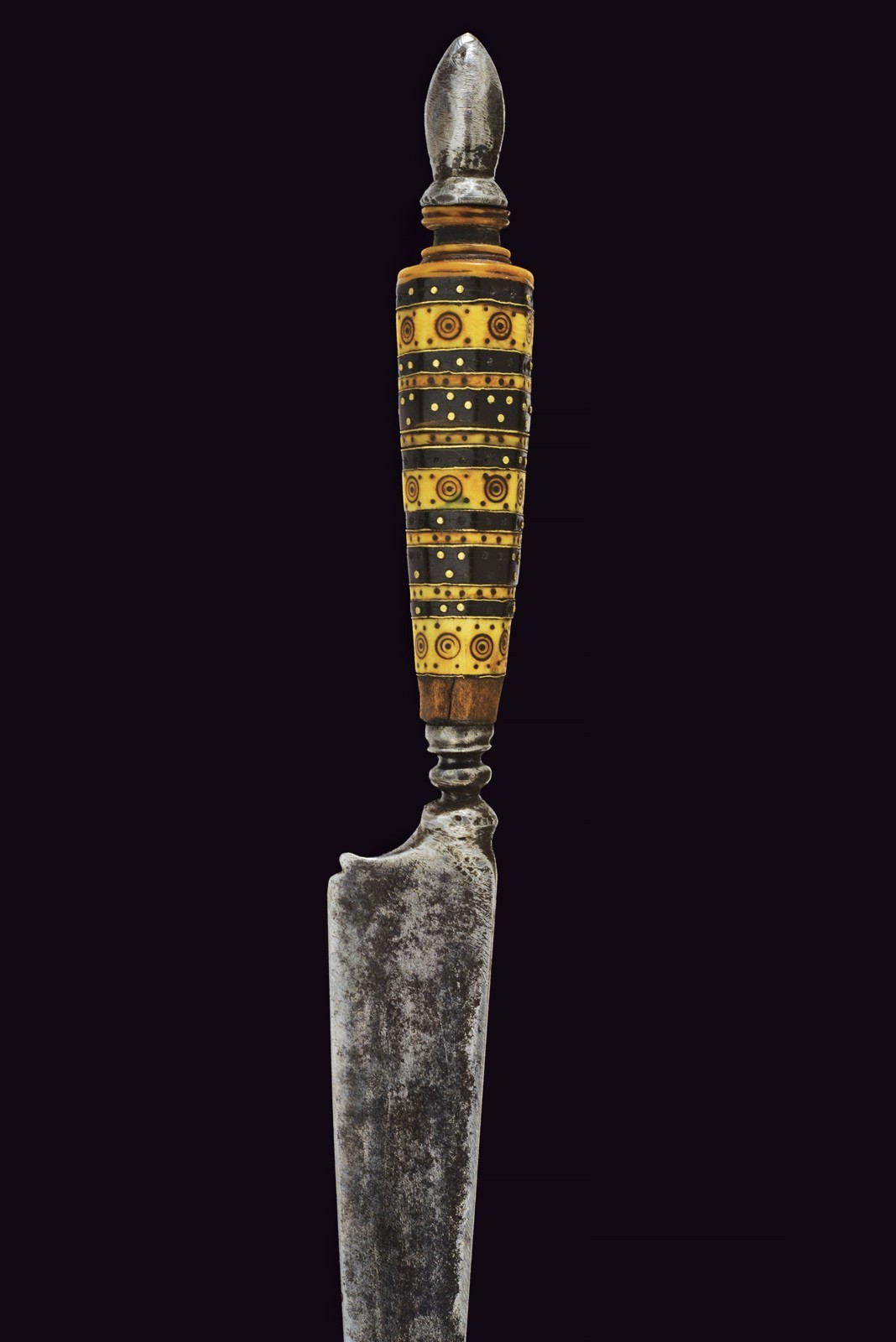 Lama triangolare a un filo, con duplice nodo a cuscino schiacciato e cornicetta scanalata. Impugnatura a crescere, faccettata e composta da settori alterni in osso, ornato a cerchietti e puntinature, alternati da altri in corno nero, ornati da chiodini in argento. Cappetta in osso tornito terminante con un pomellino ogiva in ferro. Piccole mancanze.