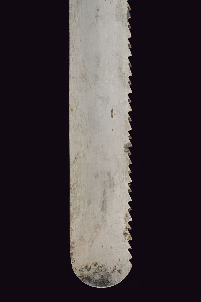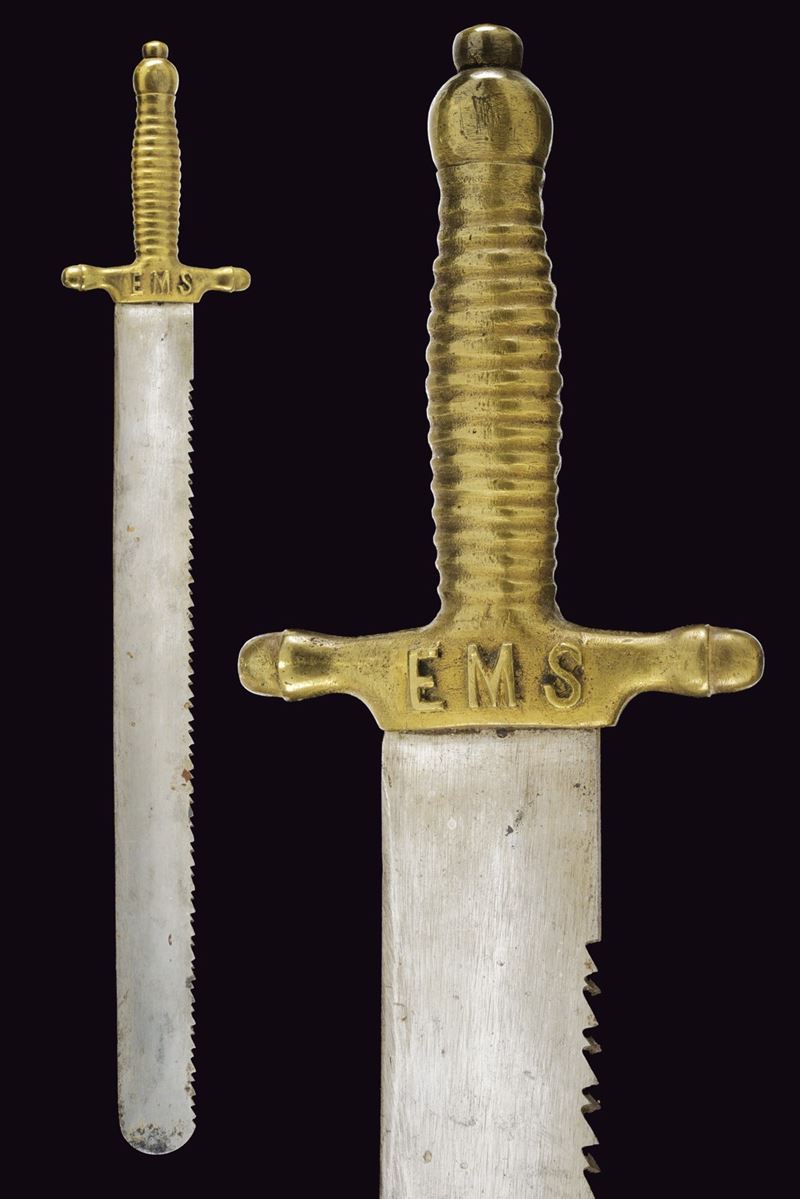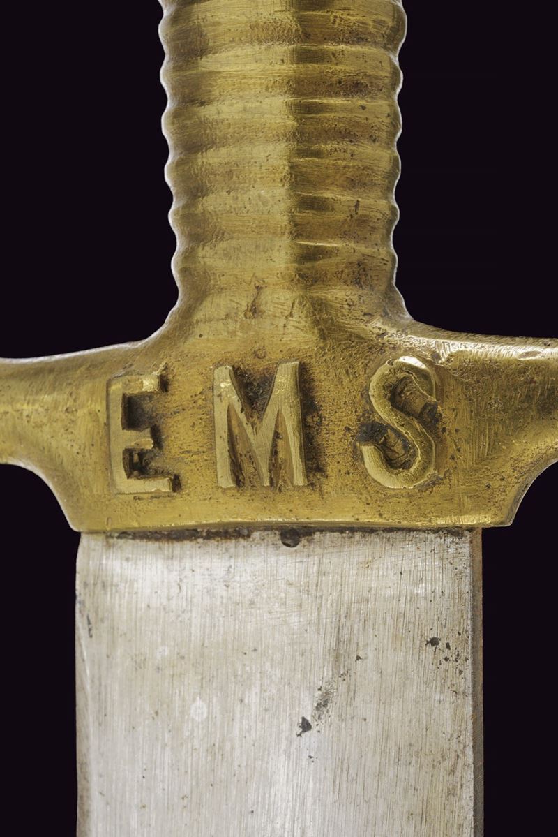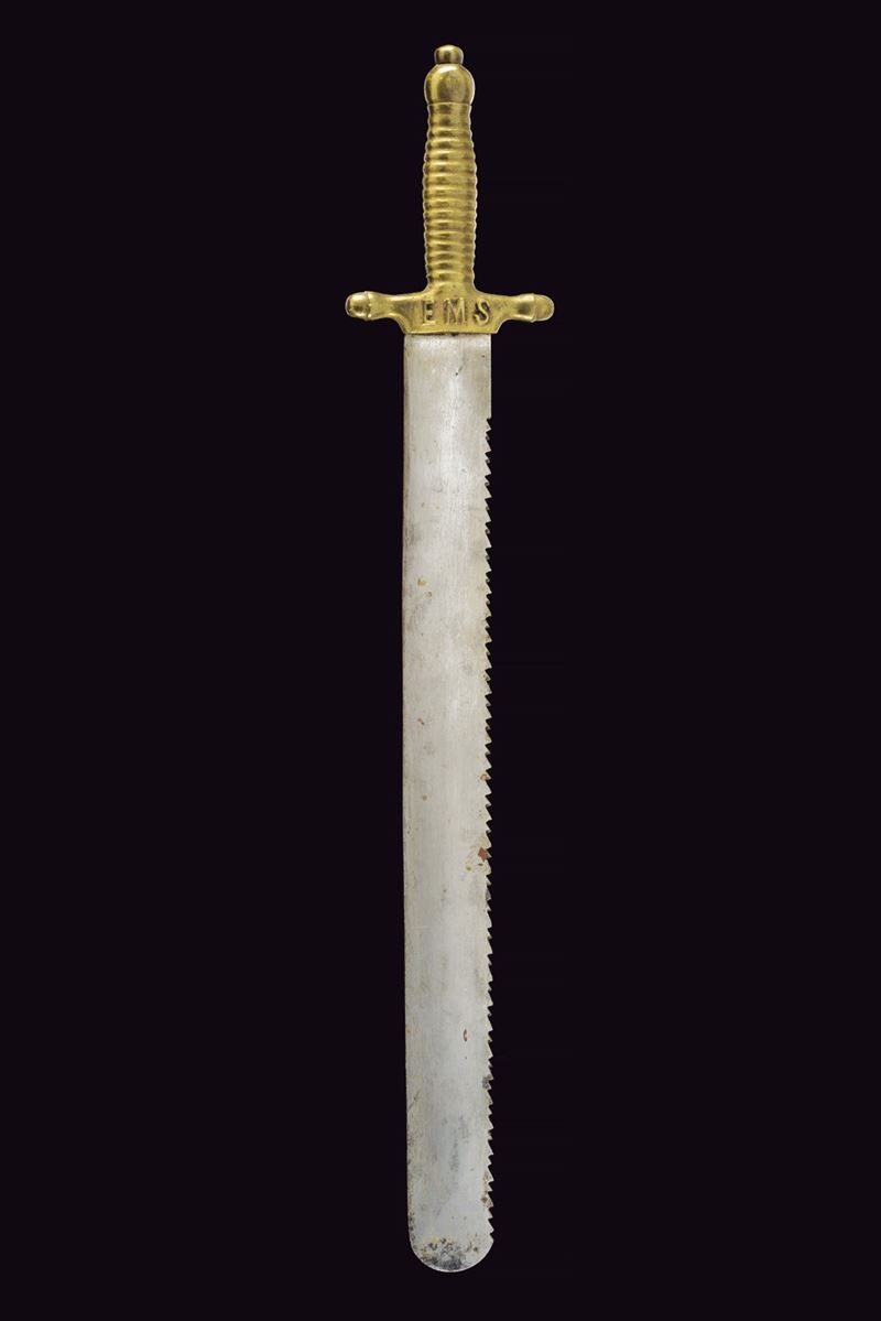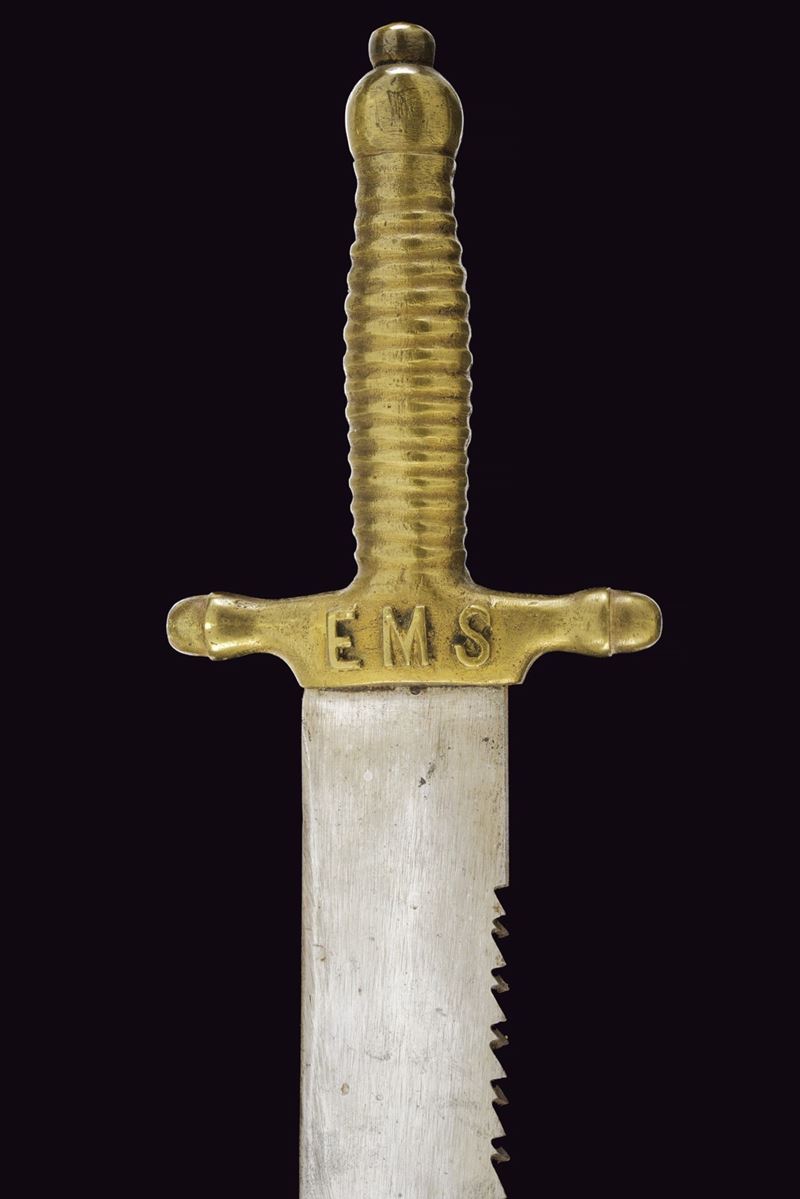 Ampia lama dritta con punta arrotondata e dorso a doppia fila di denti. Elso e impugnatura in un unico pezzo, in ottone. Il massello marcato "EMS" in rilievo. Tracce di un punzone alla base della lama. Qualche segno d'uso e del tempo. Mancante del fodero.