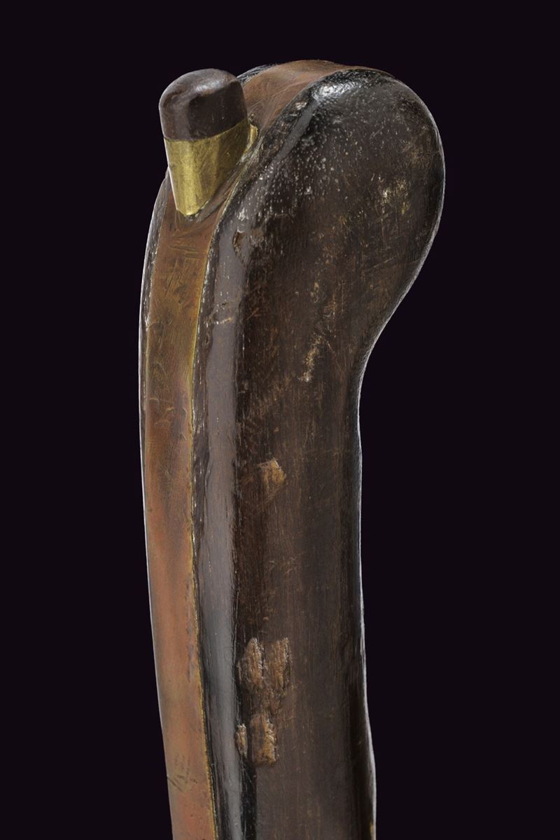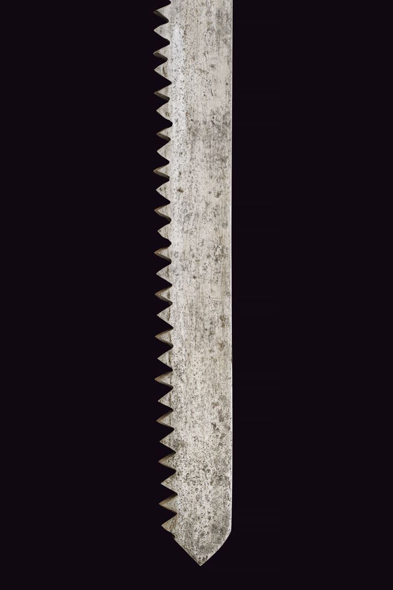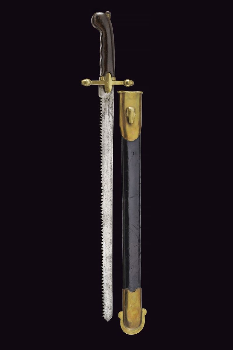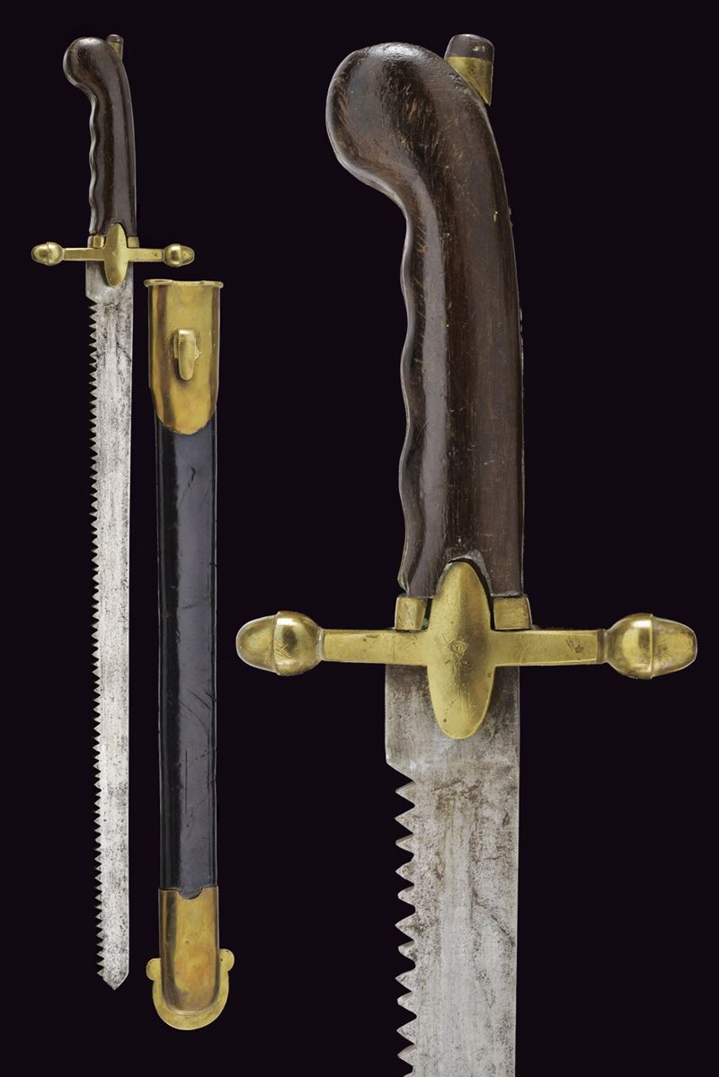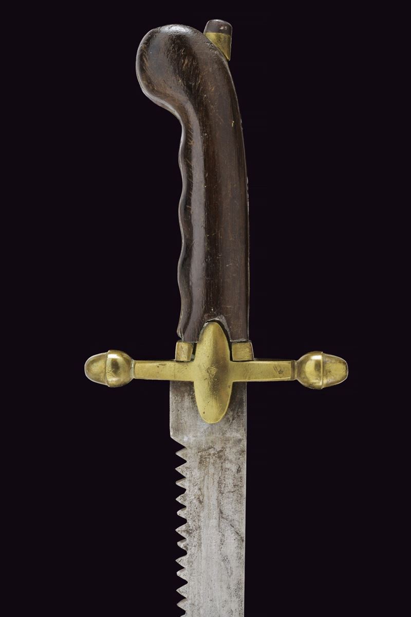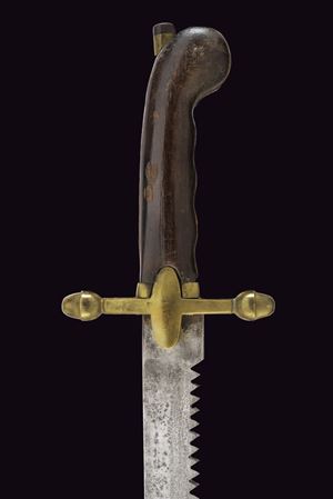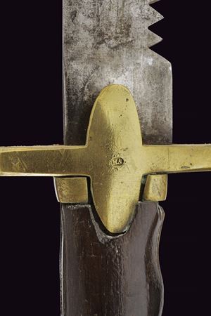 Lama dritta con dorso a singola fila di denti, tallone senza marchi. Fornimento in ottone con alette fermafodero, punzonato "MA", bracci dritti con testa a ghianda. Impugnatura con banda centrale in rame e guancette in legno. Fodero in cuoio probabilmente vecchio, con fornimenti in ottone. Segni d'uso e del tempo, piccoli difetti. Non comune.