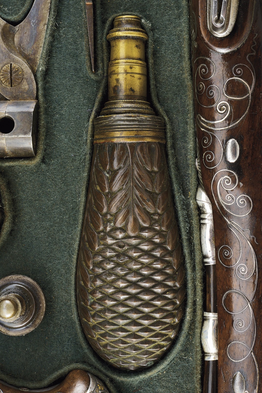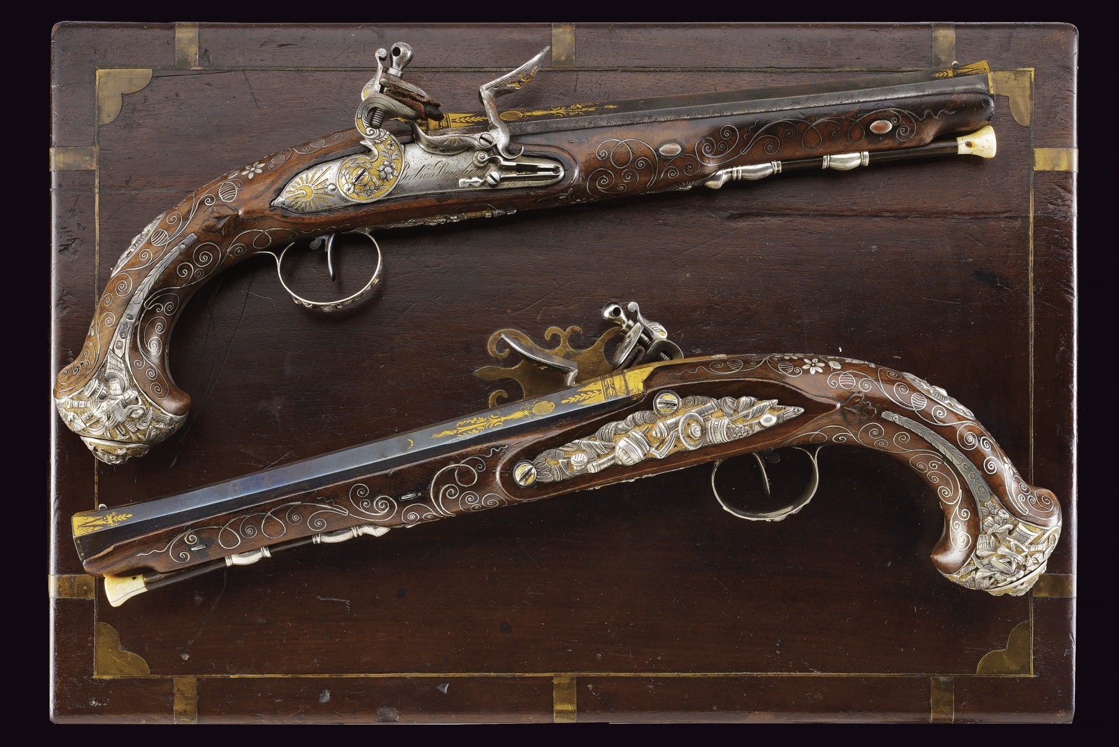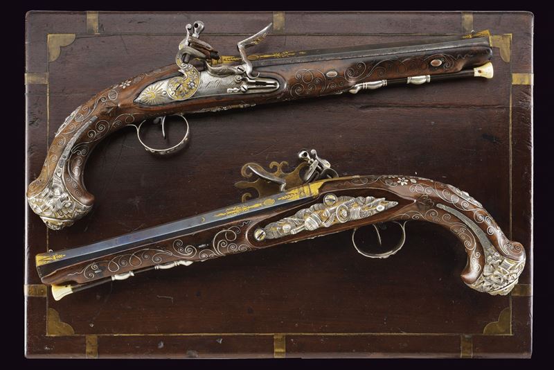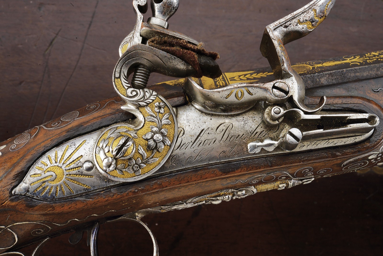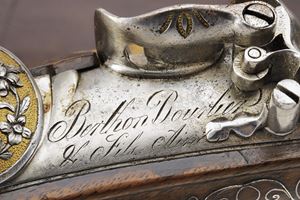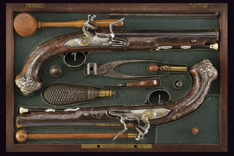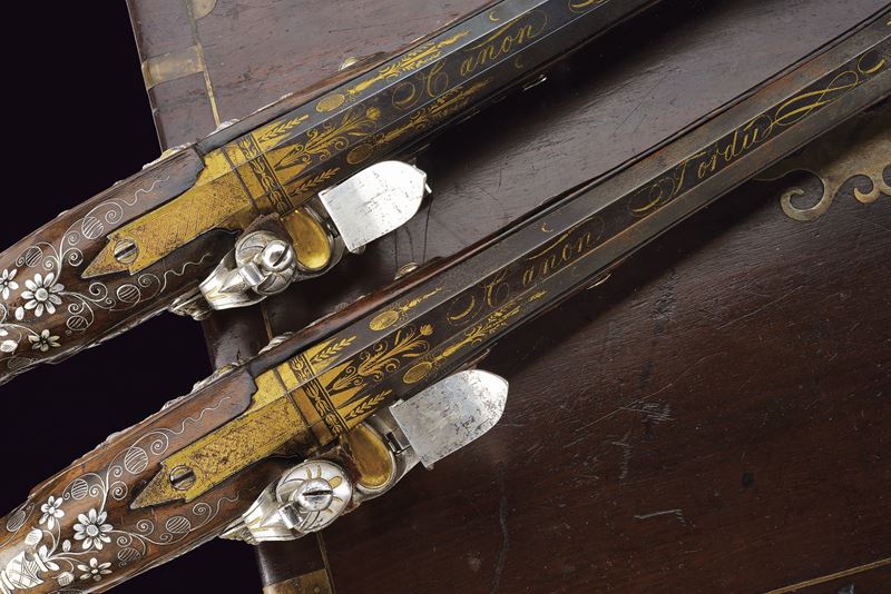 Canne lisce ottagonali, brunite, marcate "Canon Tordu" ageminate in oro a motivi floreali in Stile Impero e con due mezzelune. Il segmento centrale delle canne più snello, le volate decorate in oro a motivi geometrici e floreali. Mirini in argento, cal. 17 mm in volata. Sul lato inferiore marcatura "PLAN / CHET". Codette incise a motivi geometrici e completamente dorate. Batterie a pietra focaia a cartella tondeggiante, firmate al centro "Berthon Bourlier et Fils Aîné" e marcate sotto alla molla della martellina "a St. Etienne"; le code con falce di luna fra raggi (tutto il fregio ageminato in oro). Bellissimi cani finemente intagliati a motivi floreali in rilievo su fondo granulato e dorato; gli scodellìni a tenuta stagna, dorati e traforati; le martelline incise, dorate e munite di rotellina antifrizione. Casse intere in legno lievemente scolpite, riccamente decorate con eleganti tarsie a volute floreali su tutta la lunghezza. I fornimenti in argento massiccio, riccamente decorati in rilievo a trofei e con varie mezzelune, in parte dorate. Sia ponticelli che le cocce con quattro punzoni: un gallo, il timbro "CC", un segugio con cifra "12" e un volto all'antica. Bacchette in corno con battipalla in osso e cavastracci in ferro. Nella loro cassetta originale in legno (piccoli difetti) con fornimenti in ottone, foderata all'interno di panno verde e munita di tutti gli accessori, inclusa la chiave.