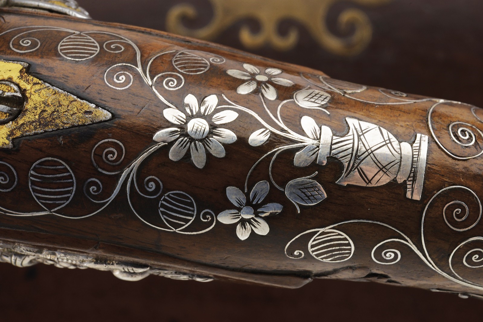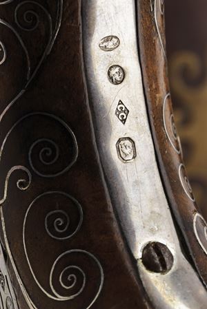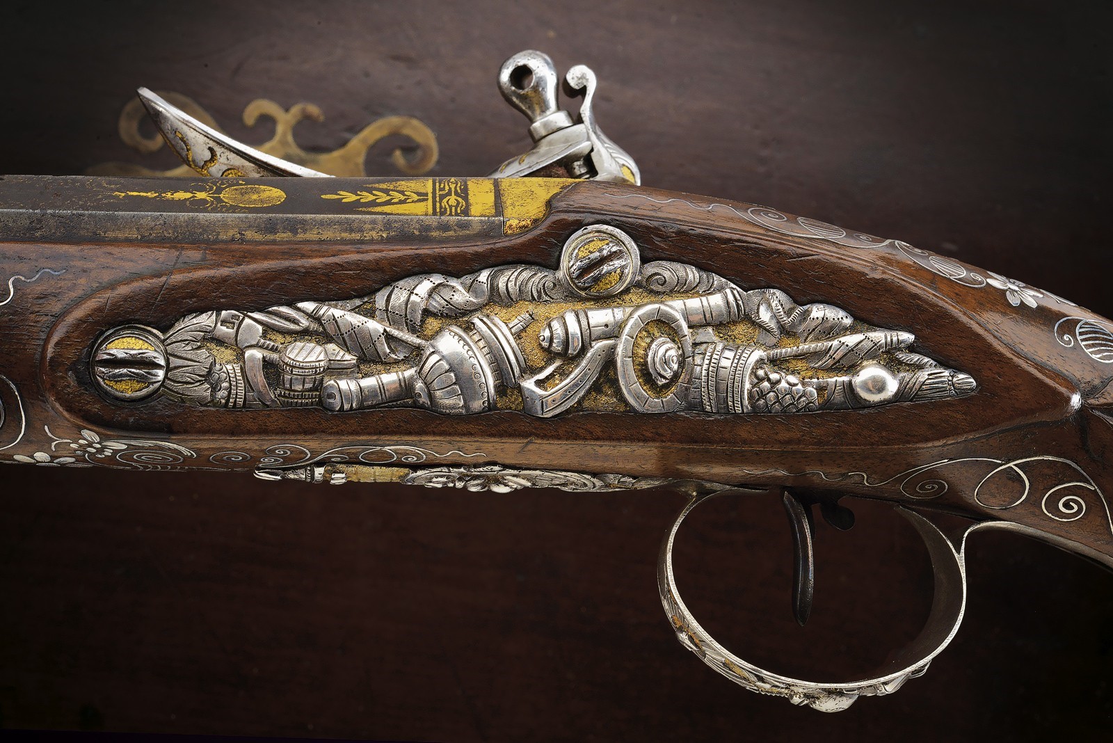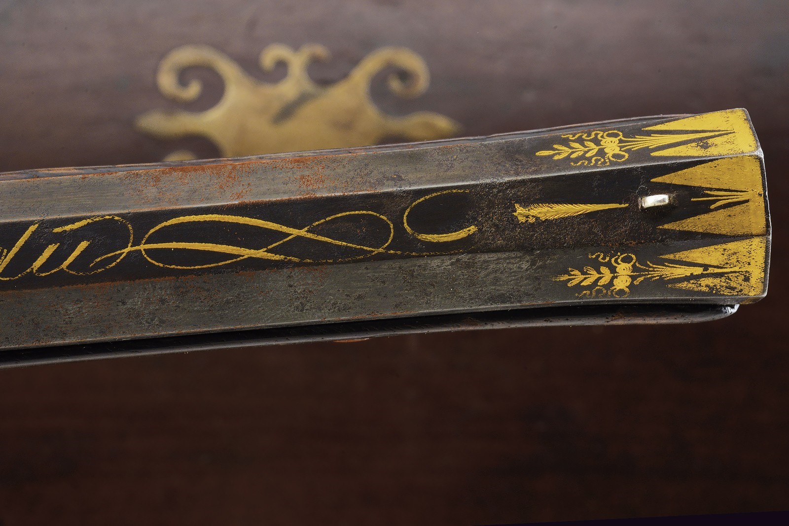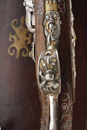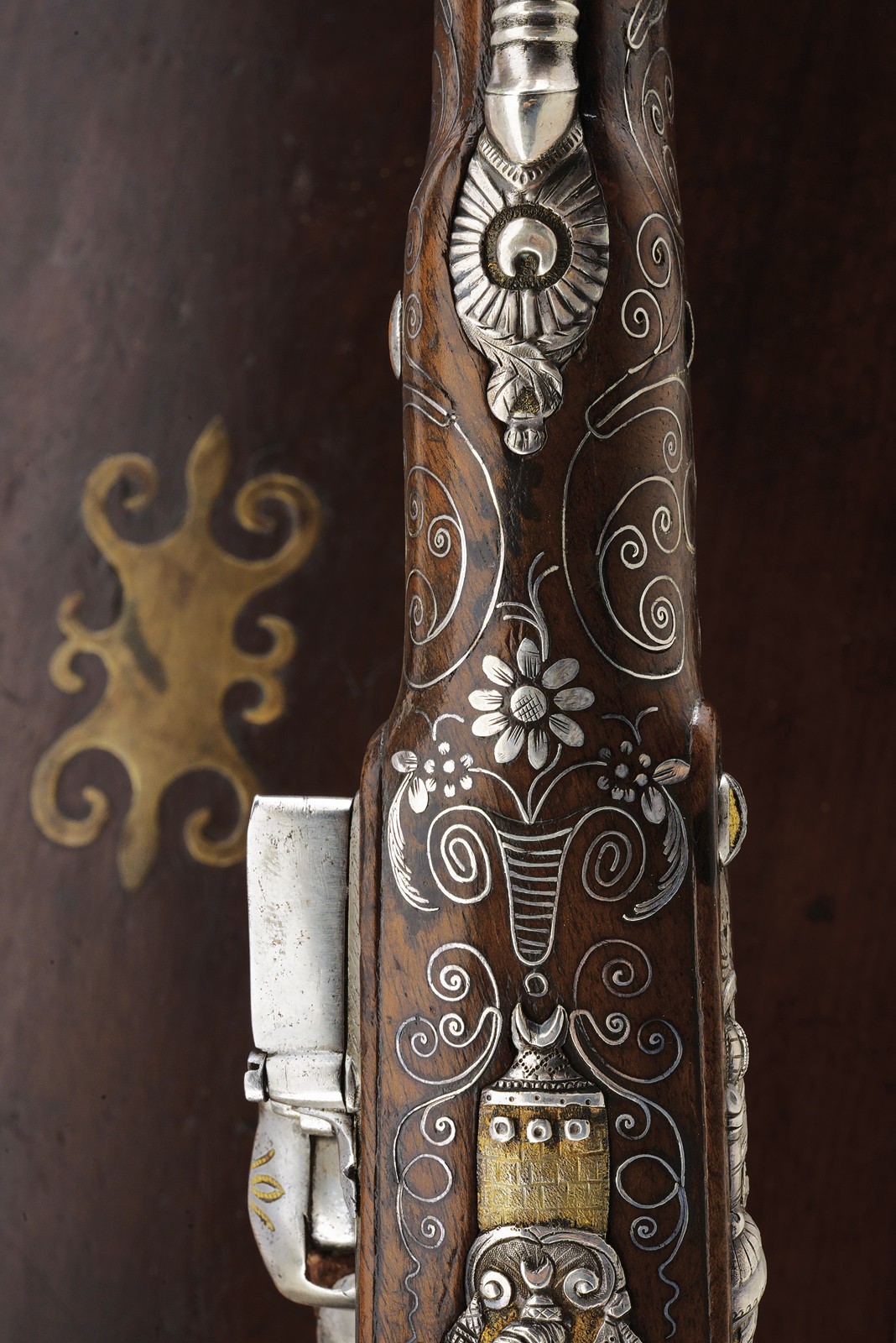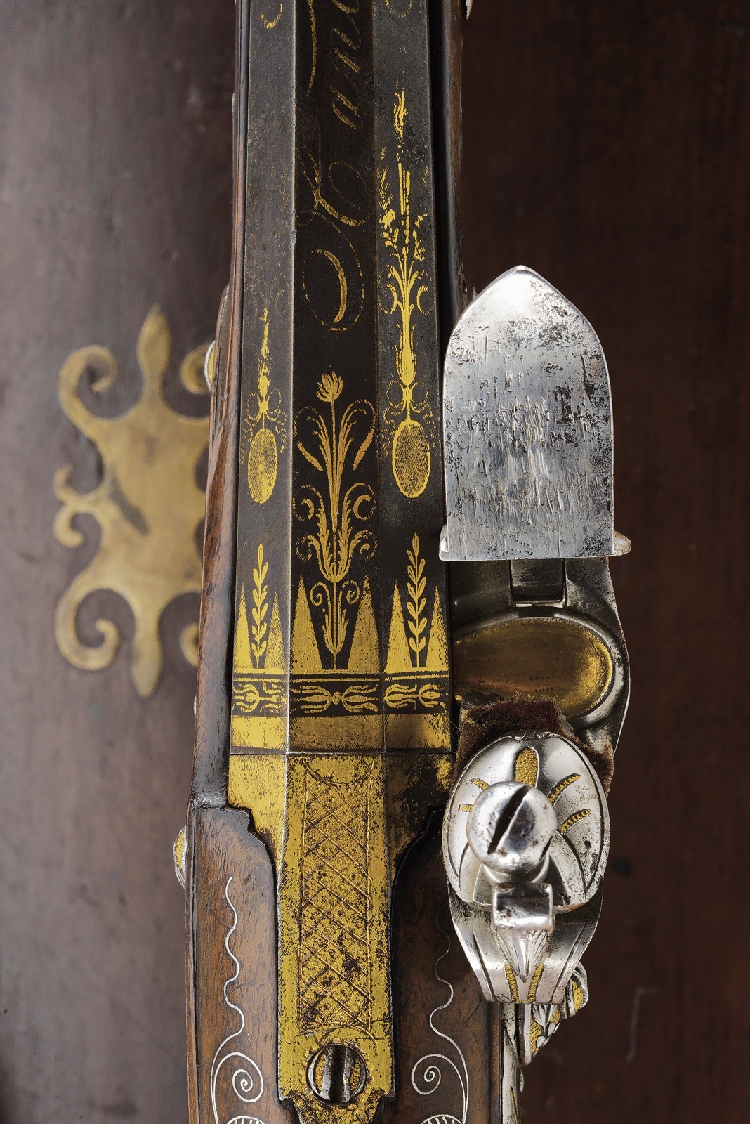 Canne lisce ottagonali, brunite, marcate "Canon Tordu" ageminate in oro a motivi floreali in Stile Impero e con due mezzelune. Il segmento centrale delle canne più snello, le volate decorate in oro a motivi geometrici e floreali. Mirini in argento, cal. 17 mm in volata. Sul lato inferiore marcatura "PLAN / CHET". Codette incise a motivi geometrici e completamente dorate. Batterie a pietra focaia a cartella tondeggiante, firmate al centro "Berthon Bourlier et Fils Aîné" e marcate sotto alla molla della martellina "a St. Etienne"; le code con falce di luna fra raggi (tutto il fregio ageminato in oro). Bellissimi cani finemente intagliati a motivi floreali in rilievo su fondo granulato e dorato; gli scodellìni a tenuta stagna, dorati e traforati; le martelline incise, dorate e munite di rotellina antifrizione. Casse intere in legno lievemente scolpite, riccamente decorate con eleganti tarsie a volute floreali su tutta la lunghezza. I fornimenti in argento massiccio, riccamente decorati in rilievo a trofei e con varie mezzelune, in parte dorate. Sia ponticelli che le cocce con quattro punzoni: un gallo, il timbro "CC", un segugio con cifra "12" e un volto all'antica. Bacchette in corno con battipalla in osso e cavastracci in ferro. Nella loro cassetta originale in legno (piccoli difetti) con fornimenti in ottone, foderata all'interno di panno verde e munita di tutti gli accessori, inclusa la chiave.