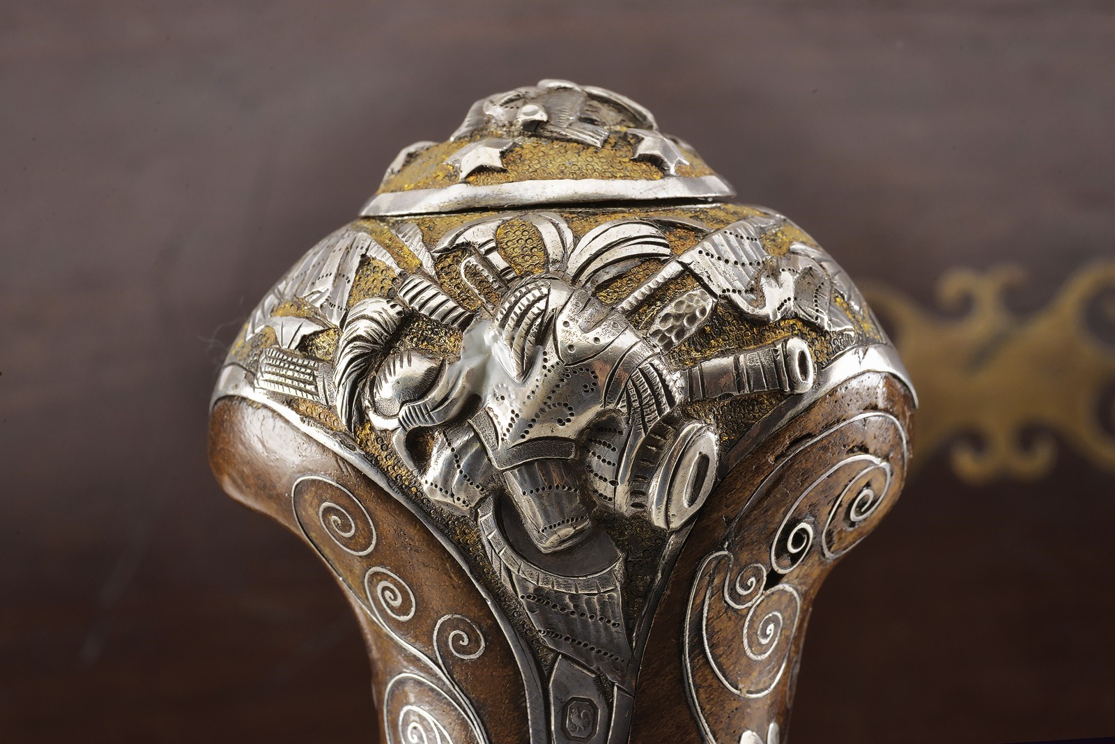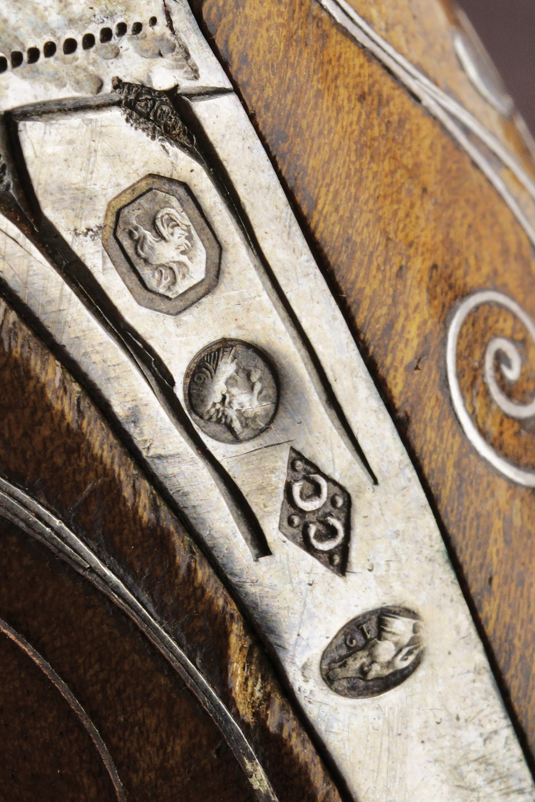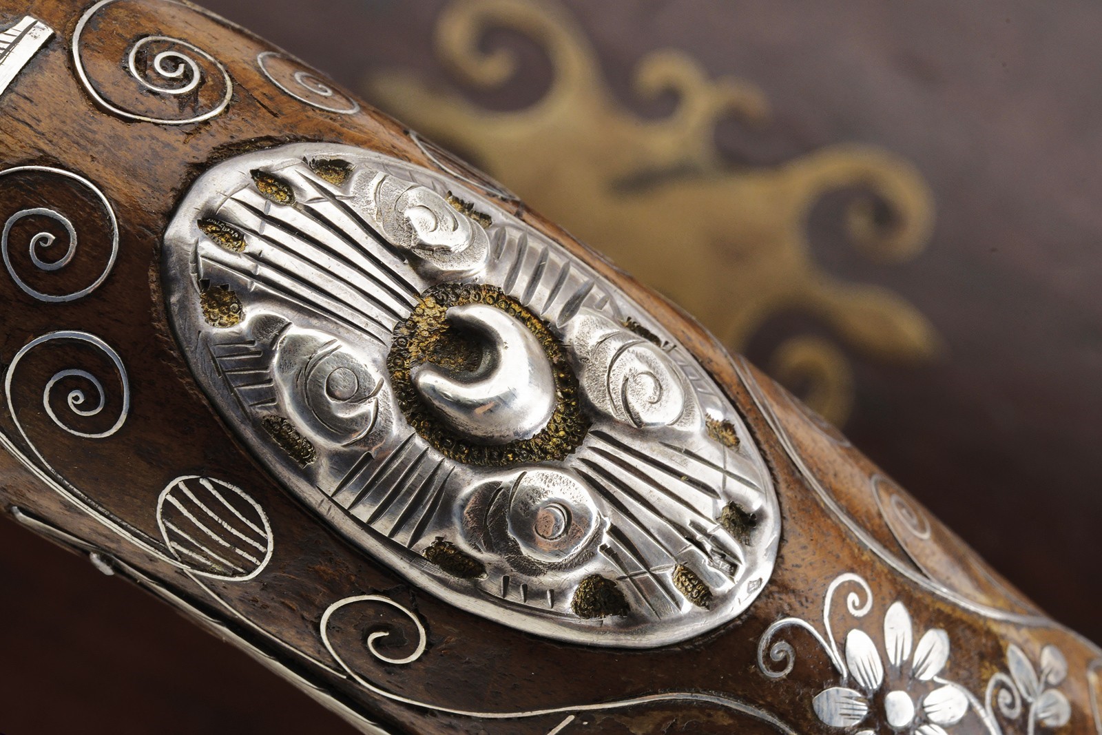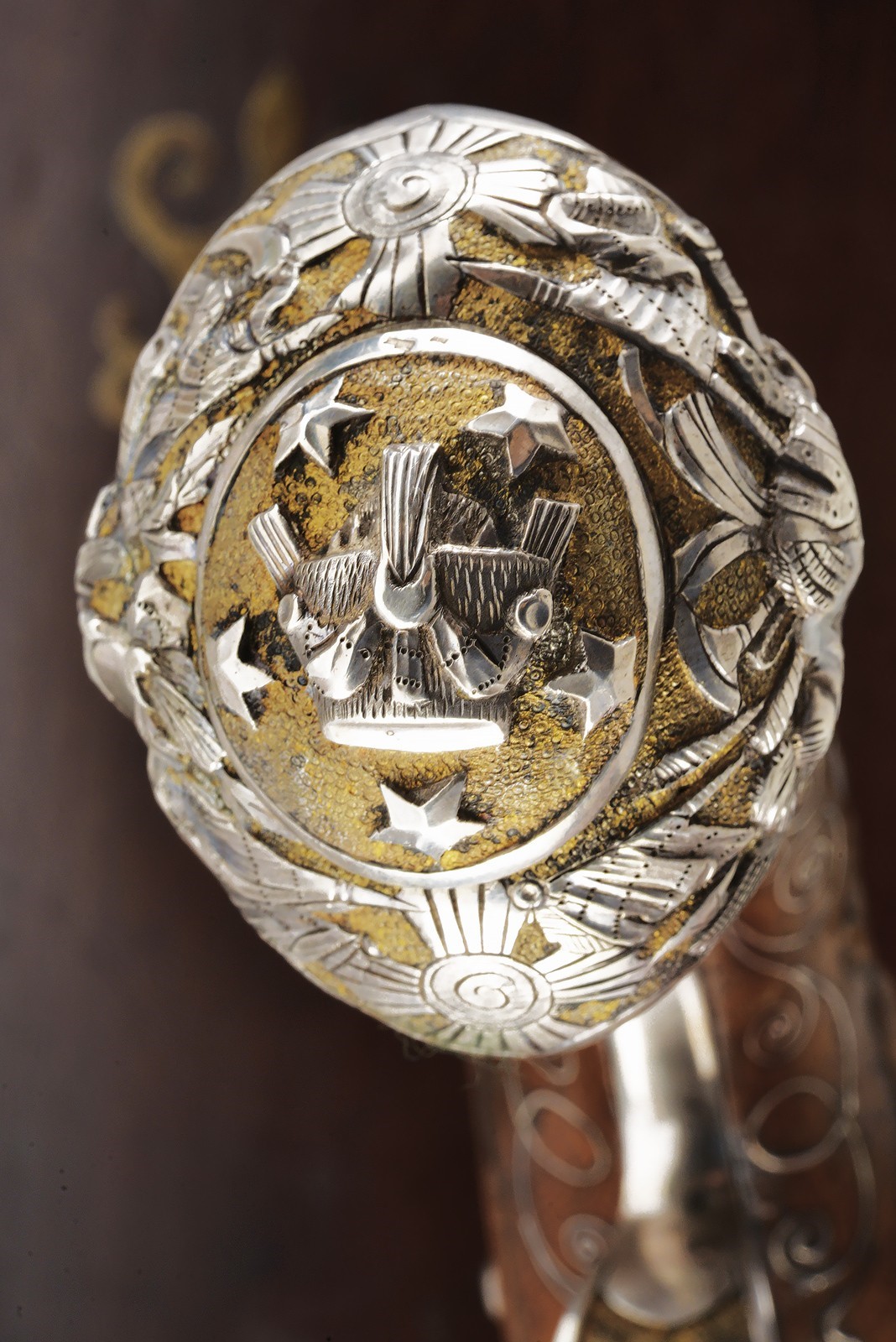 Canne lisce ottagonali, brunite, marcate "Canon Tordu" ageminate in oro a motivi floreali in Stile Impero e con due mezzelune. Il segmento centrale delle canne più snello, le volate decorate in oro a motivi geometrici e floreali. Mirini in argento, cal. 17 mm in volata. Sul lato inferiore marcatura "PLAN / CHET". Codette incise a motivi geometrici e completamente dorate. Batterie a pietra focaia a cartella tondeggiante, firmate al centro "Berthon Bourlier et Fils Aîné" e marcate sotto alla molla della martellina "a St. Etienne"; le code con falce di luna fra raggi (tutto il fregio ageminato in oro). Bellissimi cani finemente intagliati a motivi floreali in rilievo su fondo granulato e dorato; gli scodellìni a tenuta stagna, dorati e traforati; le martelline incise, dorate e munite di rotellina antifrizione. Casse intere in legno lievemente scolpite, riccamente decorate con eleganti tarsie a volute floreali su tutta la lunghezza. I fornimenti in argento massiccio, riccamente decorati in rilievo a trofei e con varie mezzelune, in parte dorate. Sia ponticelli che le cocce con quattro punzoni: un gallo, il timbro "CC", un segugio con cifra "12" e un volto all'antica. Bacchette in corno con battipalla in osso e cavastracci in ferro. Nella loro cassetta originale in legno (piccoli difetti) con fornimenti in ottone, foderata all'interno di panno verde e munita di tutti gli accessori, inclusa la chiave.