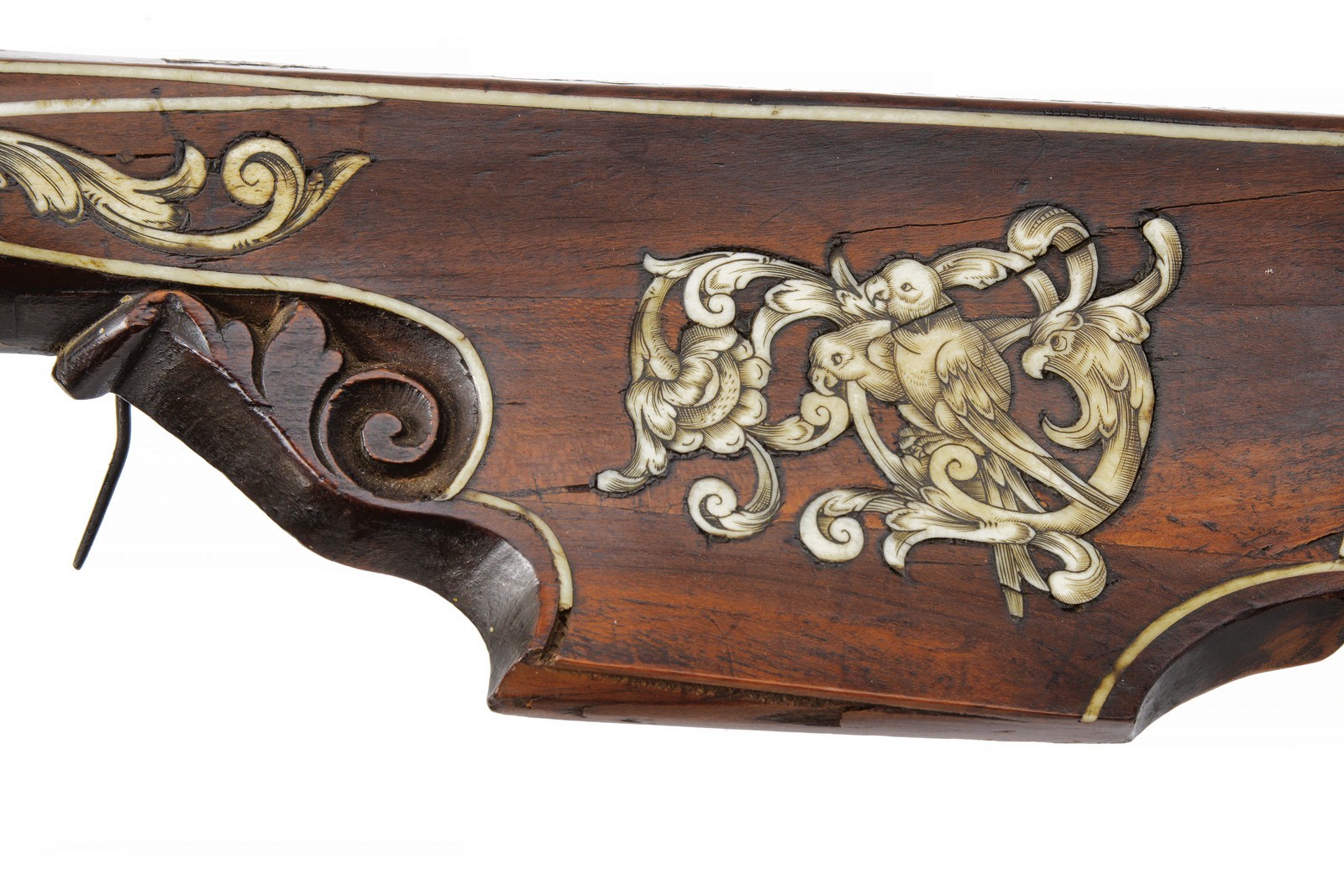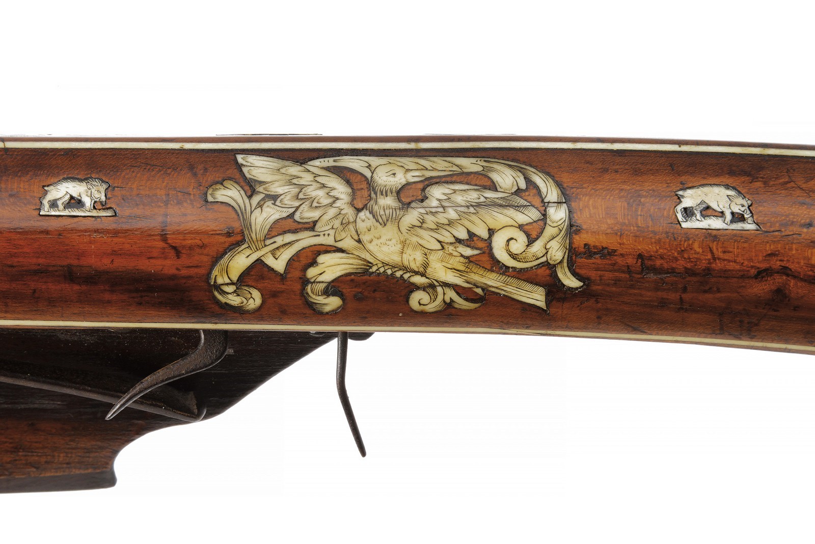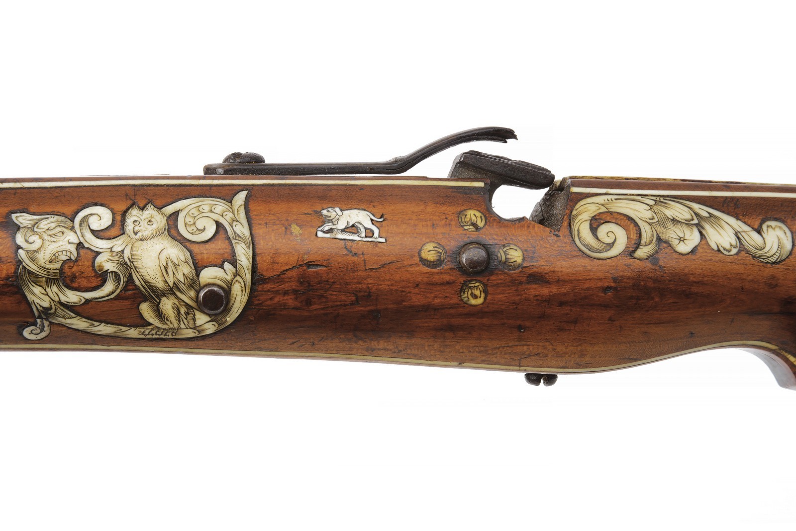 Snello arco in ferro recante, a destra nella parte concava, un marchio a ruota in rilievo circondato da una corona di raggi. Completo di cordatura antica in canapa e con cordino in tessuto bicolore con resti di nappe decorative in lana. Teniere in legno di albero da frutto, di forma slanciata, ornato con tarsie in corno sbiancato, incise e sagomate, effigianti fiorami, pappagalli e un gufo, oltre a vari altri piccoli fregi. Il canale di scorrimento del quadrello foderato con una piastra, sempre in corno sbiancato, incisa a fiorami e recante all’estremità anteriore le iniziali del fabbricante "GE" (Georg Escher). Munita di uno scasso nel quale era probabilmente inserita la briglia di supporto del dardo. Ancora presente parte della guaina di ritenzione del dardo al dorso della noce. La noce in ferro, dotata di un placca dorsale con mascherone ben modellato in bassorilievo. Meccanica con grilletto e stecher apparentemente funzionanti, il gruppo di scatto montato su una piastra di ferro recante tracce di doratura e incassata nel legno. Design privo di guardia protettiva per il grilletto ma munito di una barra incurvata sul retro. Tracce di doratura anche alla staffa anteriore. Minime mancanze, segni d’uso e del tempo. Probabilmente un lavoro su committenza o un dono destinato alla corte bavarese.
