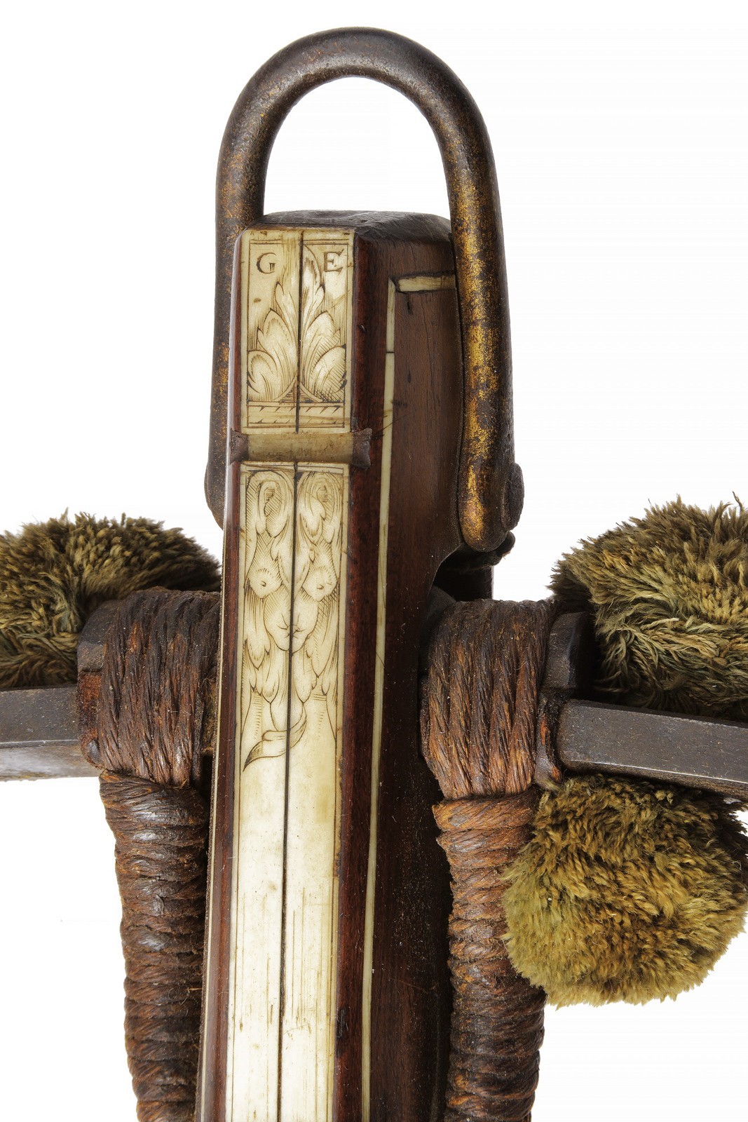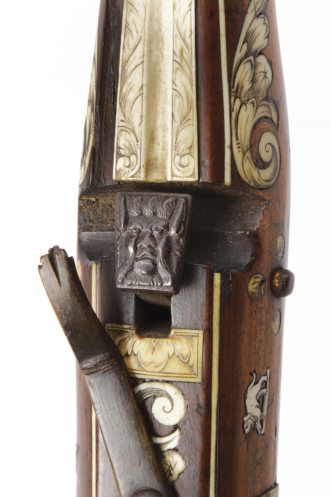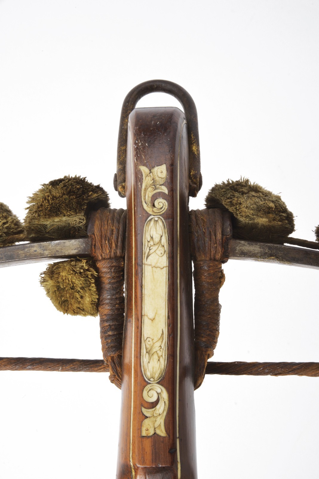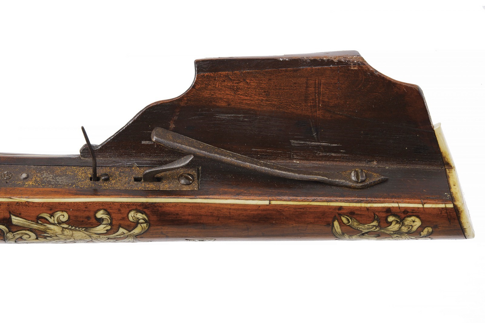 Snello arco in ferro recante, a destra nella parte concava, un marchio a ruota in rilievo circondato da una corona di raggi. Completo di cordatura antica in canapa e con cordino in tessuto bicolore con resti di nappe decorative in lana. Teniere in legno di albero da frutto, di forma slanciata, ornato con tarsie in corno sbiancato, incise e sagomate, effigianti fiorami, pappagalli e un gufo, oltre a vari altri piccoli fregi. Il canale di scorrimento del quadrello foderato con una piastra, sempre in corno sbiancato, incisa a fiorami e recante all’estremità anteriore le iniziali del fabbricante "GE" (Georg Escher). Munita di uno scasso nel quale era probabilmente inserita la briglia di supporto del dardo. Ancora presente parte della guaina di ritenzione del dardo al dorso della noce. La noce in ferro, dotata di un placca dorsale con mascherone ben modellato in bassorilievo. Meccanica con grilletto e stecher apparentemente funzionanti, il gruppo di scatto montato su una piastra di ferro recante tracce di doratura e incassata nel legno. Design privo di guardia protettiva per il grilletto ma munito di una barra incurvata sul retro. Tracce di doratura anche alla staffa anteriore. Minime mancanze, segni d’uso e del tempo. Probabilmente un lavoro su committenza o un dono destinato alla corte bavarese.