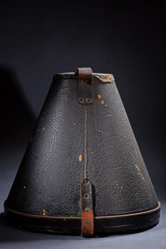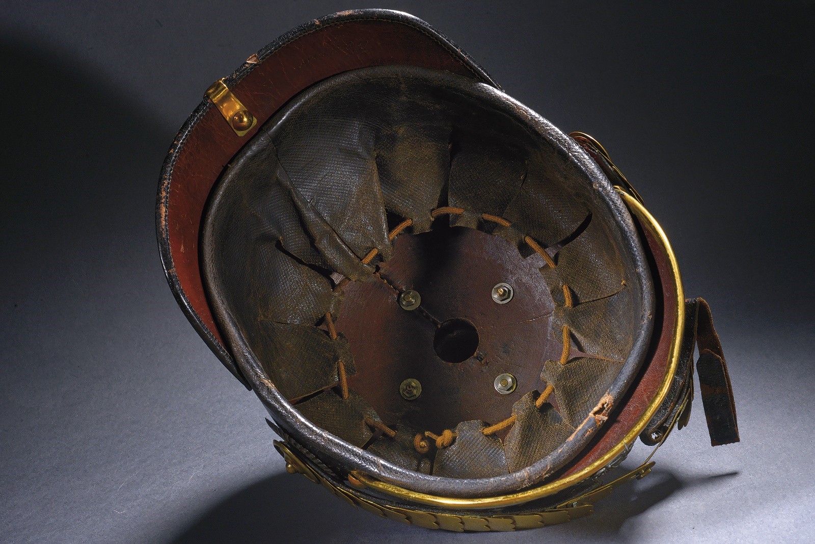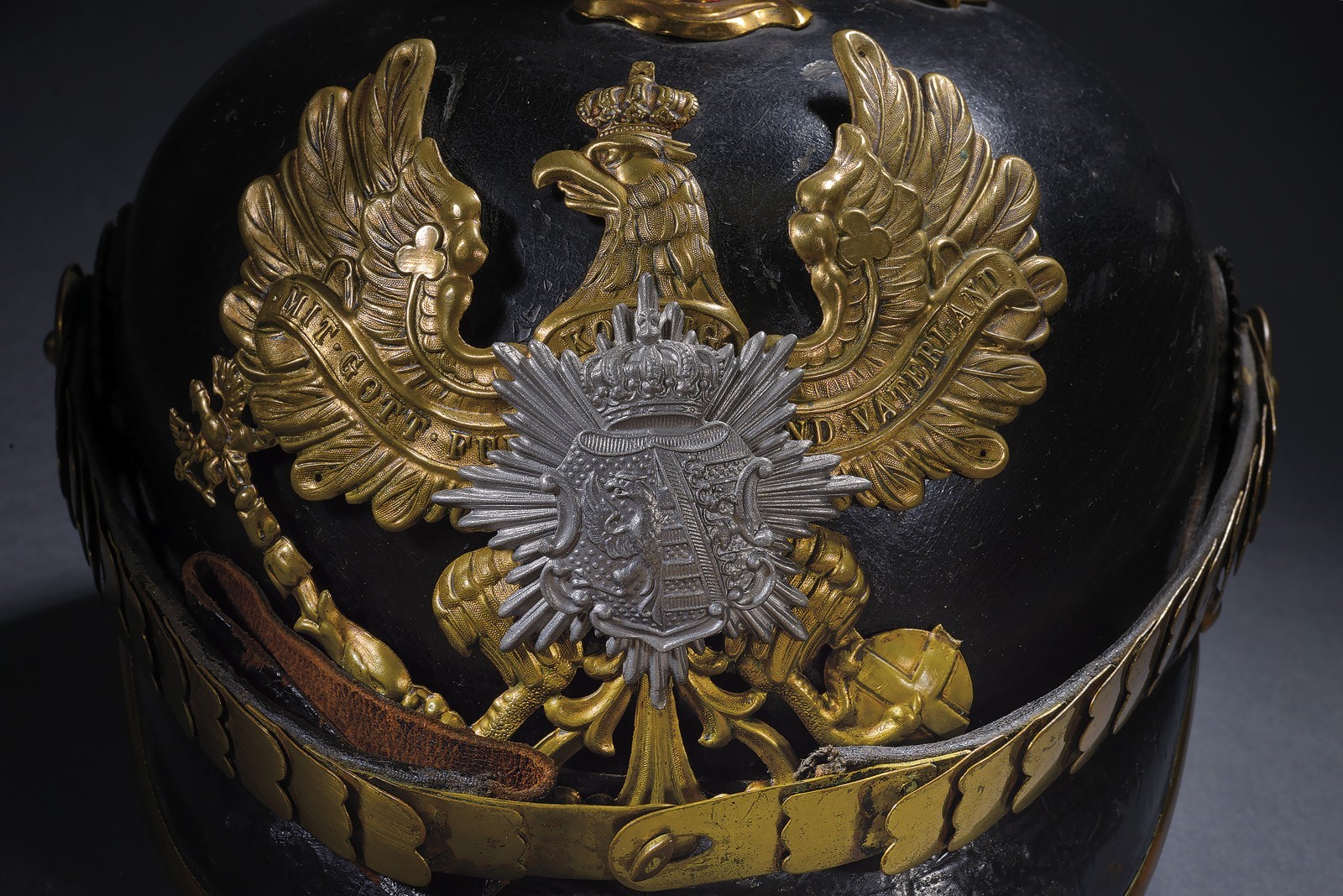 Coppo, visiera tonda e gronda in cuoio. Fregio con aquila di linea in ottone caricato da stemma del Sassonia-Anhalt (copia moderna); basso puntale liscio su base a croce. Soggoli con squame piatte con coccarda Prussiana e del Reich. All'interno cuffia in pelle da truppa e un'etichetta "OSANG" e un'ulteriore etichetta con nome "E. MIÜLLER II". Doppi fori all'interno. Completo di scatola.