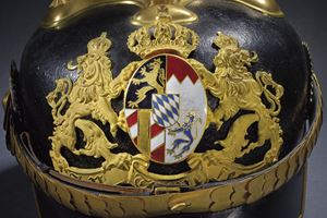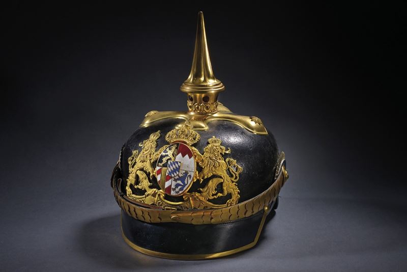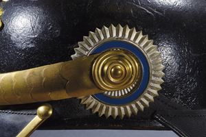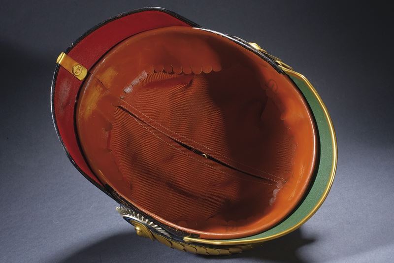 Coppo con visiera angolata e gronda annerite. Fornimenti color oro. Fregio frontale da generale, parzialmente traforato e con stemma smaltato (di restauro?) in policromia al centro. Puntale scanalato su base a croce con rivetti a stella. Soggoli con squame convesse, presenti entrambe le coccarde. L'interno con alluda in pelle e cuffia in seta color mattone. Raro.